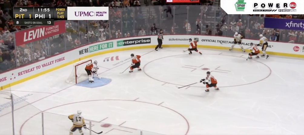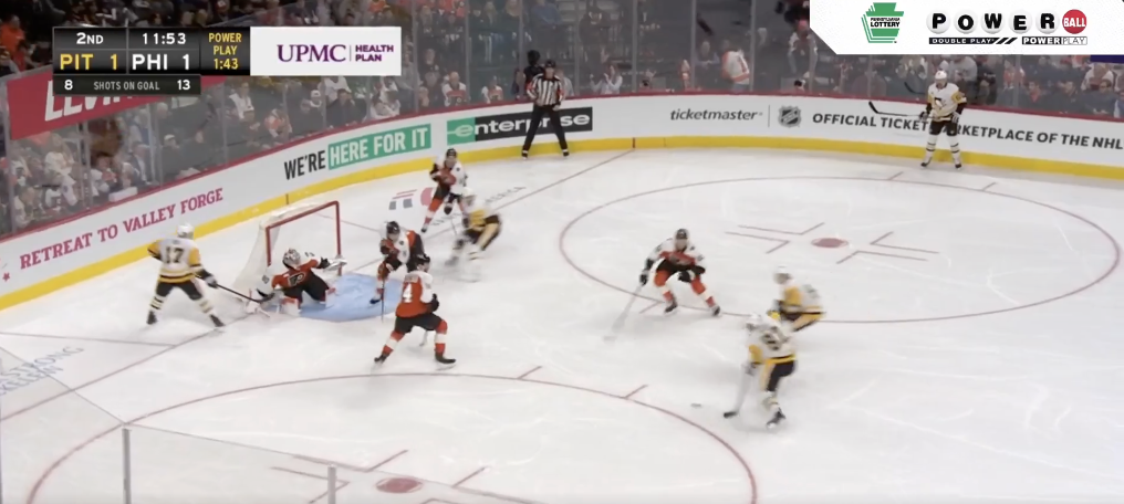 Bryan Rust (No. 17 and bottom of the screen) has plenty of room to either shoot or pass the puck, choosing the latter as the Flyers overcommitted.Sidney Crosby (No. 87 and middle of the screen) received the pass from Bryan Rust in the high slot and was able to score as the Flyers collapsed around the net.