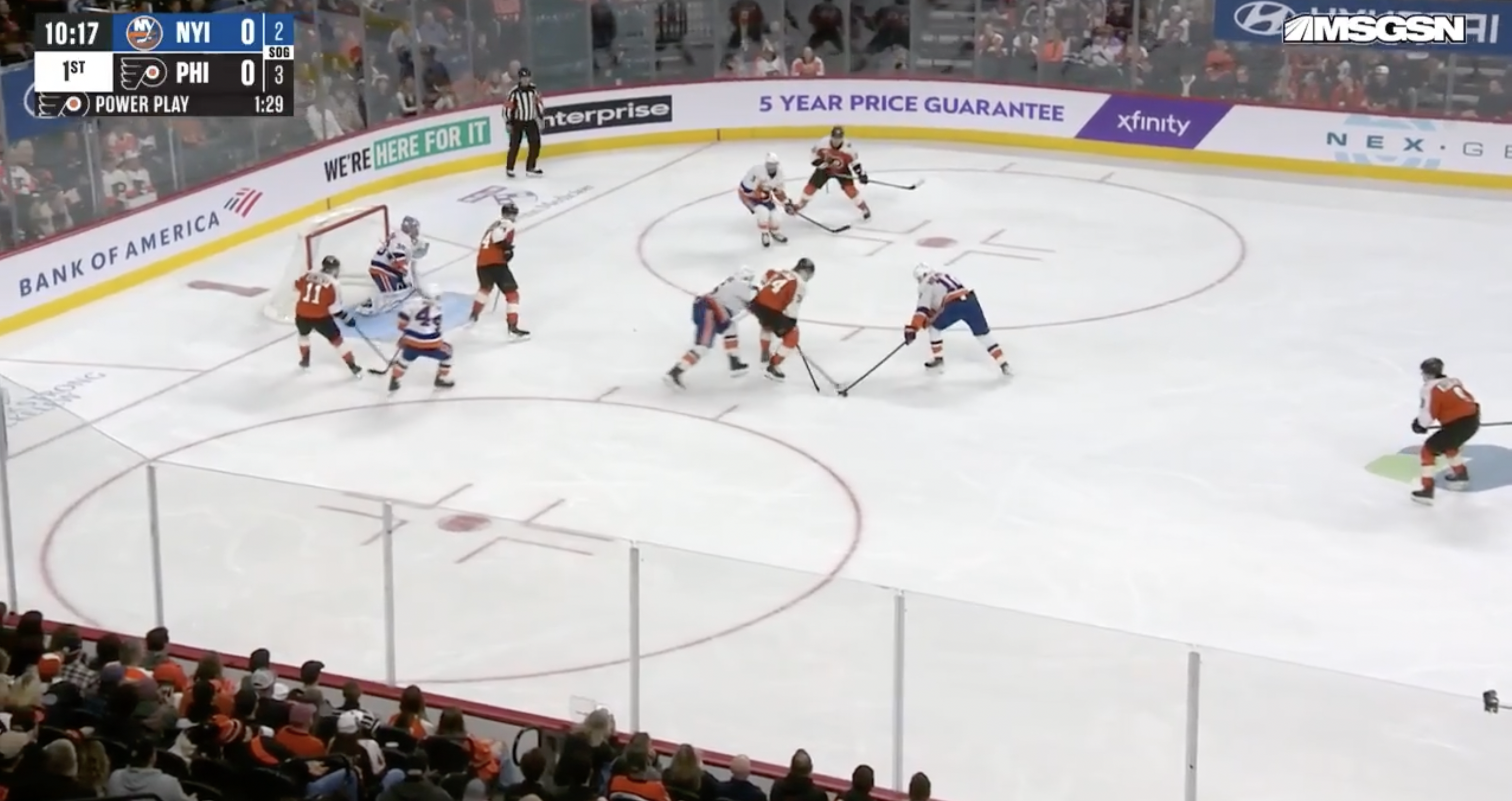 Matvei Michkov (stick raised in the right face-off circle) did have an open lane, but a small delay in his delivery to Owen Tippett — and thus giving away his plan — saw the lane close quickly.The lane closed as New York Islanders forwards Simon Holmström and Jean-Gabriel Pageau were able to check Tippett and create a turnover.