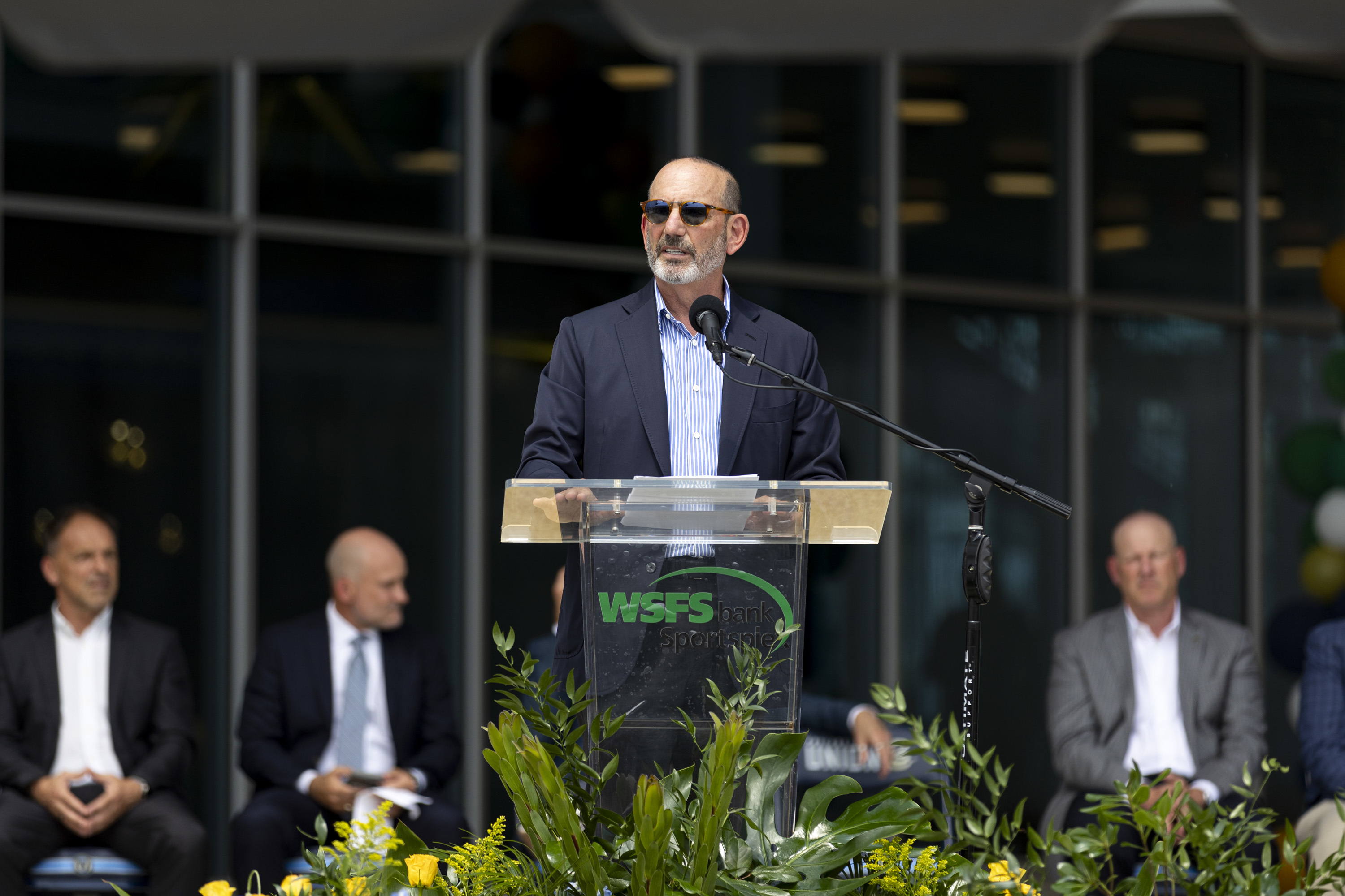 Don Garber, Major League Soccer Commissioner, speaks at the WSFS Bank Sportsplex Ceremony in Chester, Pa., on Thursday, July 17, 2025.
