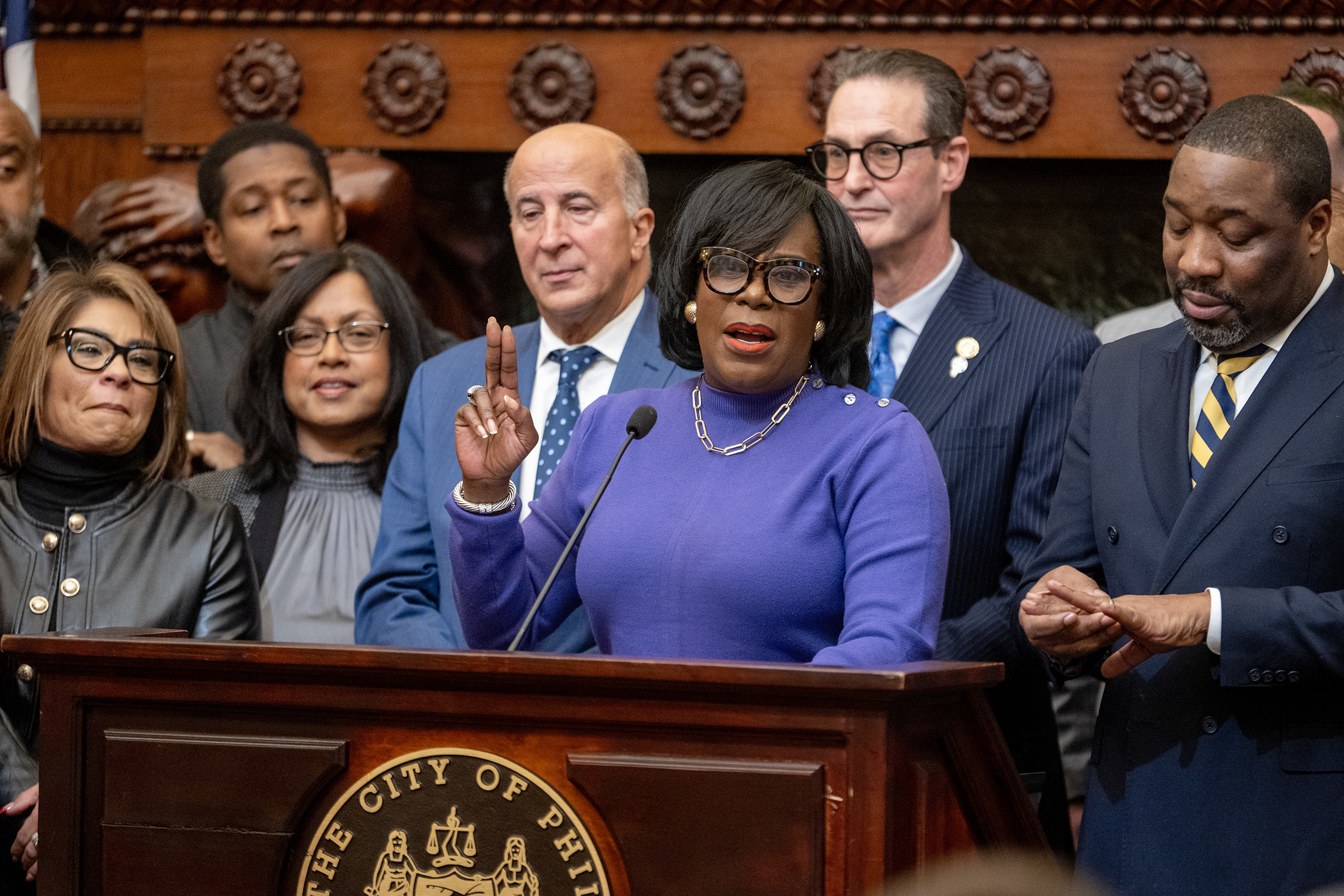 Mayor Cherelle L. Parker is with City Council President Kenyatta Johnson (far right) and supportive Council members in the Mayor’s Reception Room at City Hall Thursday, Dec. 19, 2024 after Council gave final approval to the Sixers arena.