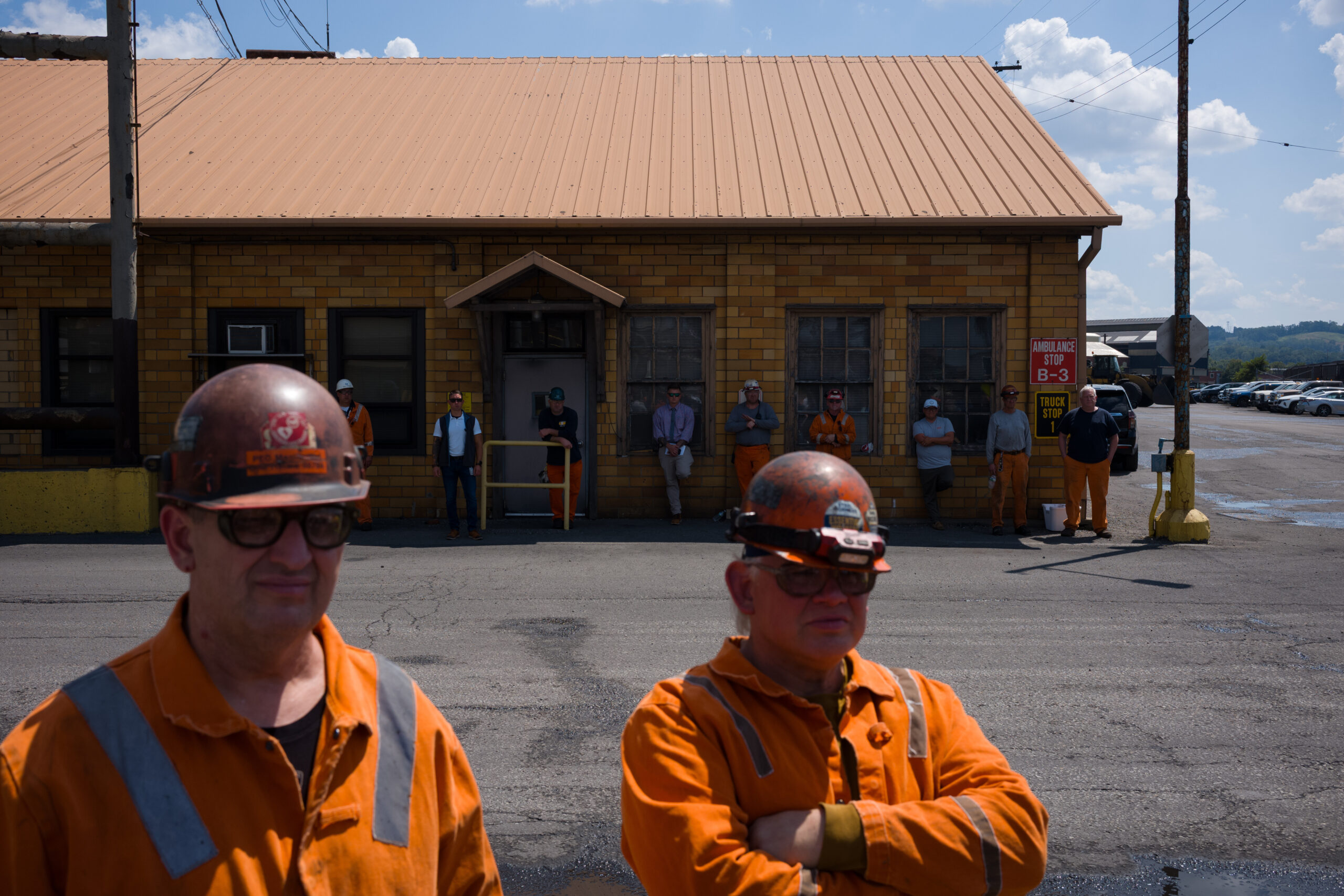 Steelworkers stand at U.S. Steel’s Clairton Coke Works in Clairton, Pa., on Aug. 12, 2025, a day after an explosion at the facility killed two workers. (Quinn Glabicki/Pittsburgh’s Public Source via AP)