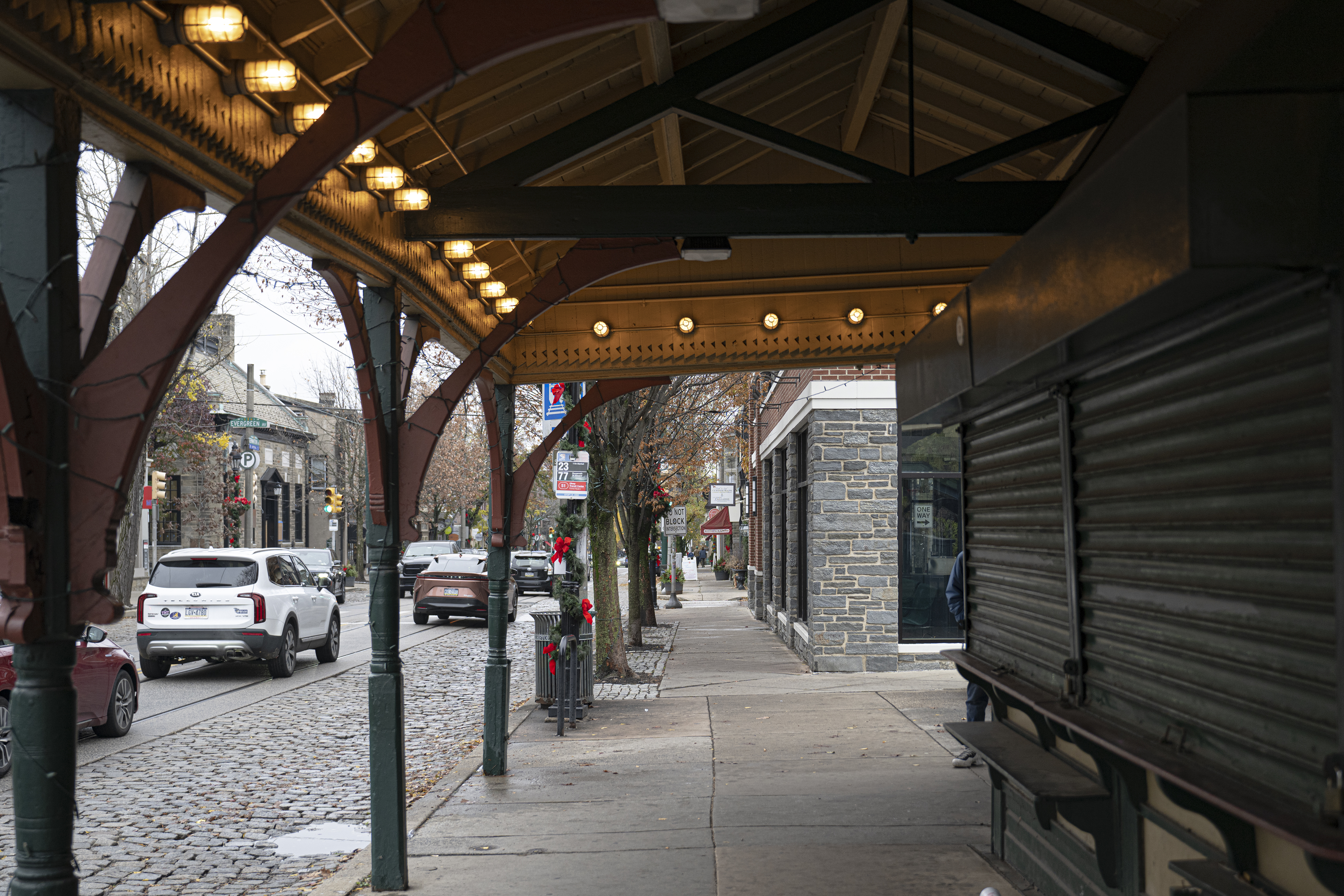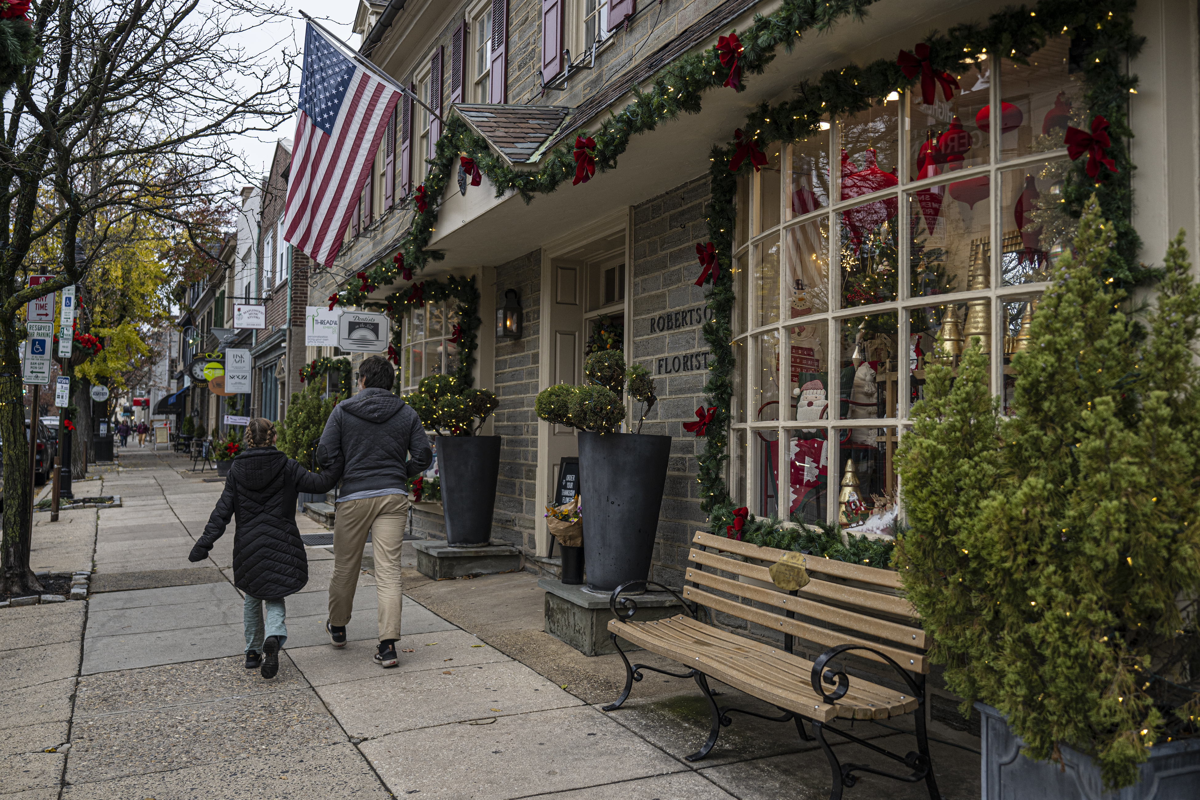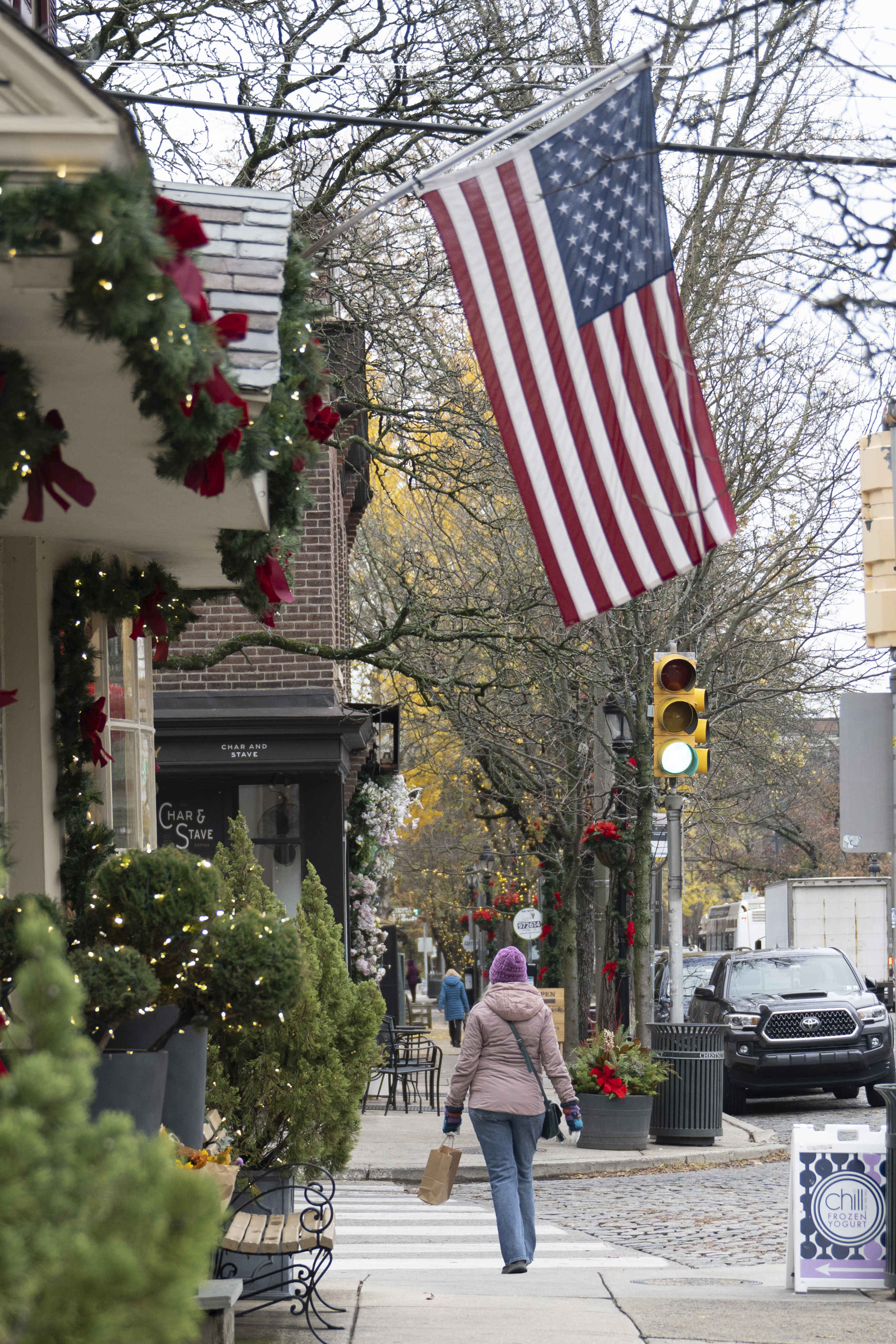 Businesses along Germantown Avenue in Chestnut Hill are decorated for the holidays.