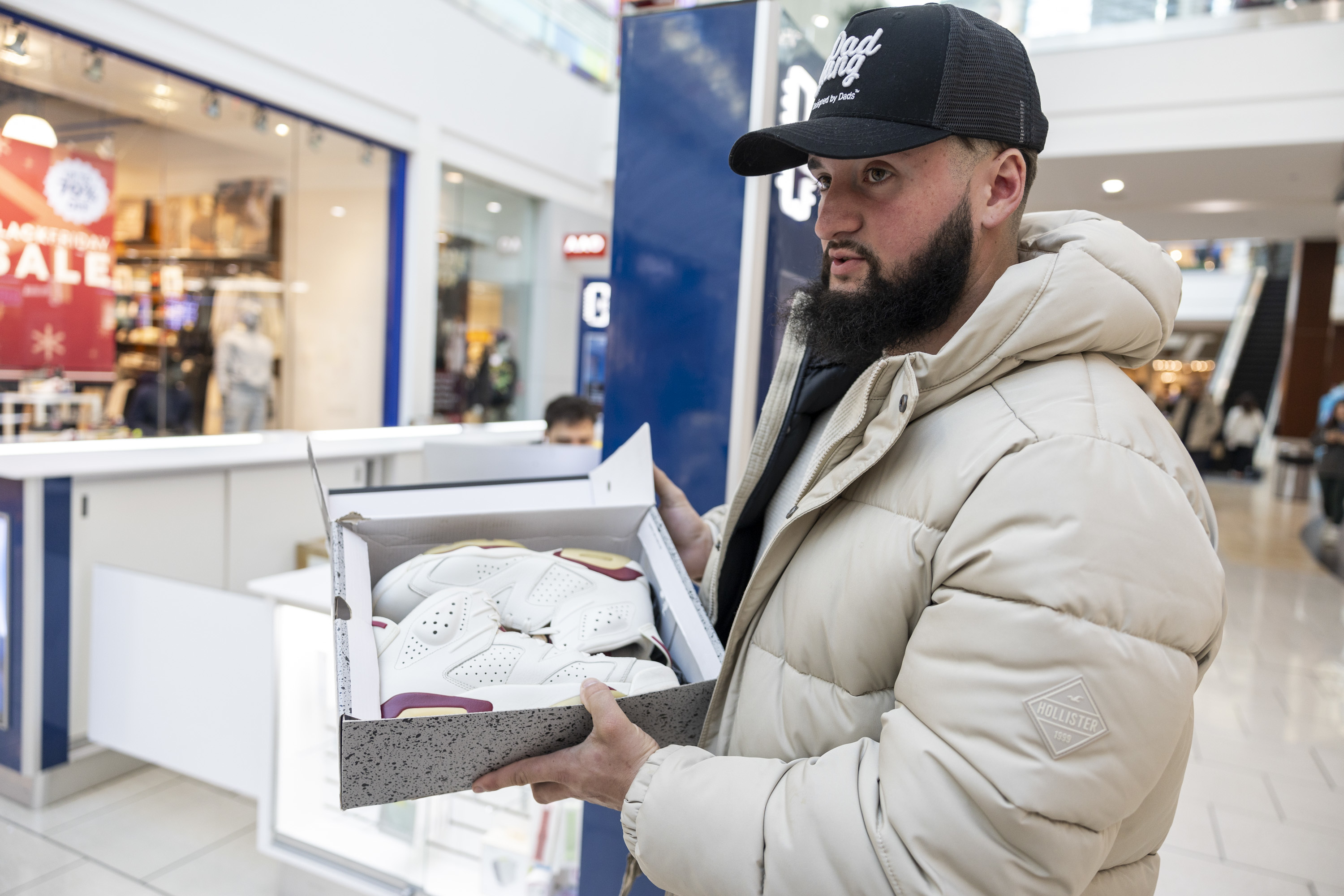 Daniel Leslie, 23, of Franklinville, N.J., showing off a pair of Maroon Jordan 6’s he bought on Black Friday at the Cherry Hill Mall.