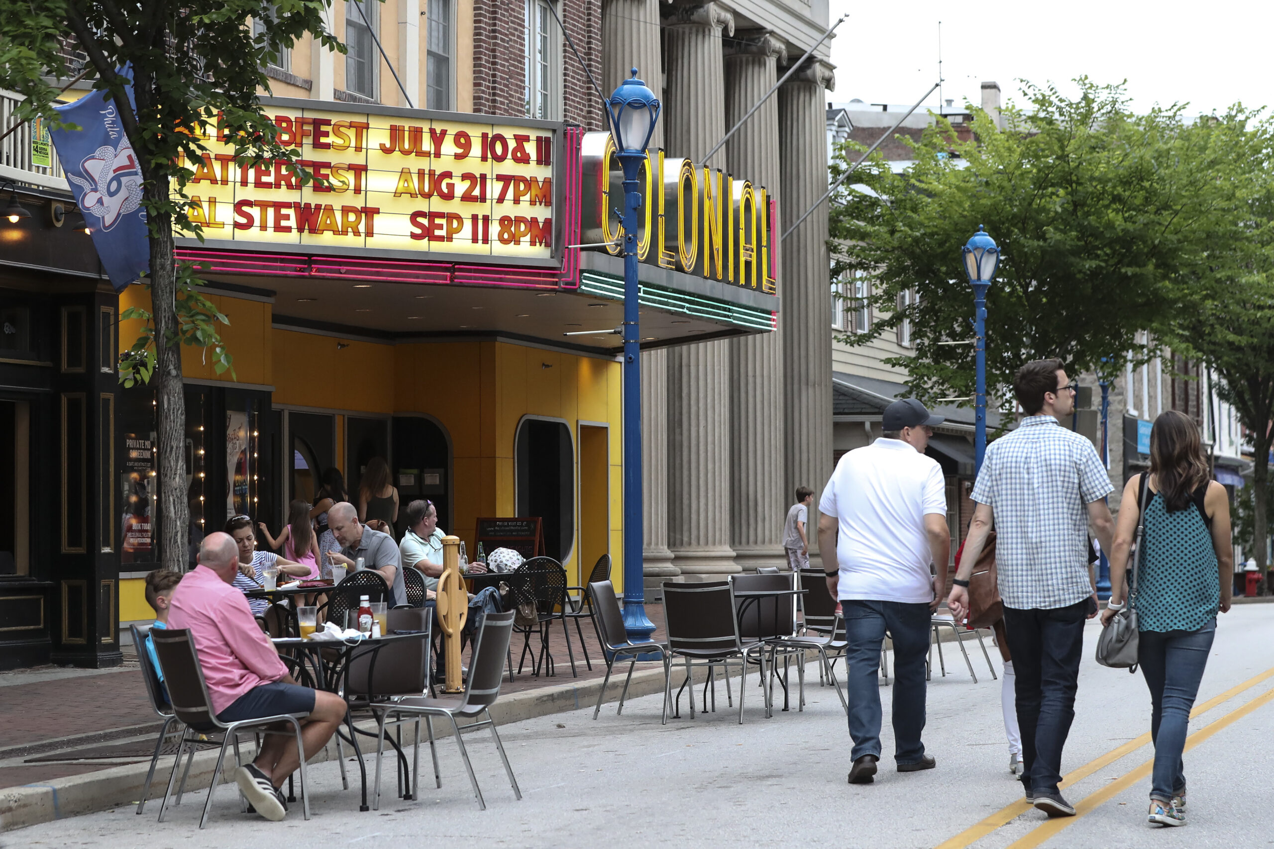 People walk along Bridge Street by the historic Colonial Theatre in Phoenixville in this June 2021 file photo.