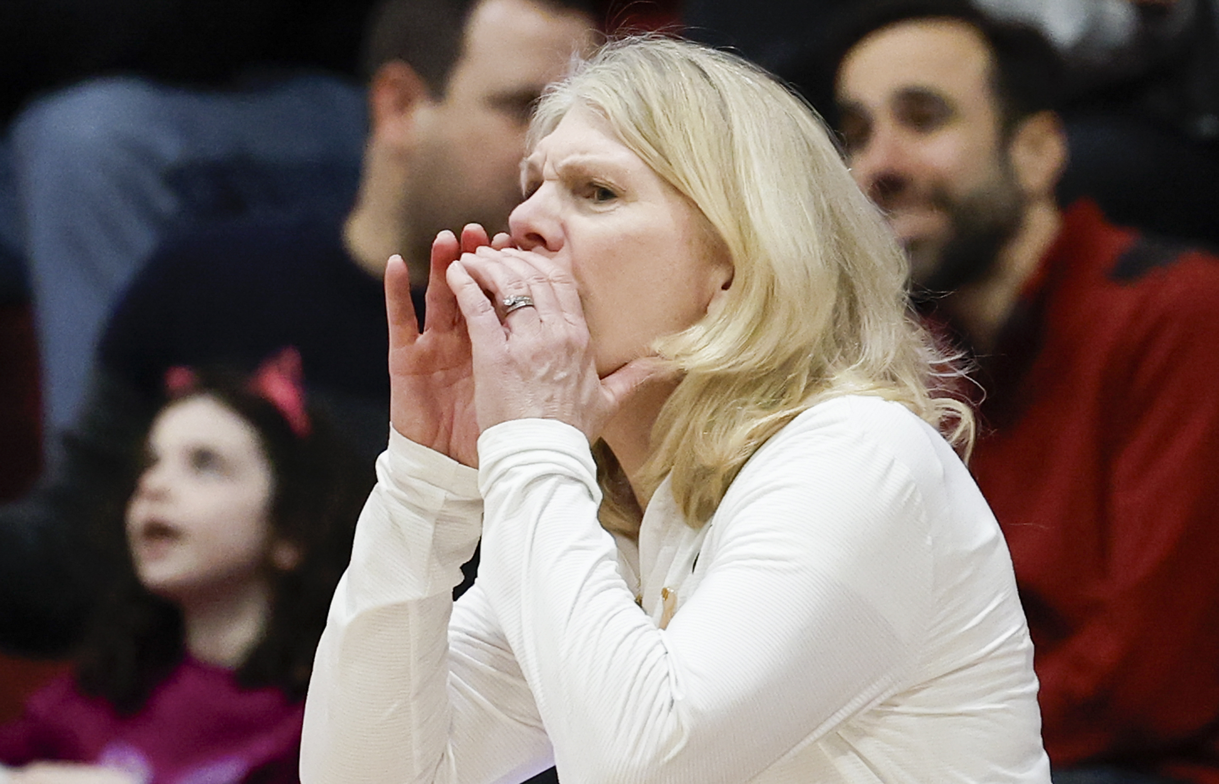 St. Joe’s coach Cindy Griffin yells to her team against Dayton on Saturday.