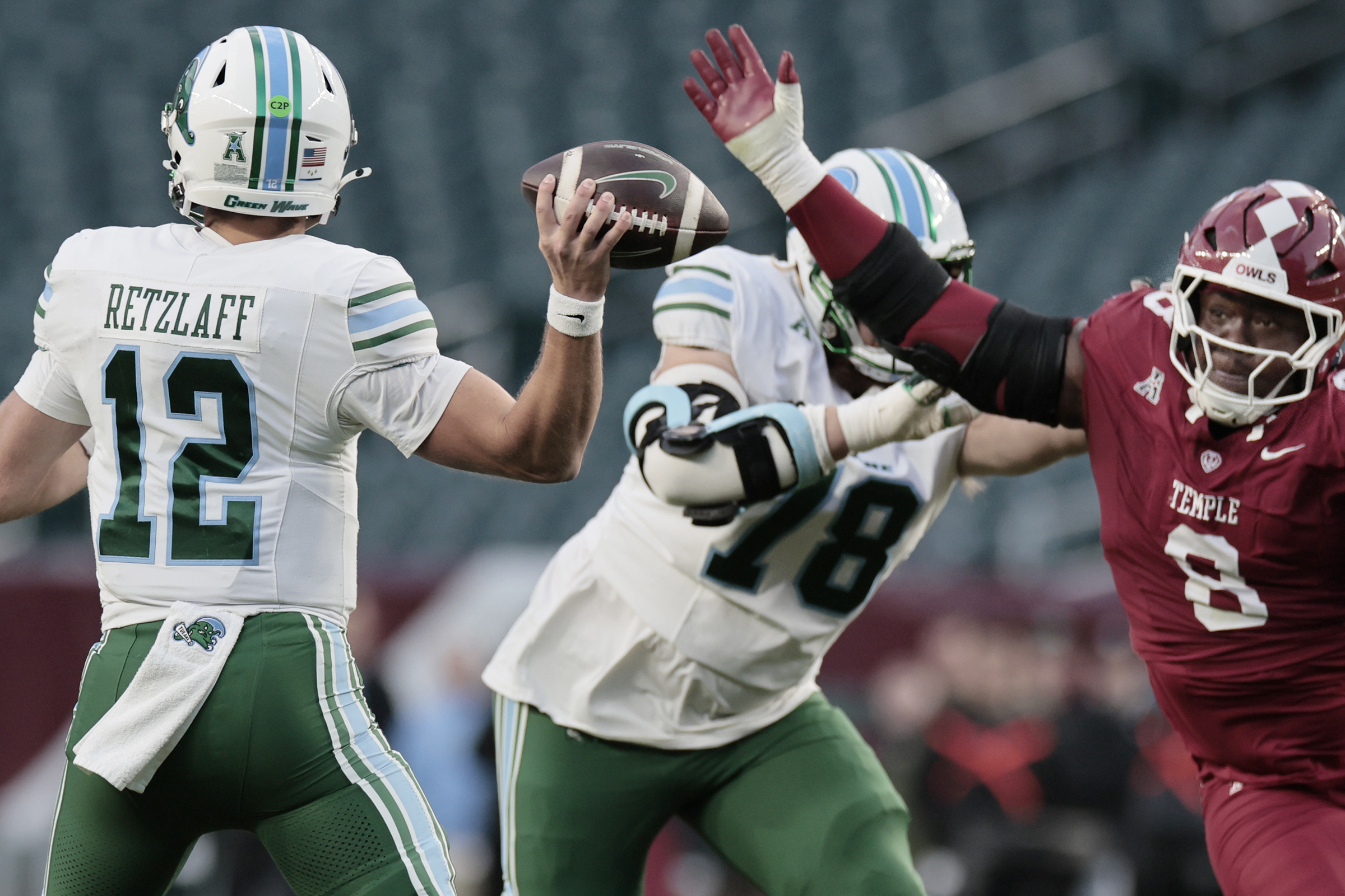 Temple’s Allan Haye (8) puts pressure on Tulane’s Jake Retzlaff on Saturday.