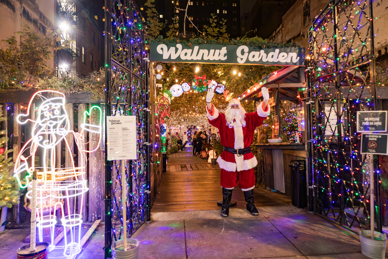 Santa greets guests at Walnut Garden at 1708 Walnut St., which is offering table side s’mores and gingerbread house decorating kits this holiday season.