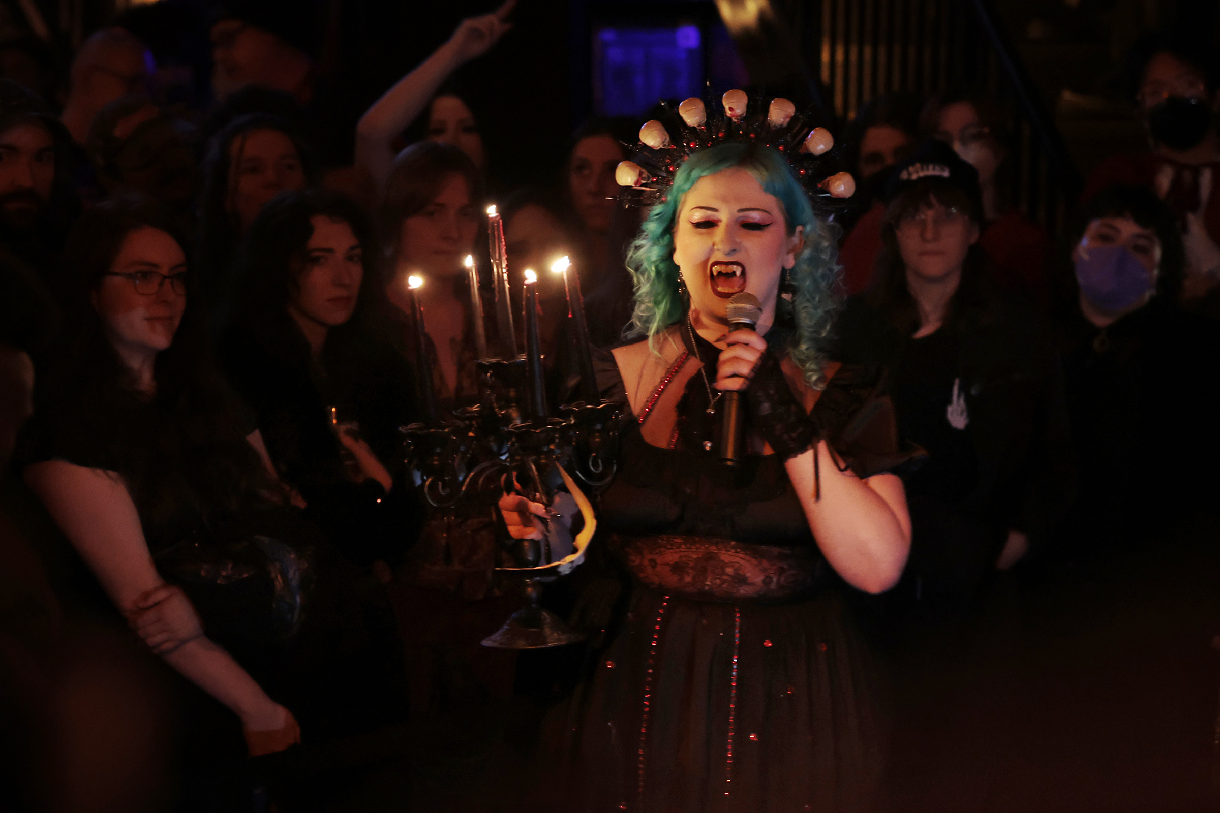 The crowd reacts as Ezra Markel’s vampire persona “Isolde the Saturnine” eats the human heart she concocted during the talent portion of the Miss American Vampire Pageant at heavy metal bar Doom in Philadelphia on Friday, Oct. 24, 2025.
