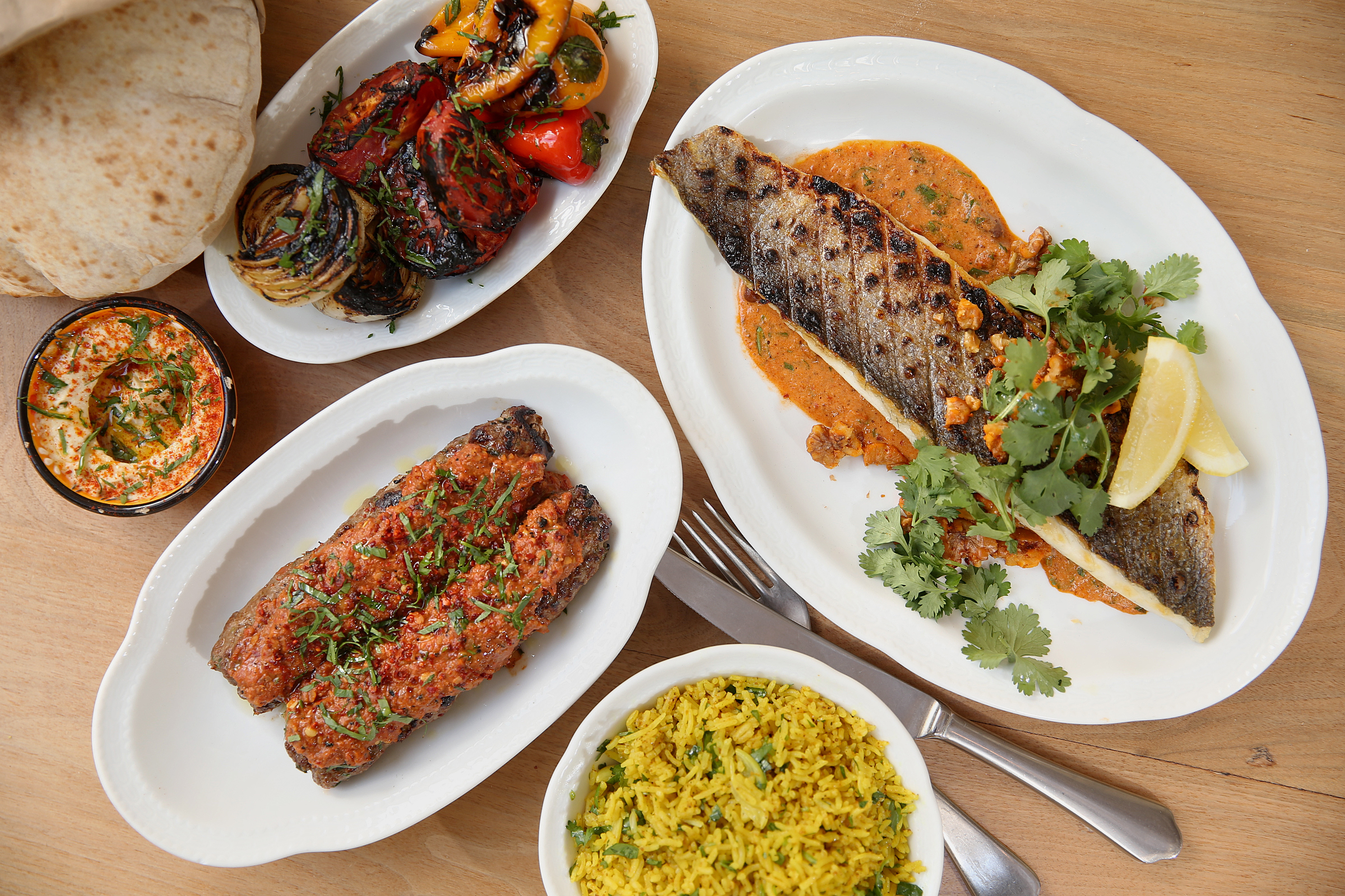 Halabi kebabs and the samke harra are pictured at Suraya in Philadelphia’s Fishtown section on Tuesday, Aug. 11, 2020.