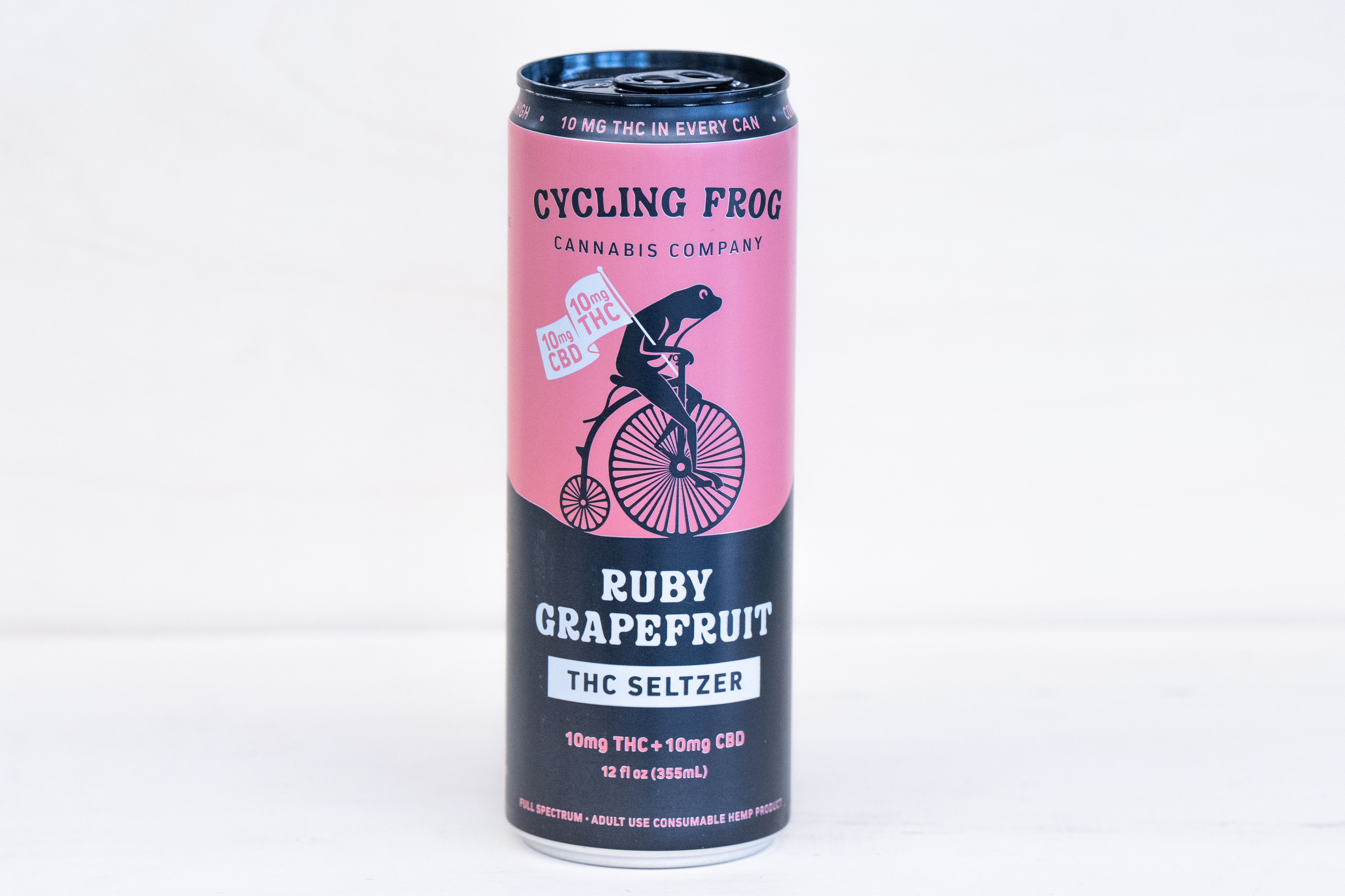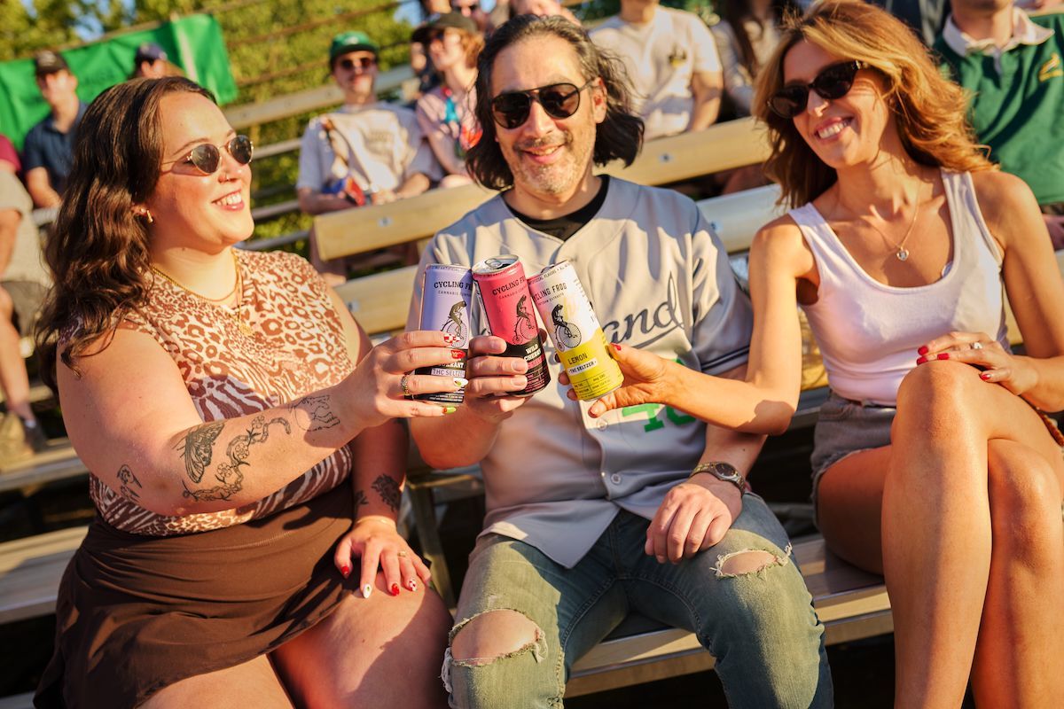 Adults share Cycling Frog canned THC drinks in this marketing photo provided by Cycling Frog.