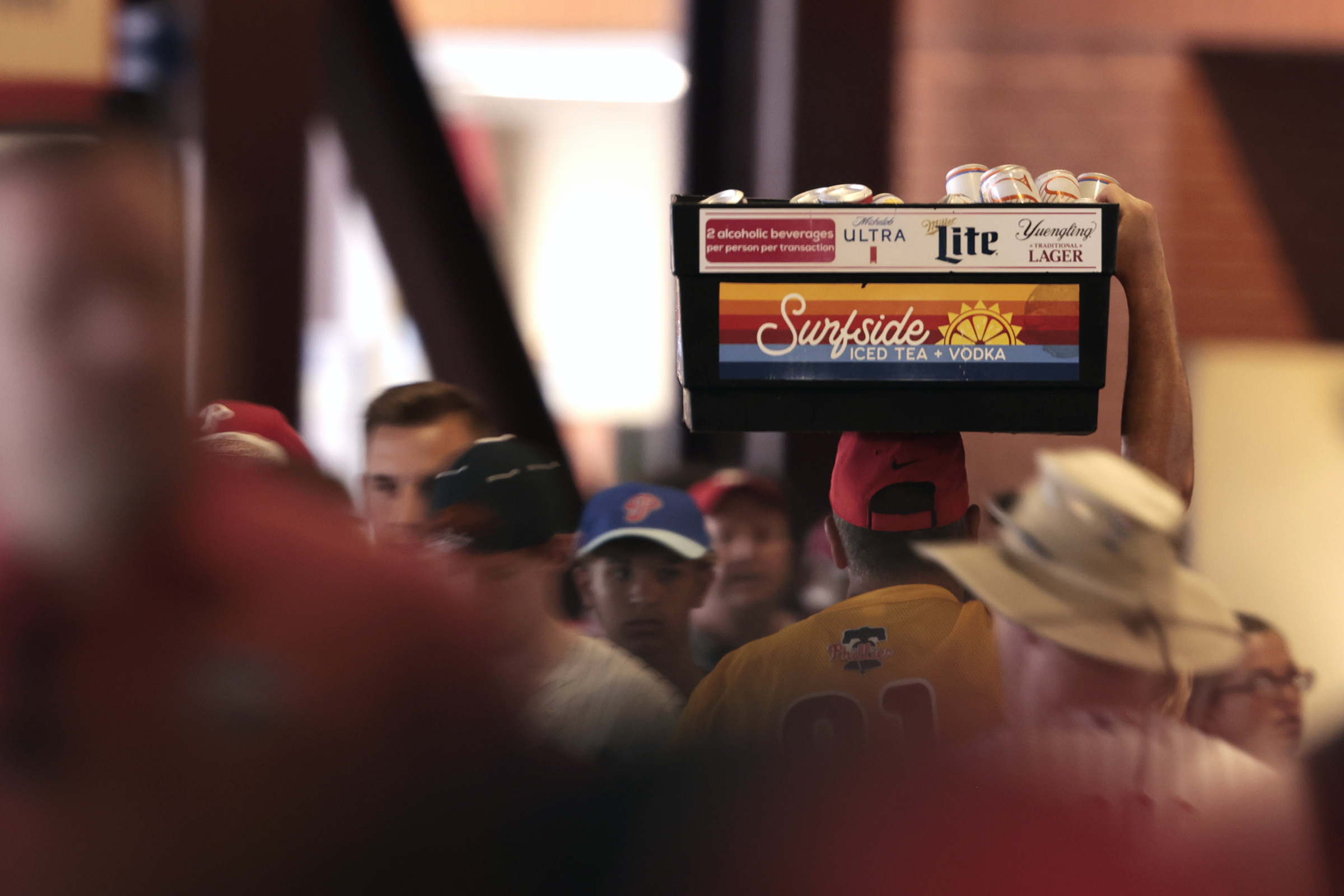 A hawker carries drinks, including Surfside canned cocktails, around Citizens Bank Park during a Philadelphia Phillies game in 2024. Surfside canned cocktails lead the stadium’s alcoholic drink sales.
