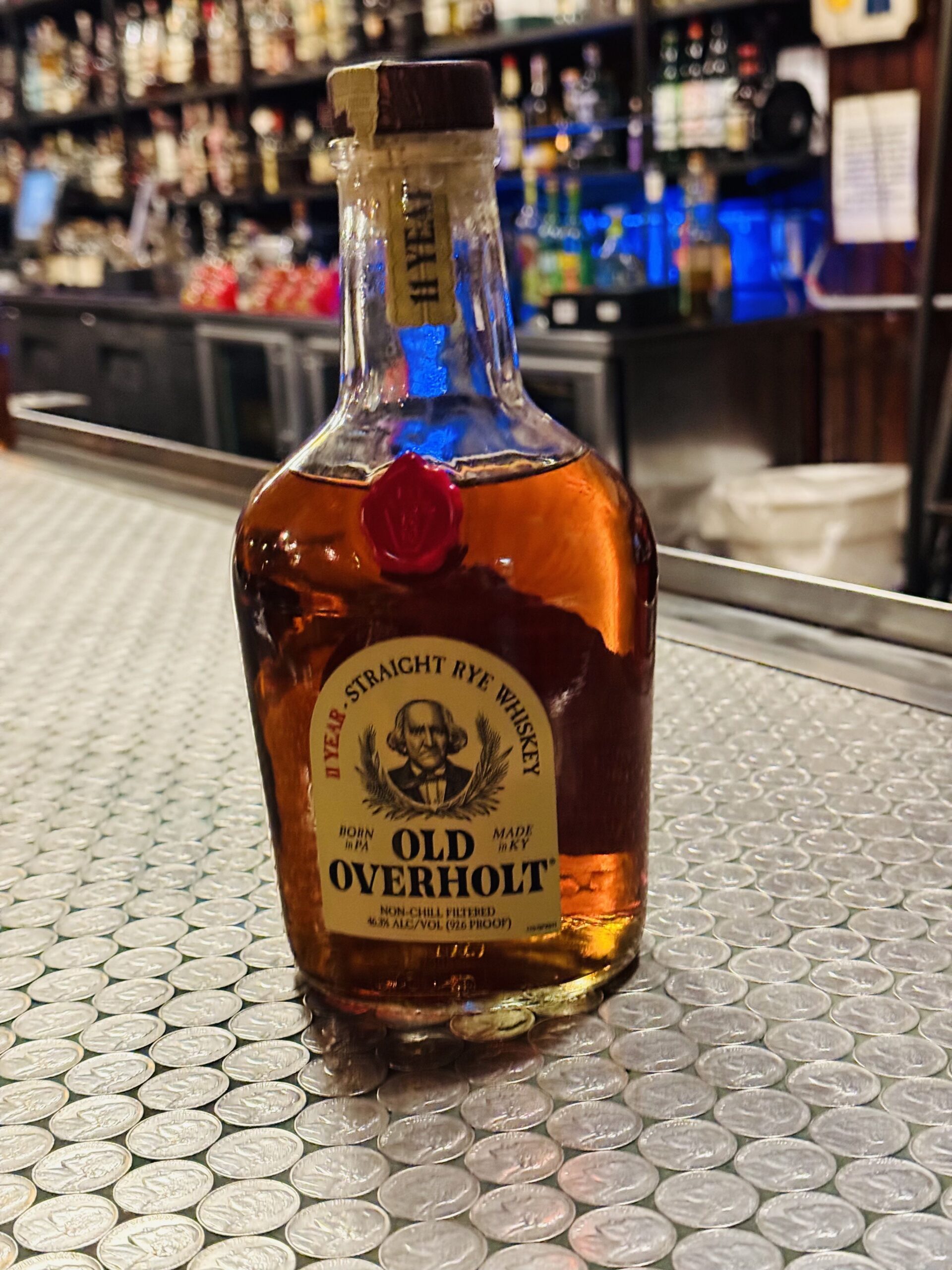 A bottle of Old Overholt 11-year-old rye, one of the cache of 835 bottles that Hop Sing Laundromat purchased through the Pennsylvania Liquor Control Board in 2022.