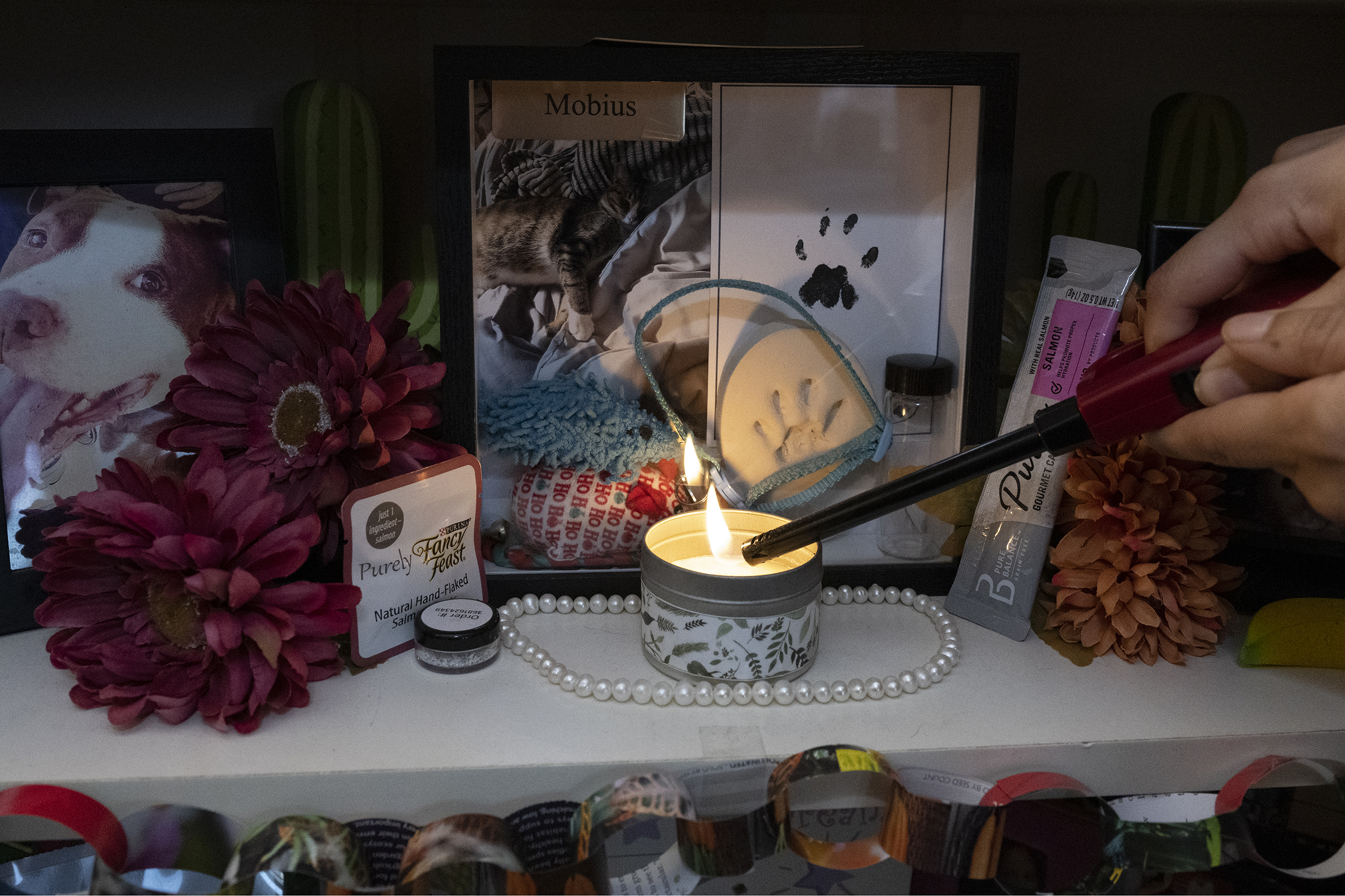 Genesis Pimentel-Howard lights a candle for her late cat, Mobi, beside a lovingly crafted ofrenda in her Philadelphia home on Monday. The altar glows with candlelight, welcoming the spirits of her beloved departed pets. The ritual is part of a growing tradition tied to Día de los Muertos.