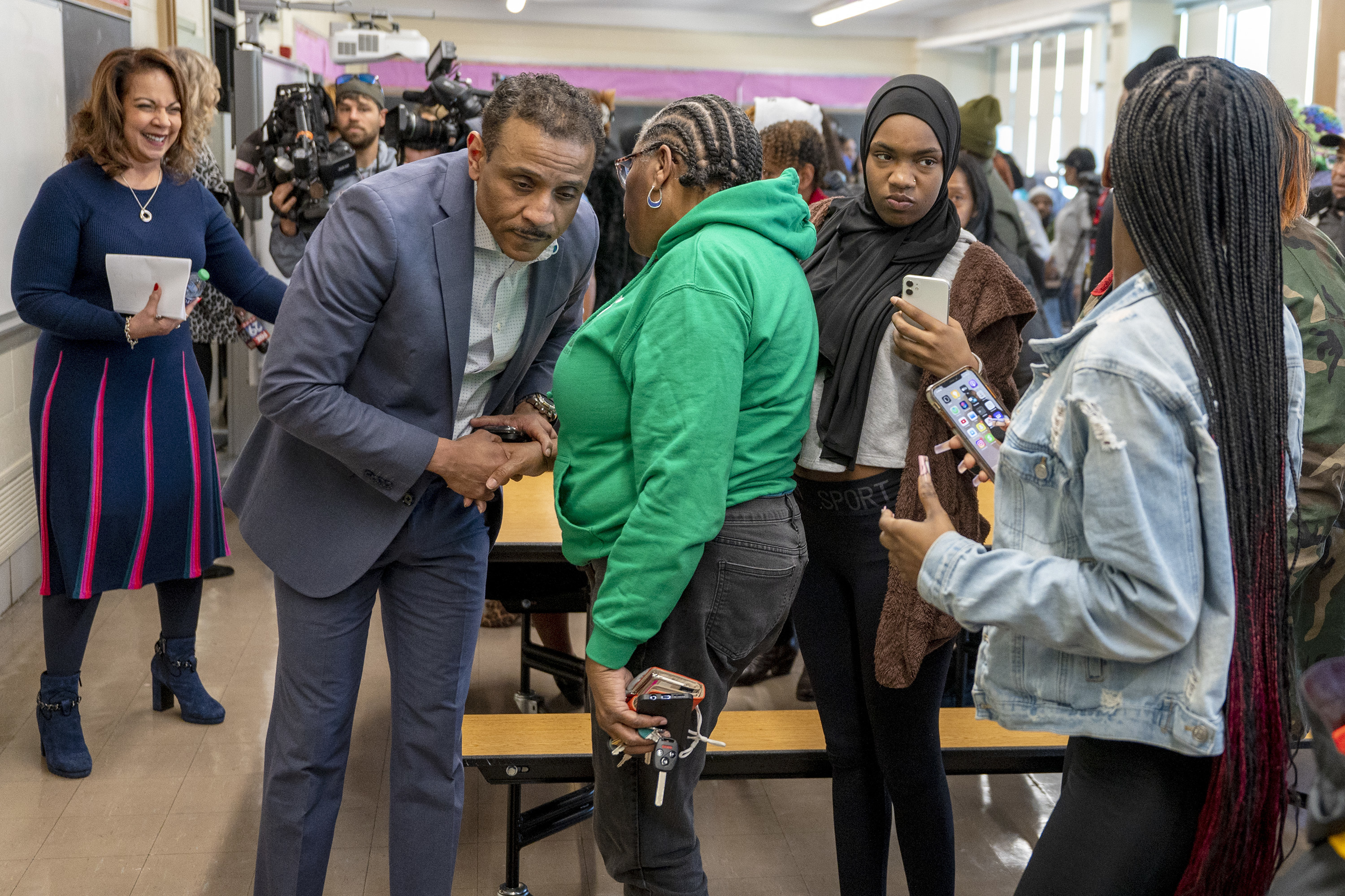 Philadelphia School District superintendent Tony B. Watlington Sr. (left) stops to talk with Marie Williams, the grandparent of a Building 21 High School student as he leaves a meeting with families, students and staff of the school at Strawberry Mansion High School Sunday Mar. 5, 2023.