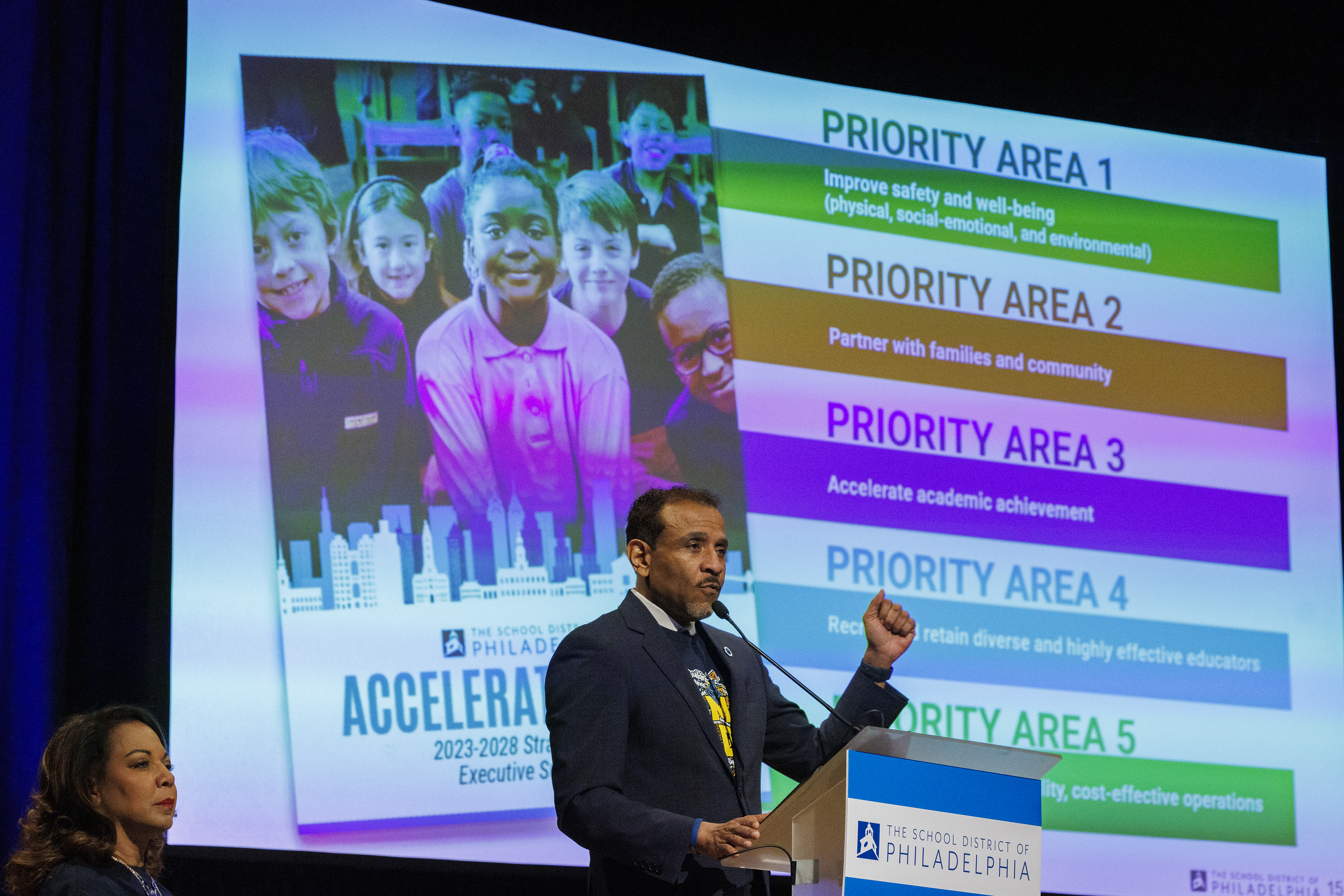 Superintendent Tony B. Watlington, Ed.D, during State-of-the-schools address, High School of the Future, Philadelphia, Thursday, Jan. 30, 2025. .