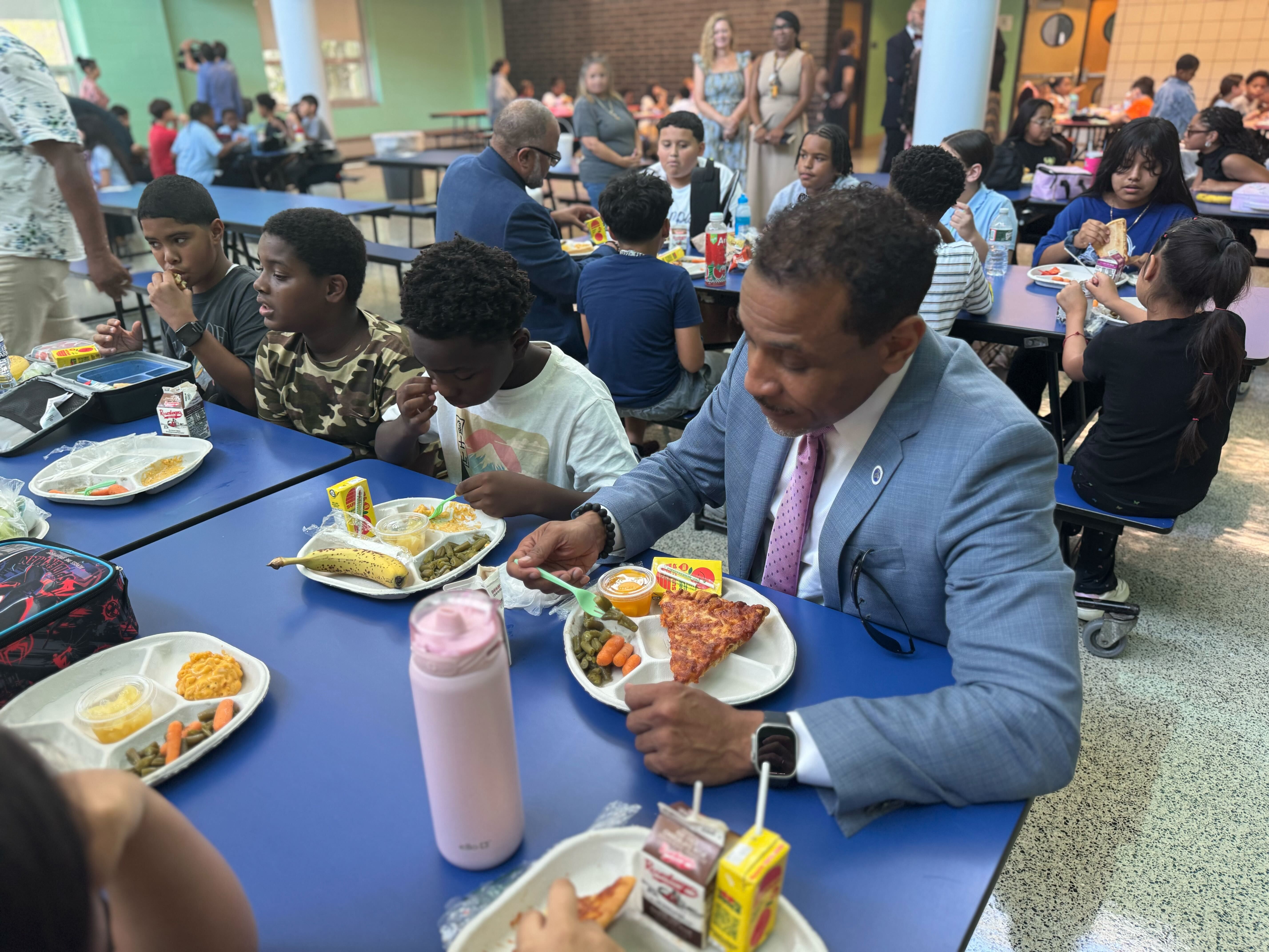Superintendent Tony B. Watlington Sr. eats lunch with students at Hunter Elementary in North Philadelphia: pizza, carrots and green beans, fruit cup. Watlington also drank chocolate milk and chatted with kids about the first day of school of the 2025-26 school year.