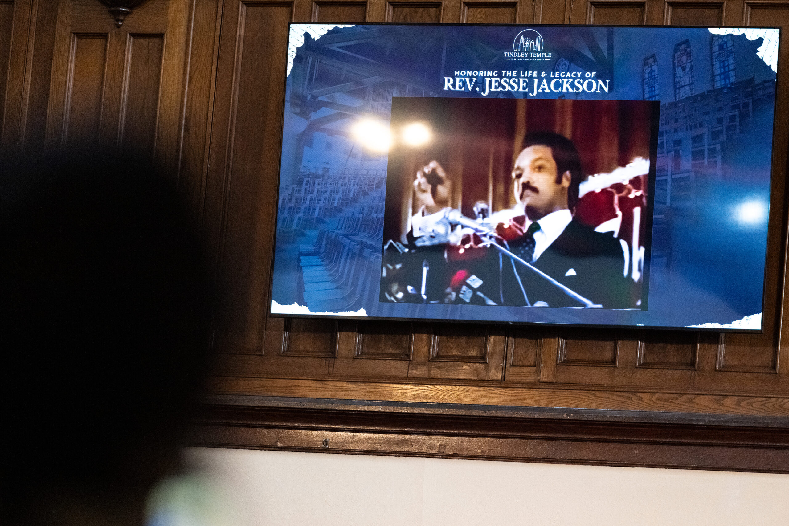 Congregants watch a video of Rev. Jesse Jackson at the Citywide Black History Celebration at Tindley Temple United Methodist Church on South Broad Street in Philadelphia on Saturday, Feb. 21, 2026. Tindley is where “We Shall Overcome,” an anthem of the Civil Rights Movement, was written.