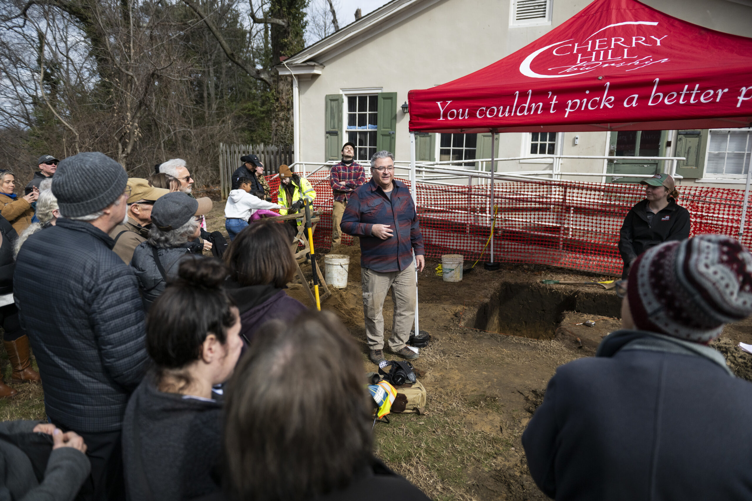 Matthew Tomaso, senior director of cultural resource practices at PS&S, speaks to a crowd of people before the start of an archeological dig at Croft Farm in Cherry Hill, N.J.m on Saturday, Feb. 21, 2026. Croft Farm, listed on the National Register of Historic Places, is now an active archaeological site due to the farm’s role in the Underground Railroad.