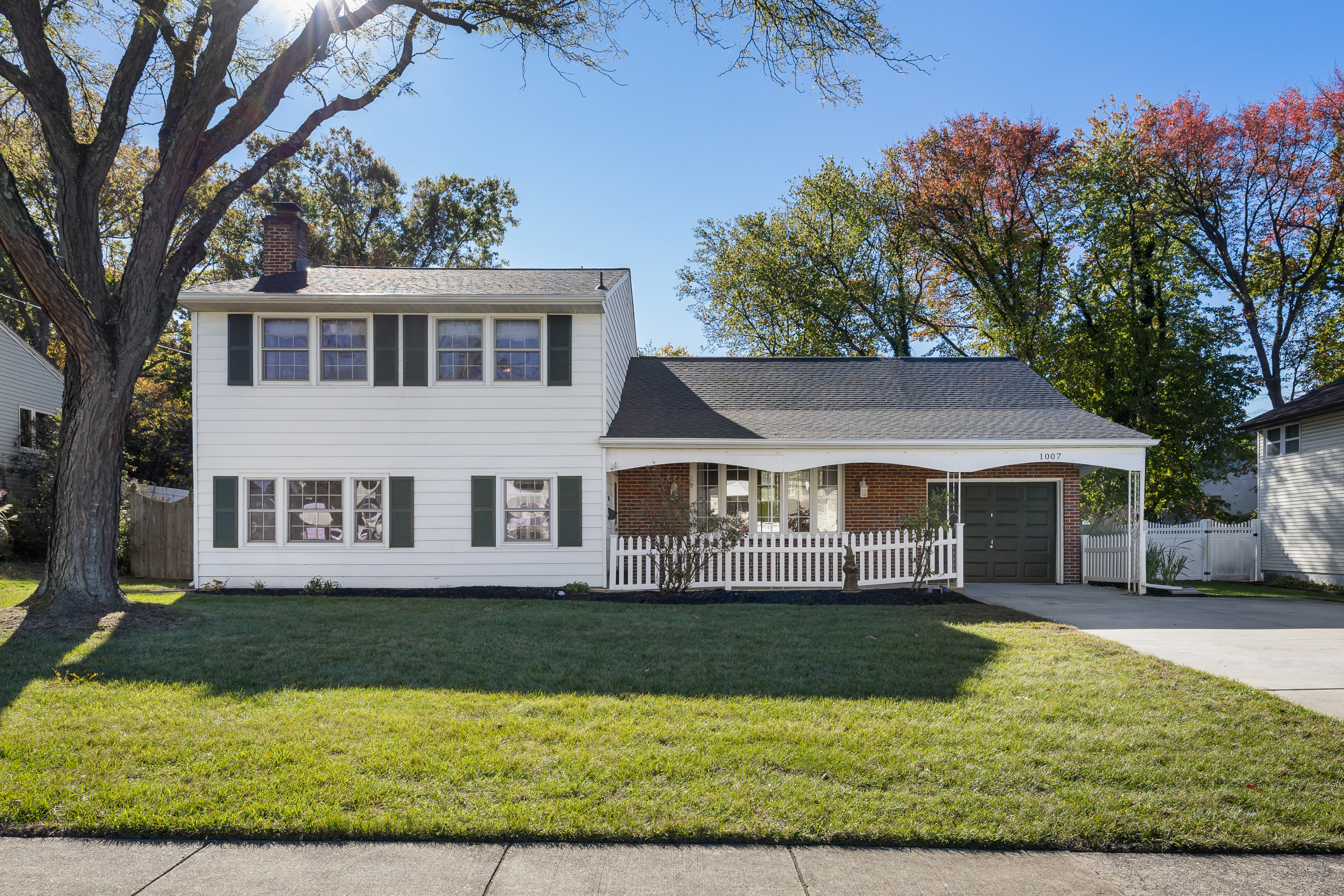 Built in 1957, this white-siding and red-brick home has four bedrooms, including a primary suite with its own bathroom, all located on the upper level. On the home’s main level, there’s a family room with original hardwood flooring, a dining room, and an eat-in kitchen. It has updated appliances, floral wallpaper, and a white tile backsplash with fruits interspersed throughout. The home also has a living room off its entryway, complete with a wood-burning fireplace and log storage. Outside, there’s a covered front porch offset by a white picket fence, while out back there’s a fenced yard with a storage shed. The home has a newly installed roof, as well. There’s an open house Sunday from 11 a.m. to 1 p.m.