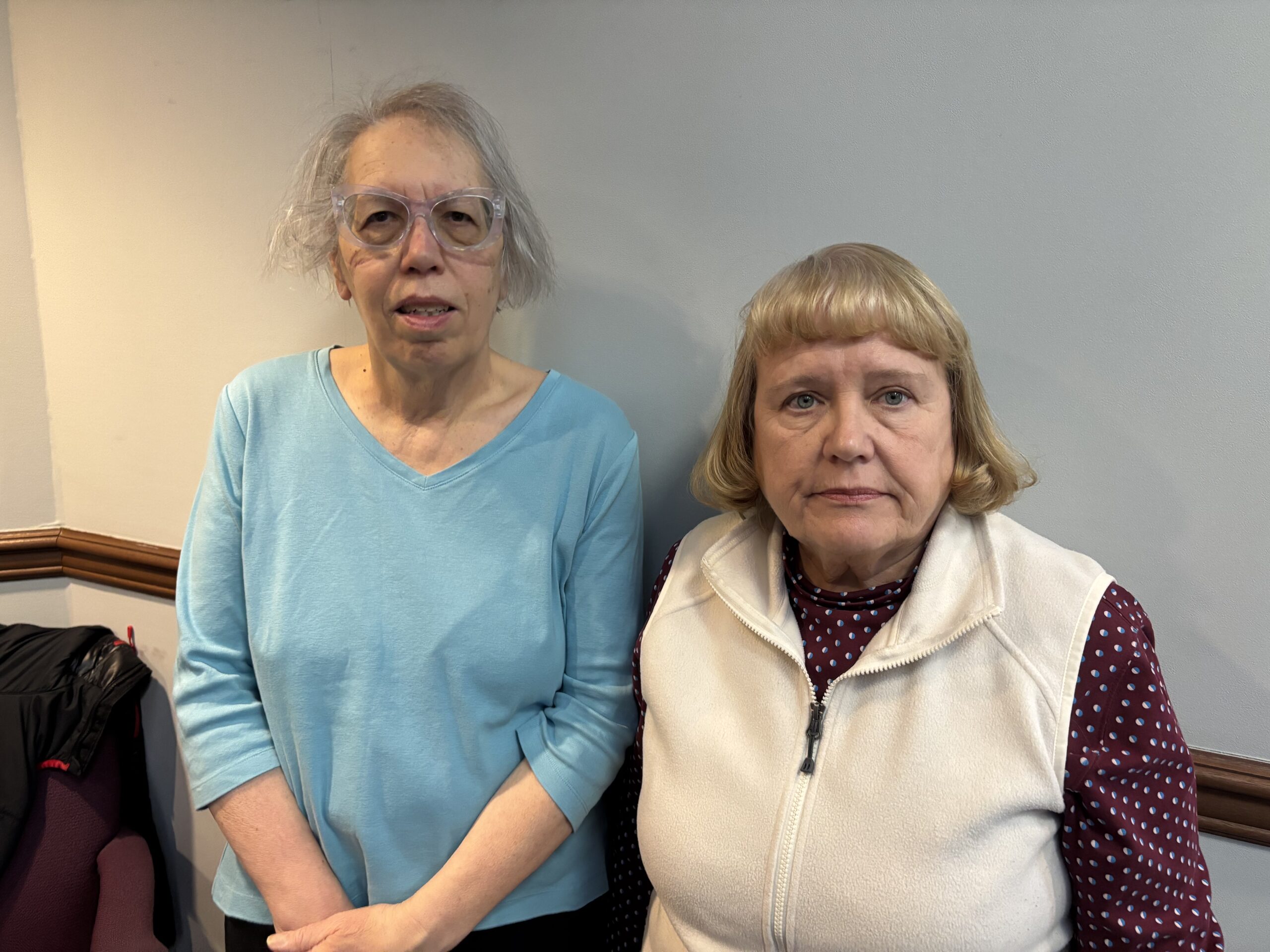 Lisa Von Ahn (left) and Josephine Kwiatkowski, members of the Schuylkill County chapter of Indivisible, attend a county commissioners meeting in Pottsville on Tuesday to speak out against a proposed ICE detention center in Tremont, Pa.