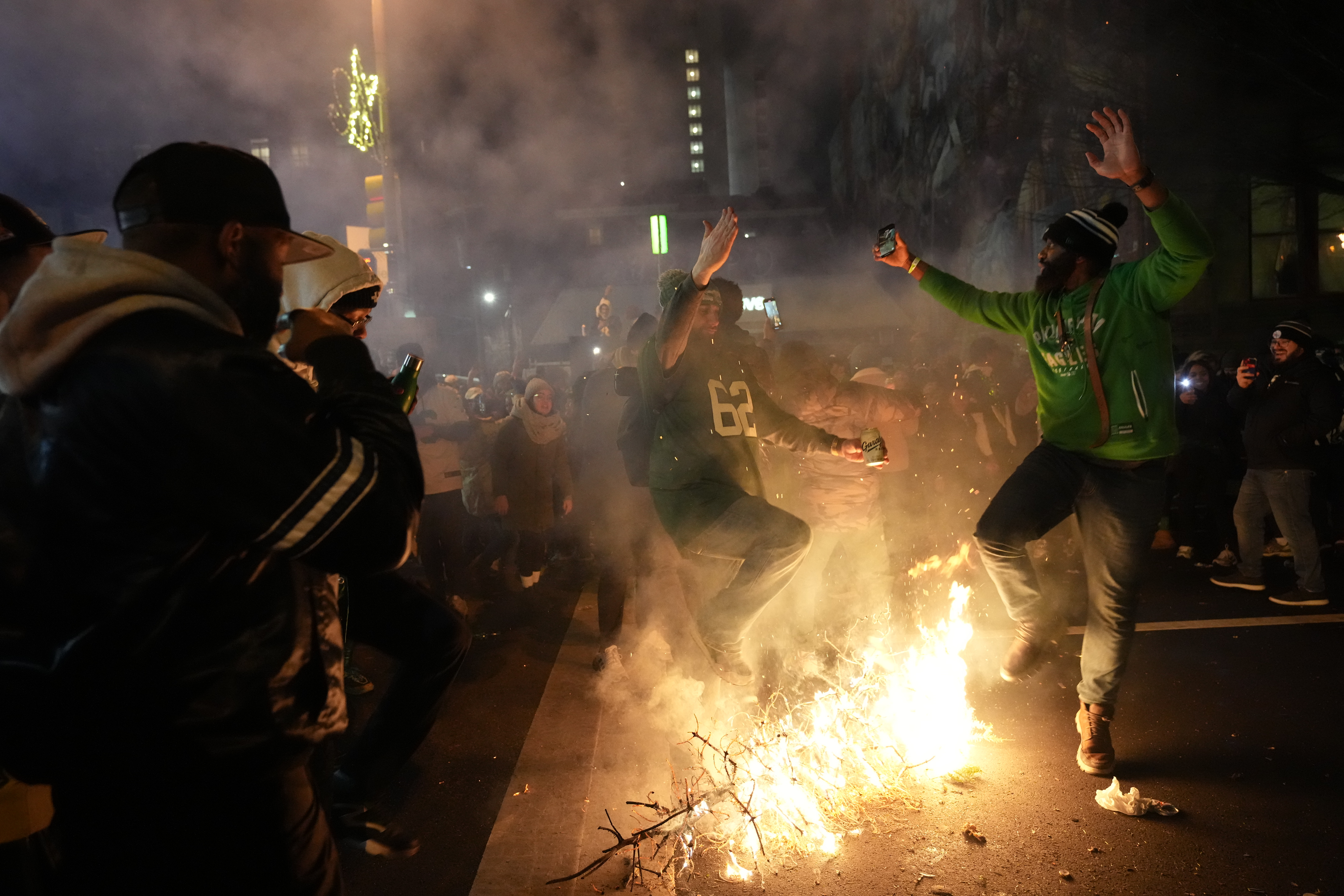 Jubilant Eagles fans dance around a fire on Broad Street after the Birds beat the Chiefs in Super Bowl LIX.