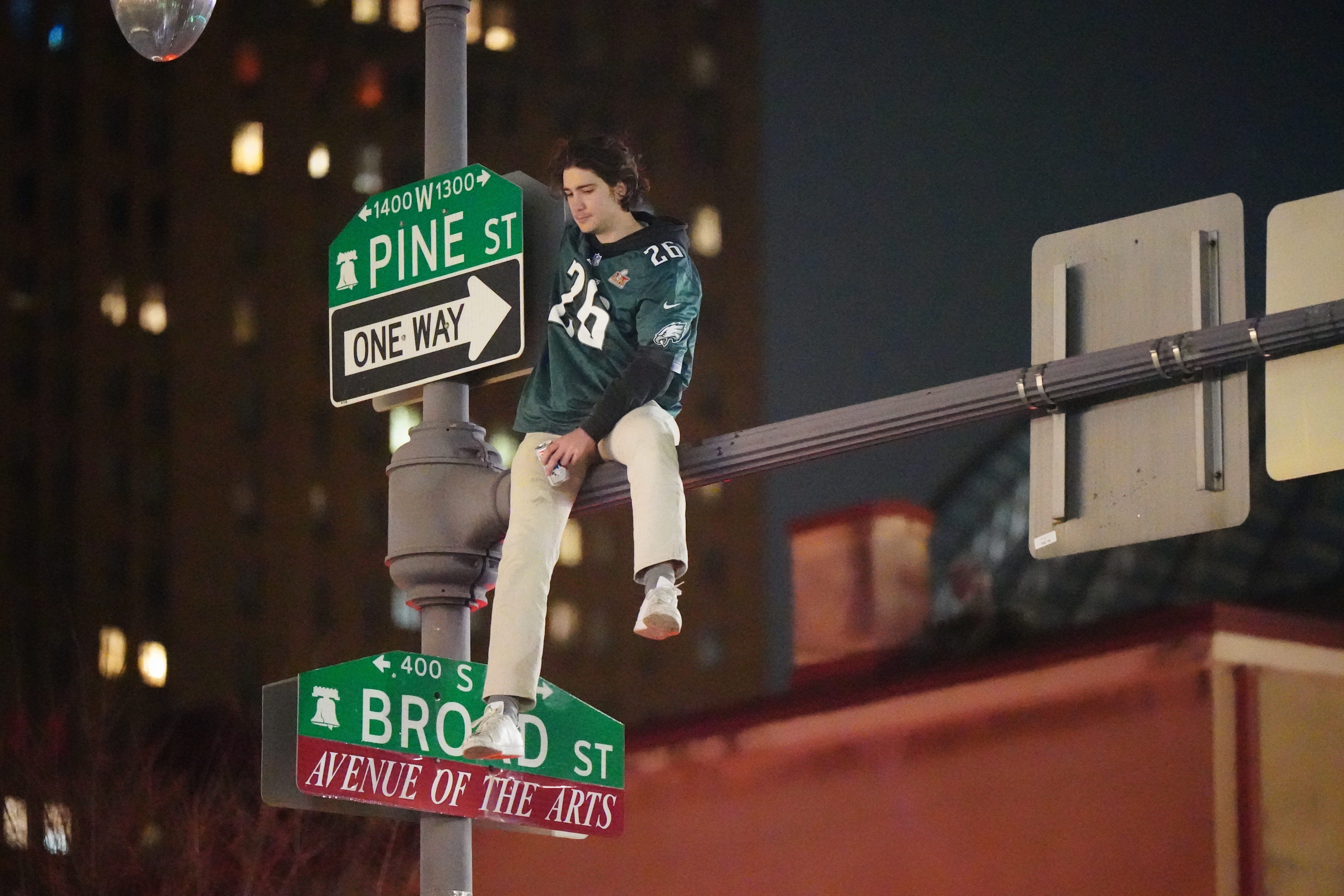 An Eagles fan sits on top of the traffic light post at the intersection of Broad and Pine Streets after the team won Super Bowl LIX in February.