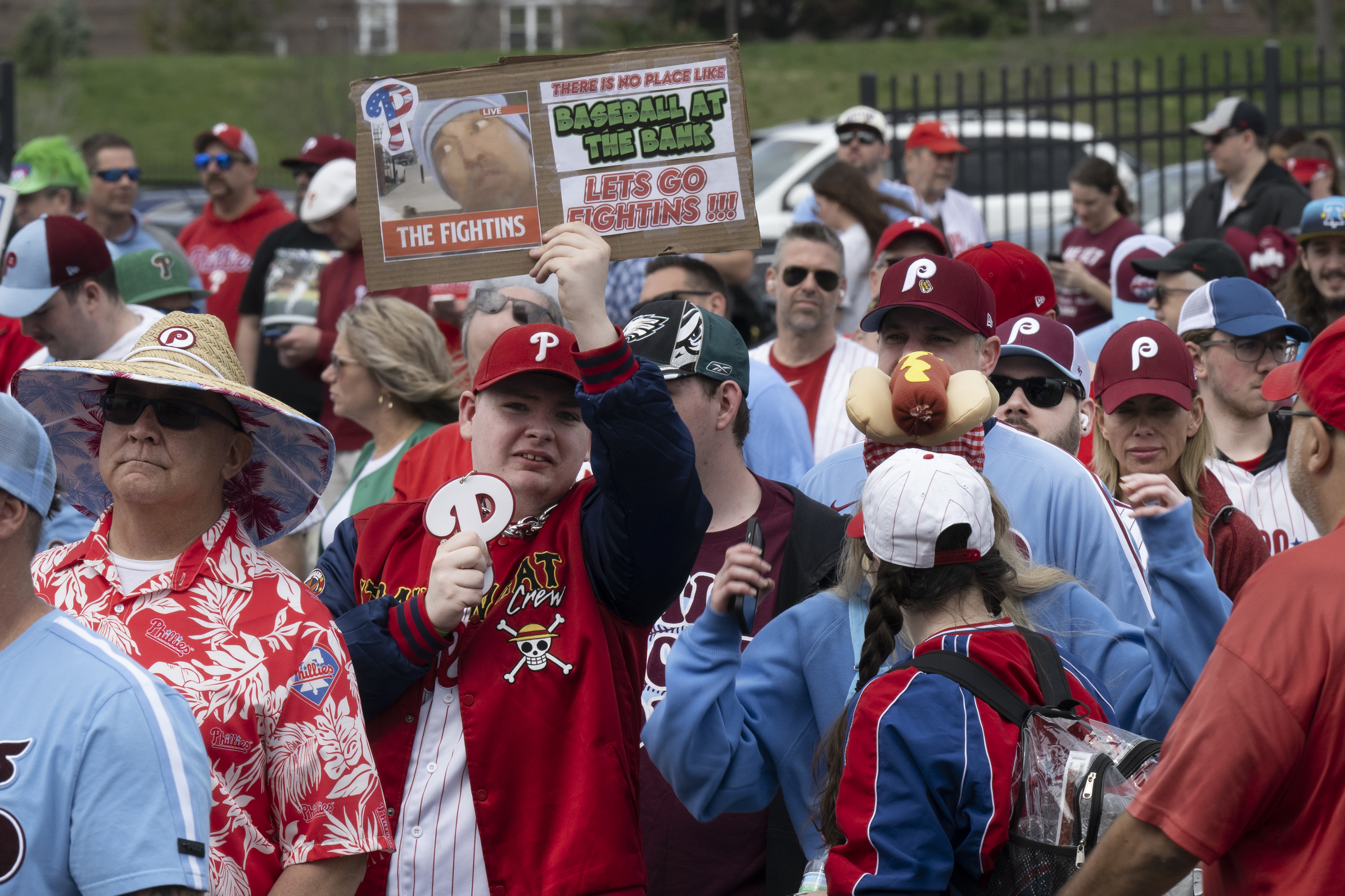 A Phillies fan holds up a sign paying tribute to another viral Phillies fan before the team’s 2025 home opener.