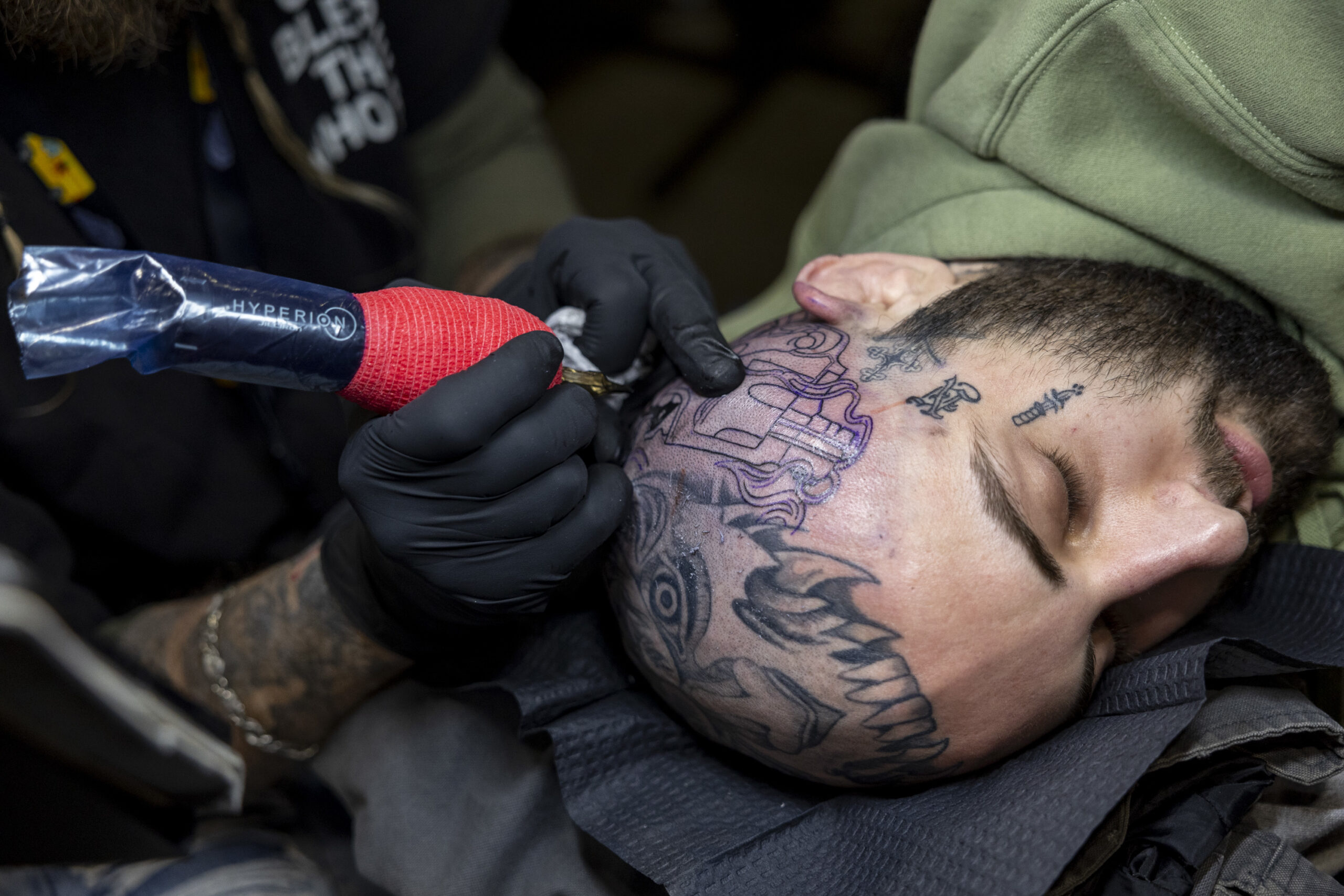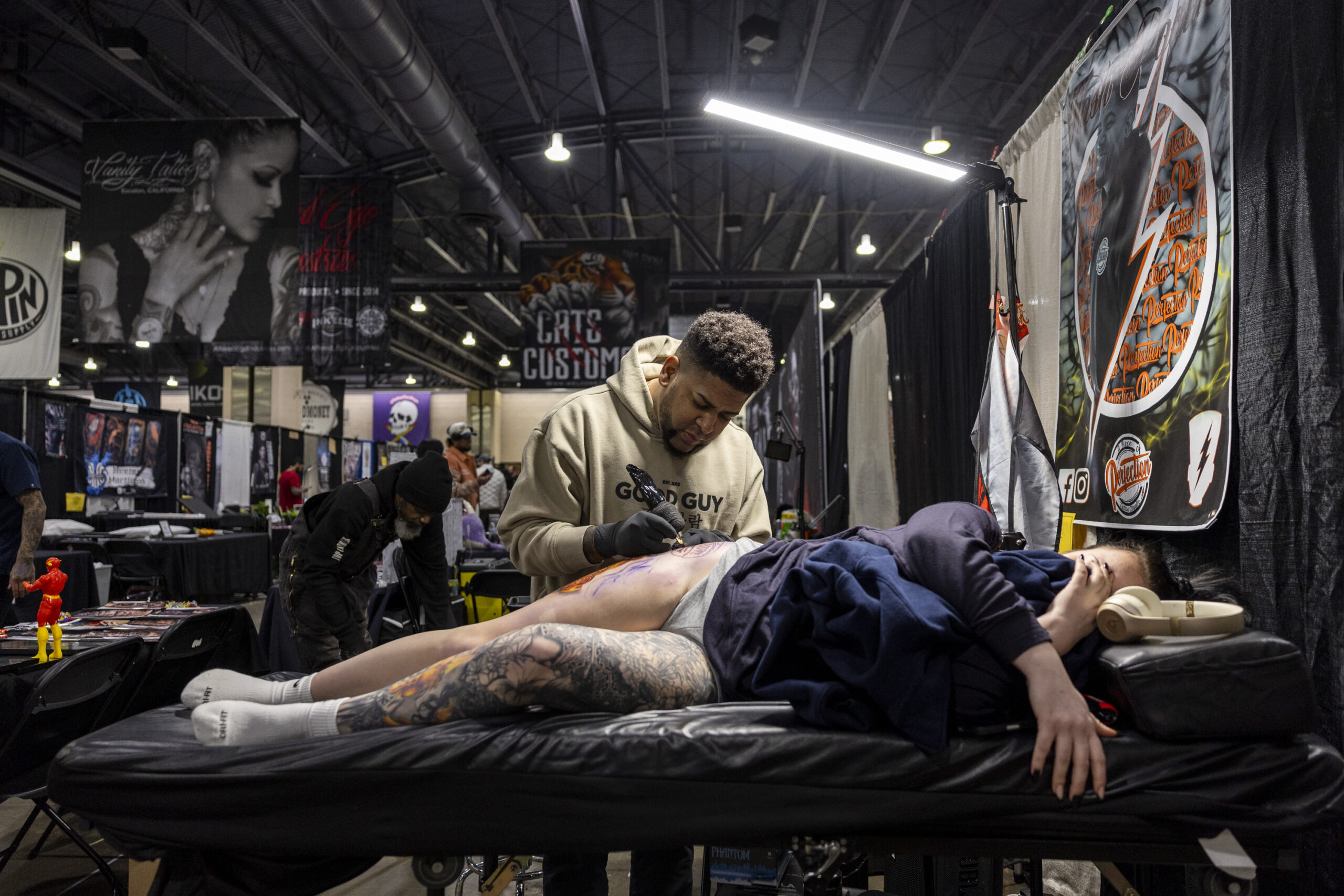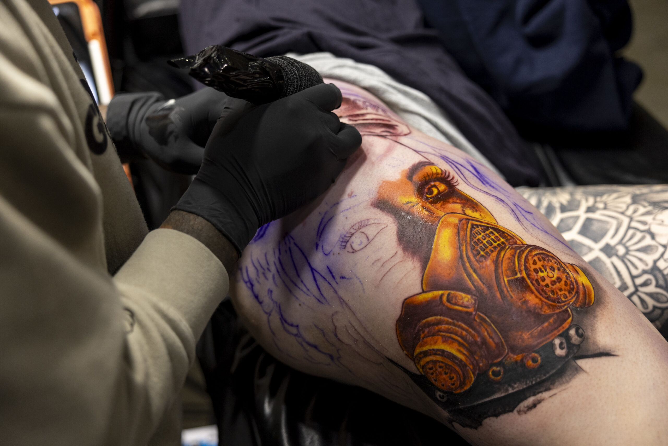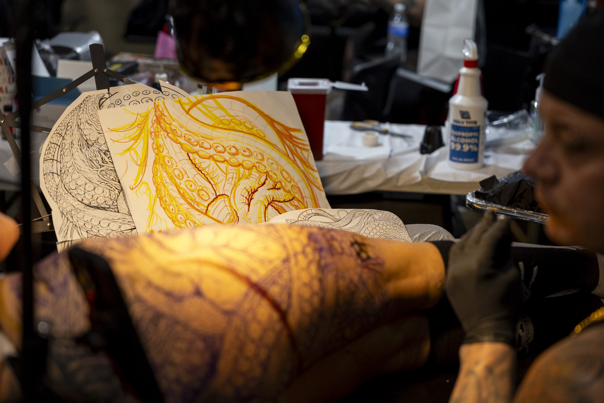 Marisa Miller, of Palymyra, Pa., has a tattoo done by Flash Padilla, also of Palmyra, Pa., at the Villain Arts Tattoo Festival on Jan. 24.Flash Padilla, works on Marisa Miller’s tattoo.Su’a Sulu-ape Si’i Liufau (center), of Garden Grove, Cali., does a traditional Polynesian tattoo with the help of Lousua Filoi (left) and Max Stimac, of A-Town Tattoos.Su’a Sulu-ape Si’i Liufau, does a traditional Polynesian Tattoo with the help from Lousua Filoi (left) and Max Stimac of A-Town Tattoos.Alexandra Fische, of Ben Salem, is tattooing Daneka Hoopaugh, of Atlanta, Ga., who has been waiting for years to get tattooed by Fische.Jesse Probus, of Whitehall, Pa., with Sick Ink Studios, tattoos a heart surrounded by tentacles on Abby Zeiseo, also of Allentown.Cezar Walerski, of Allentown, Pa., tattoos the head of Nick Onea, also of Allentown.