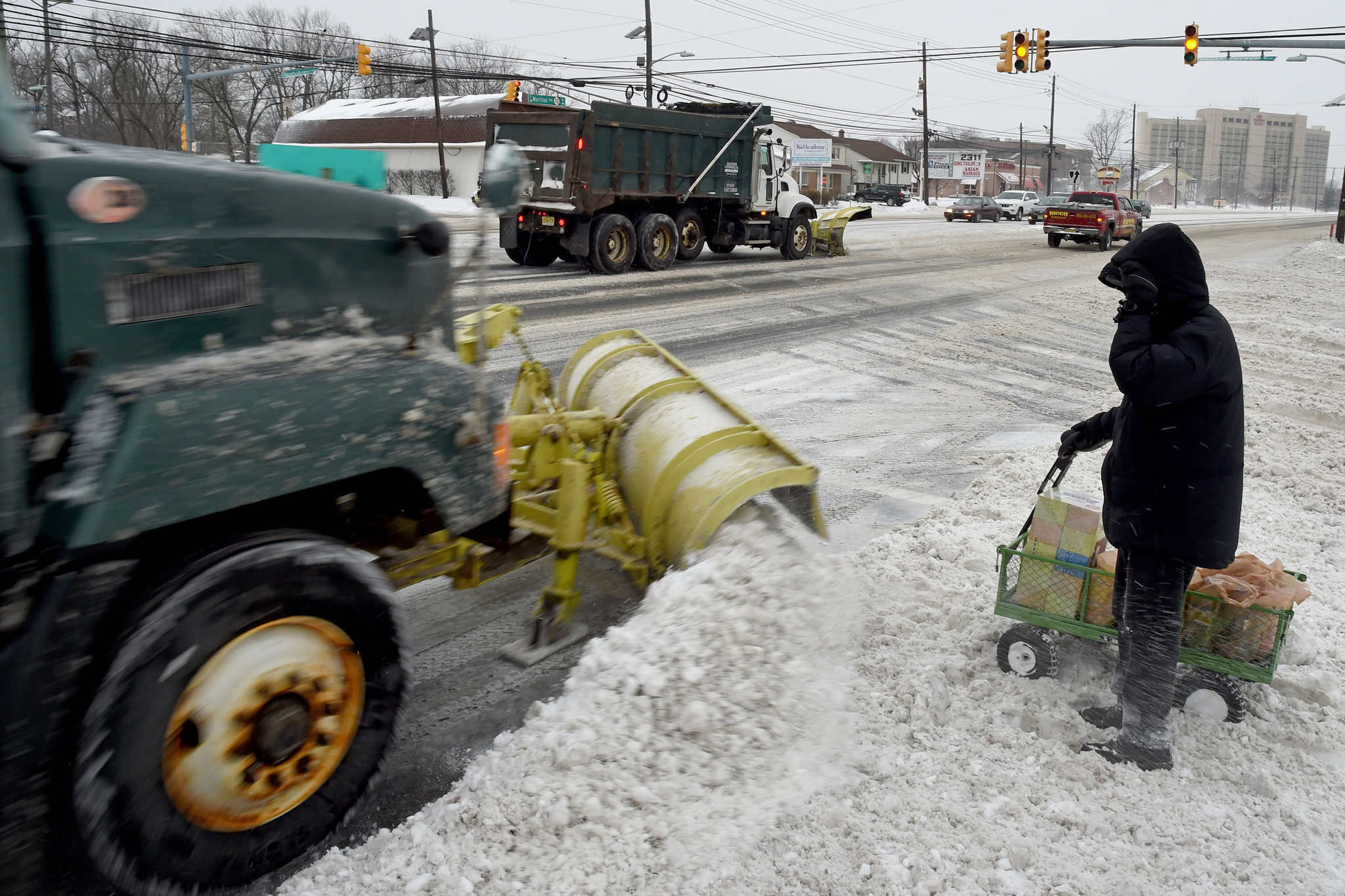 Pedestrians and plows on Rt. 70 in Cherry Hill in Januiary, 2018.