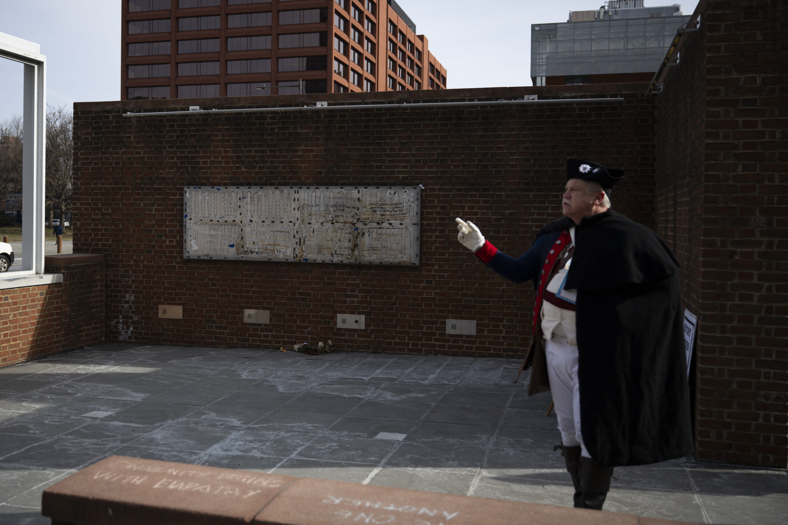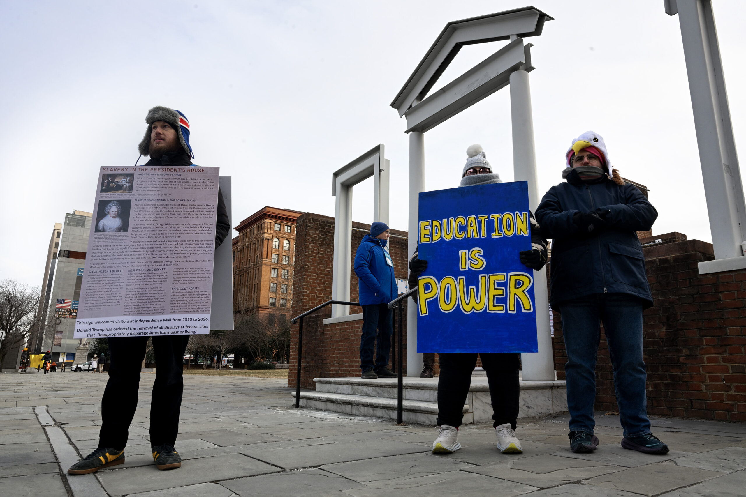People leave notes on the spaces at the President’s House site in Independence National Historical Park.Ted Zellers (right) wears a sandwich board with a replica of one of the removed slavery panels as people visit and protest at the President’s House site.Ted Zellers (left) wears a sandwich board with a replica of one of the removed slavery panels, joining Jenna and Gregory May (right) protesting at the President’s House. People leave notes and political satire cartoons in the spaces at the President’s House.People protest at the President’s House site.Al DerMovsesian holds replicas of some of the removed slavery panels as people visit the President’s House site.The President’s House in Independence National Historical Park.The President’s House in Independence National Historical Park.Michael Carver portrays Mordecai Sheftall as part of a “History Matters” guide at The President’s House.A sign was placed at the President’s House.A group of teacher taped posters along the now barren brick walls of the President’s House.A single rose and a handwritten cardboard sign (“Slavery is part of U.S. history learn from the past or repeat it”) are inside an empty hearth at the President’s House.