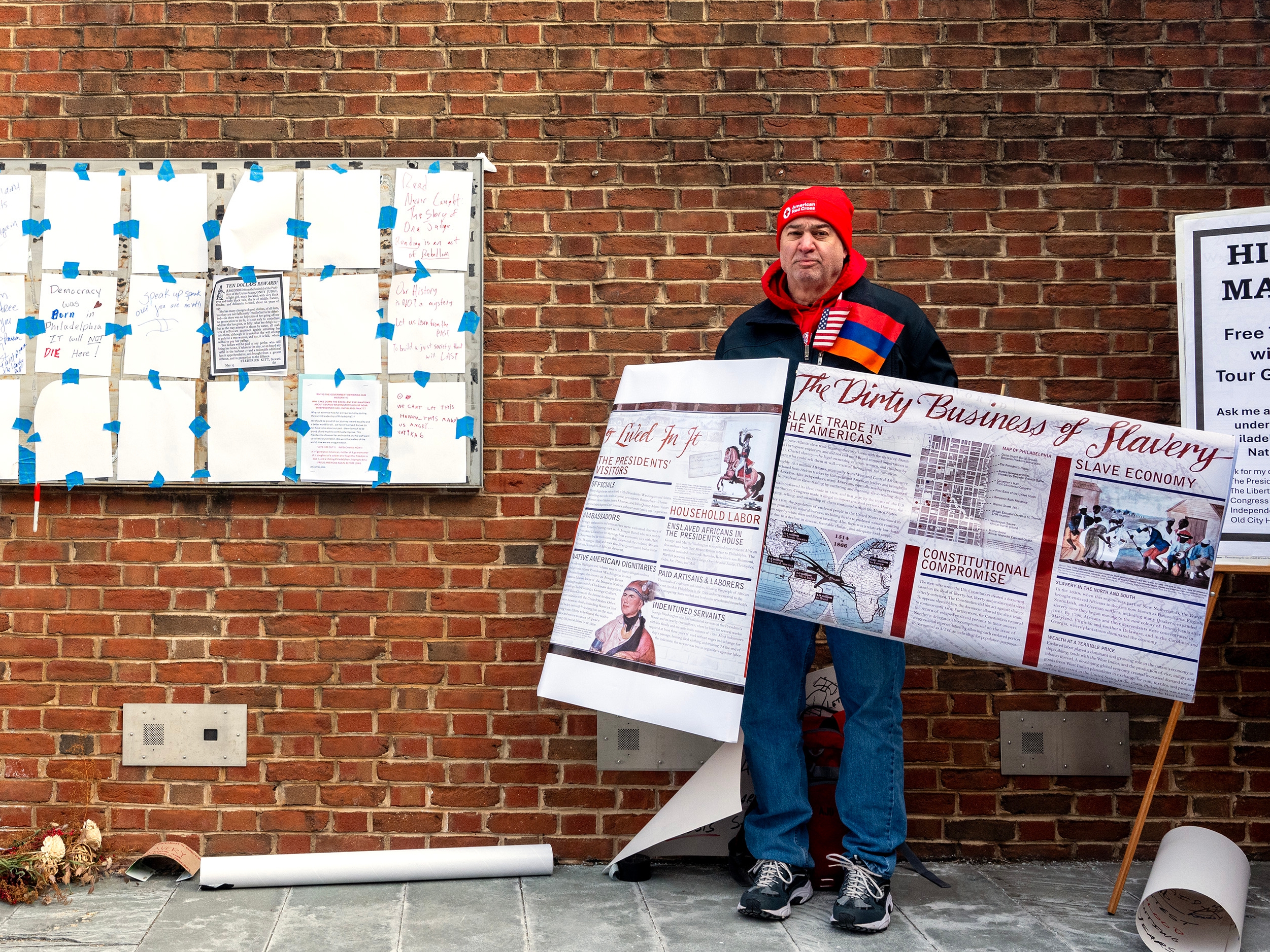 Ted Zellers, a property manager in North Philly, took a more full-body approach to his protest. He found a high-resolution image online of one of the removed signs, titled “Slavery in the President’s House,” got it printed twice, fashioned a sandwich board out of the posters, and became “a living sign,” he said.