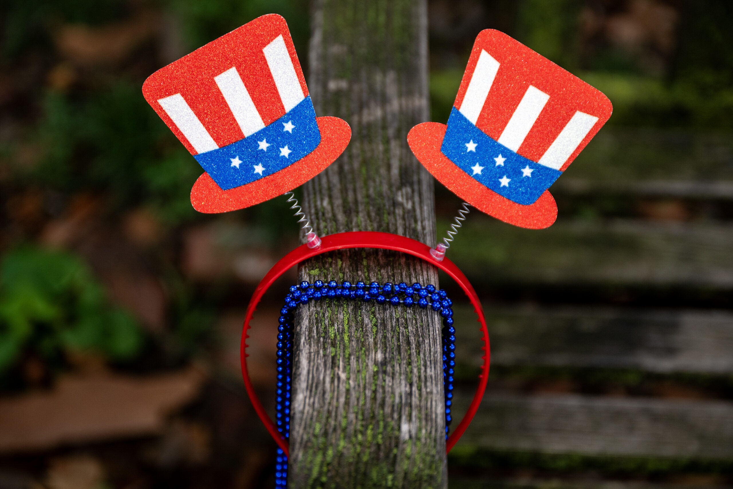 An Uncle Same hatted headband is left on a park bench Philadelphia’s Historic District during the Independence Day weekend celebrations Jul. 2, 2025.