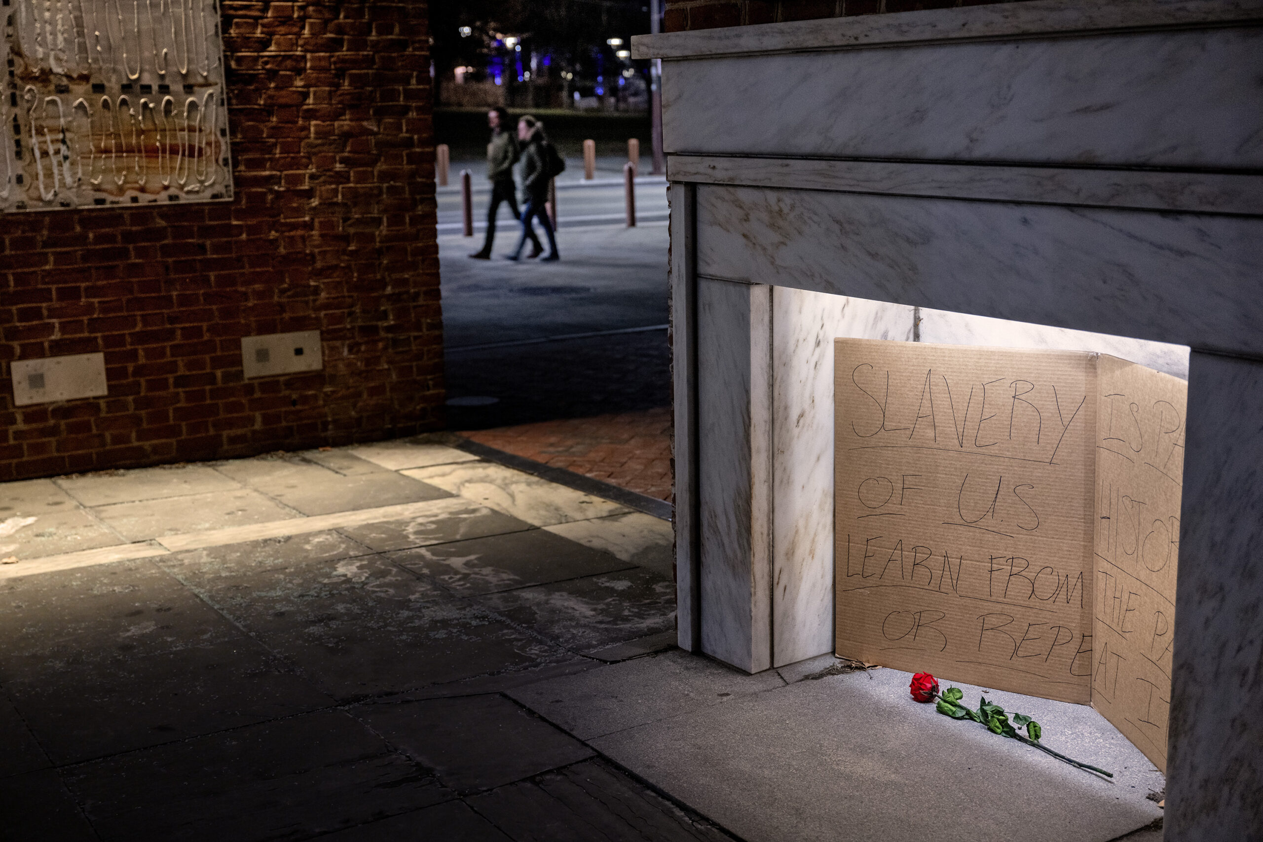 A single rose and a handwritten cardboard sign – “Slavery is part of U.S. history learn from the past of repeat it”- are inside an empty hearth at the President’s House site Thursday night, Jan. 22, 2026 after workers removed display panels.