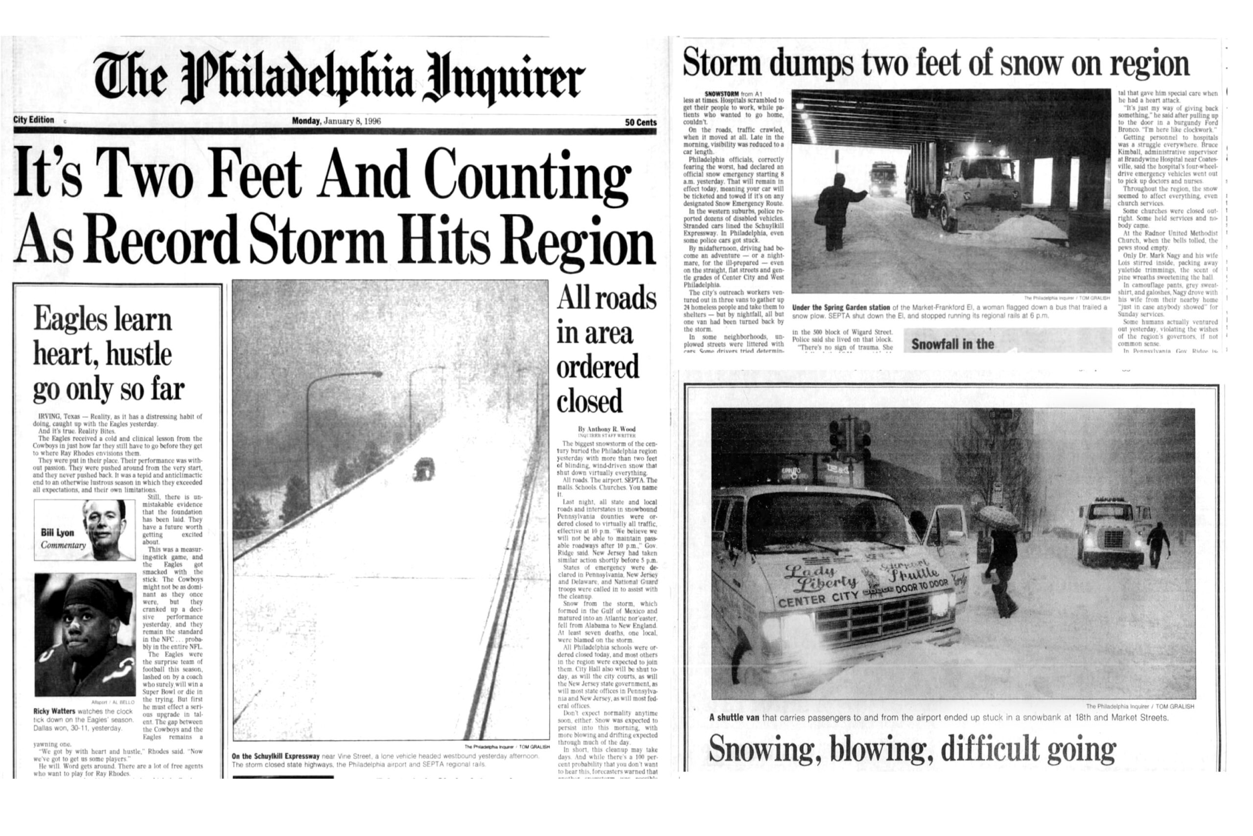Front page and inside photos from The Philadelphia Inquirer. January 8, 1996.