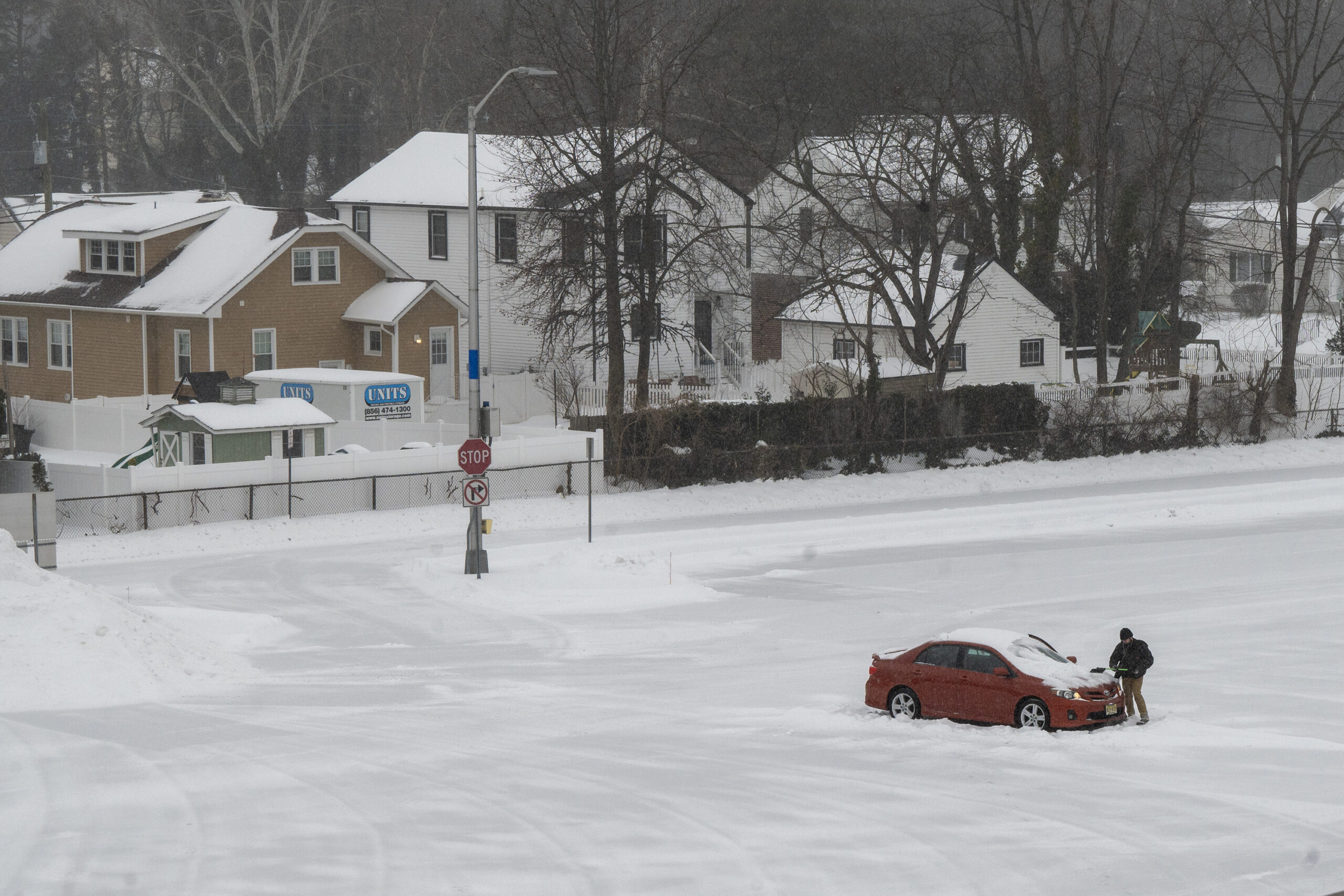 Carmen Roman clears snow off her car at a Cherry Hill Wawa early Sunday morning, Jan. 25, 2026, as heavy snow bands move through the region generating snowfall rates of 1 to 2 inches an hour.