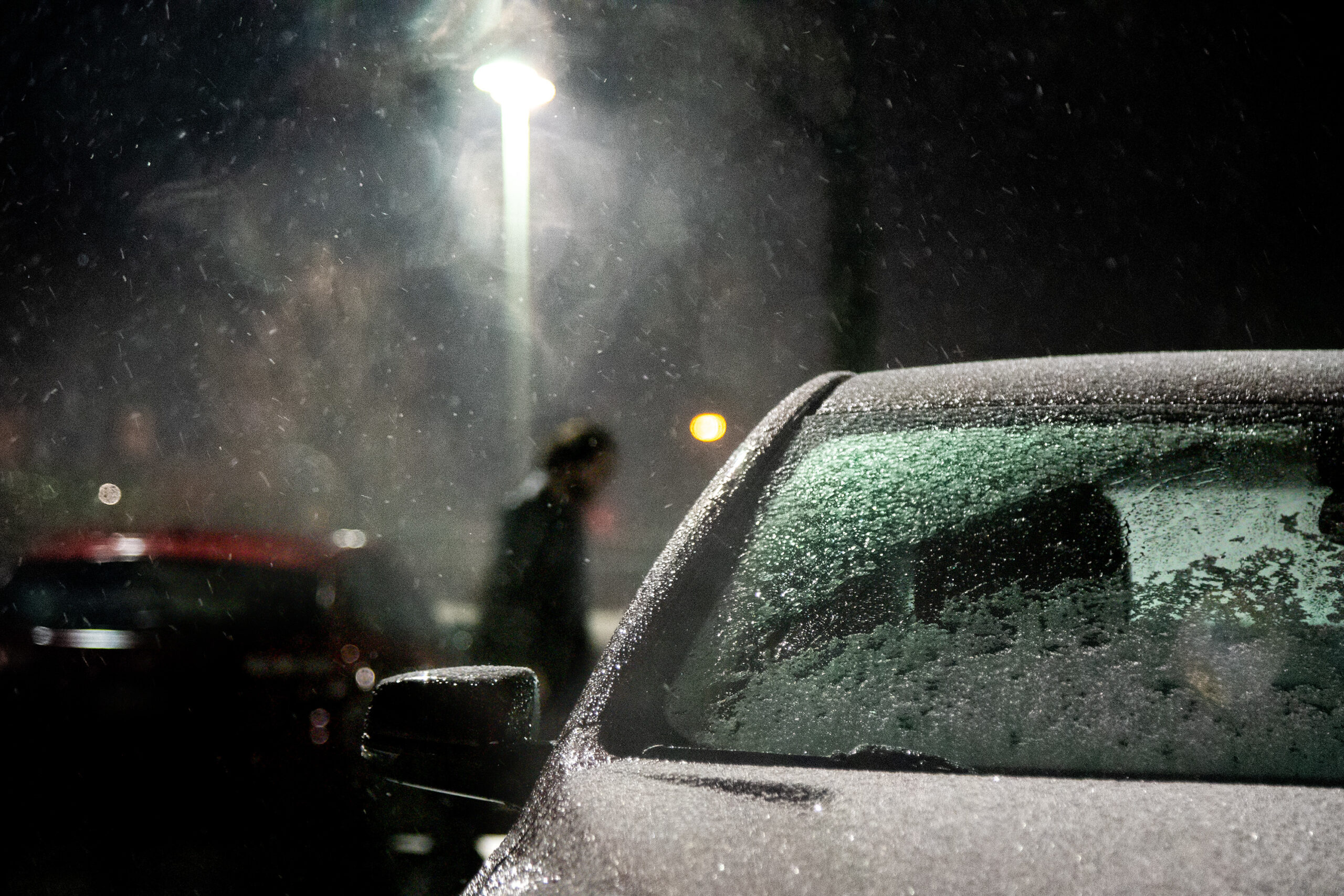 Precipitation — some snow and some rain — falls on cars in a parking lot on City Avenue.