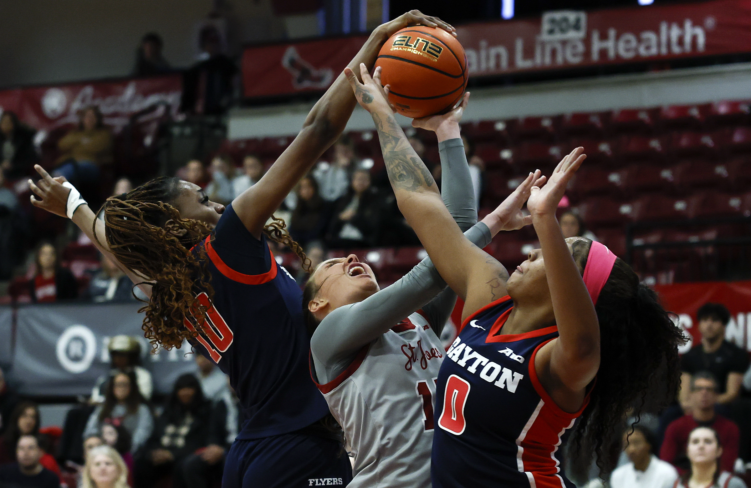 Drexel’s Laine McGurk hits the deck as she fights for a loose ball against Elon last Friday. Drexel won, 68-59. Cardinal O’ Hara’s Megan Rullo (center) is fouled driving to the basket against Neumann Goretti’s Kamora Berry (left) and Reginna Baker during their Catholic League semifinal at Villanova. Rullo scored 22 points in a 51-33 victory. Friends’ Central School’s Zya Small (11) fights for the basketball with Westtown School’s Ishana Sundararajan during the Friends Schools League title game. Phillies third baseman Alec Bohm (center) is silhouetted along with some of his teammates as they wait during a drill at spring training in Clearwater, Fla.