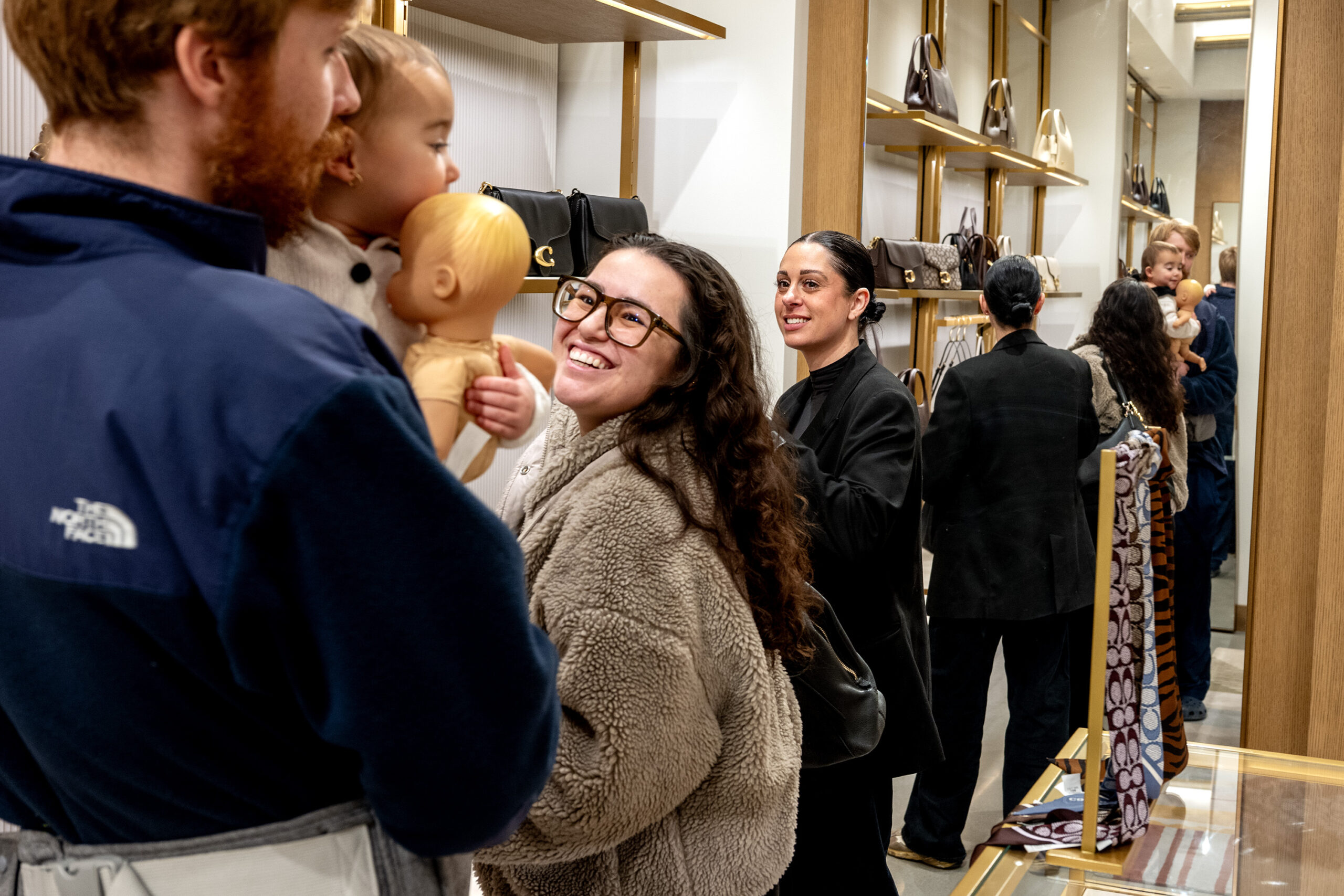 Employee Alex Costa (right) assists Alessandra Bruno as she tries out purses with husband Luke Baur and their 20 month-old daughter Rosalina at the Coach store at the Cherry Hill Mall on Monday.