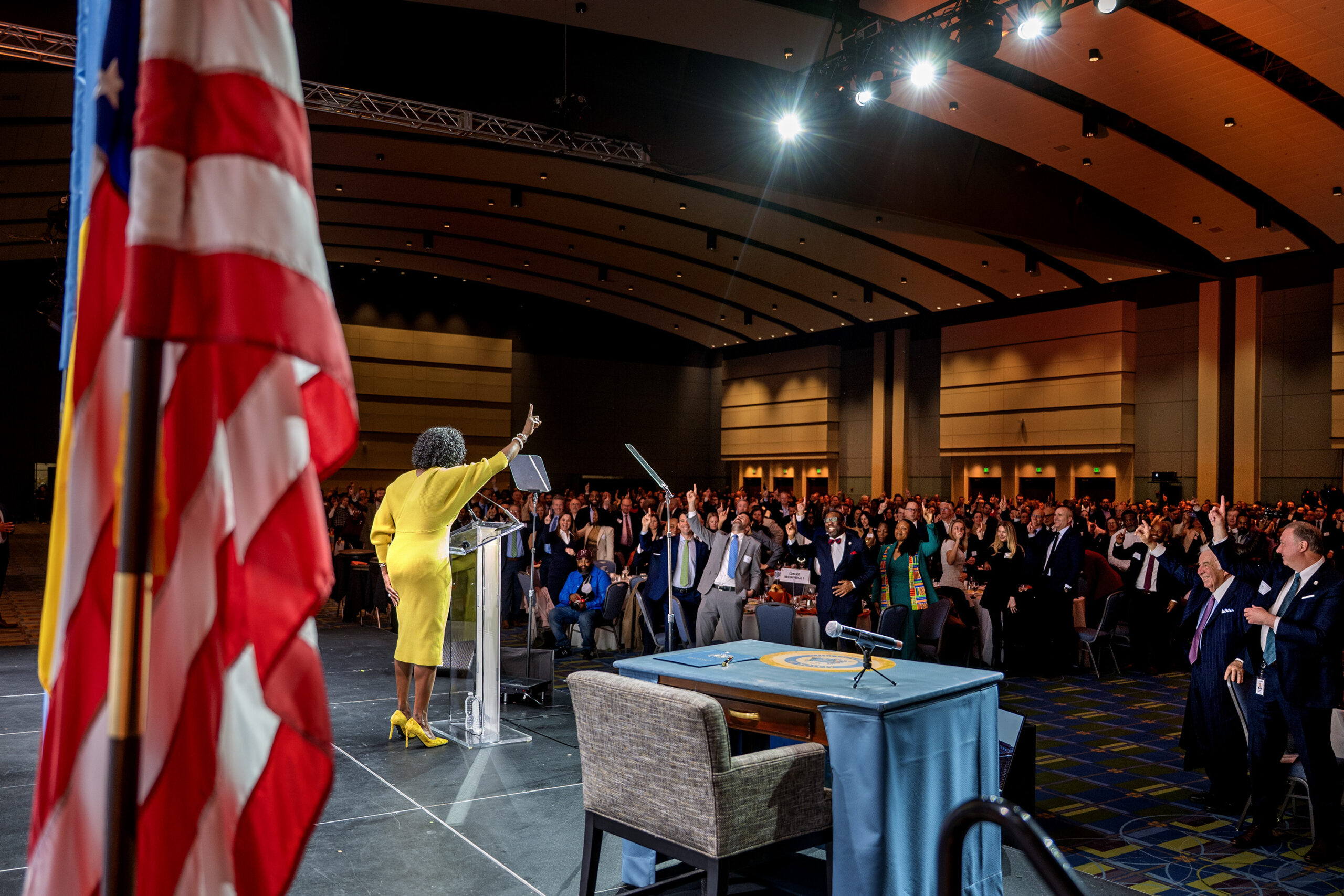 Mayor Cherelle L. Parker has the whole room of business leaders standing with her and her “One Philly” chant as she finishers her keynote address at the Chamber of Commerce for Greater Philadelphia’s Annual Mayoral Luncheon Wednesday.