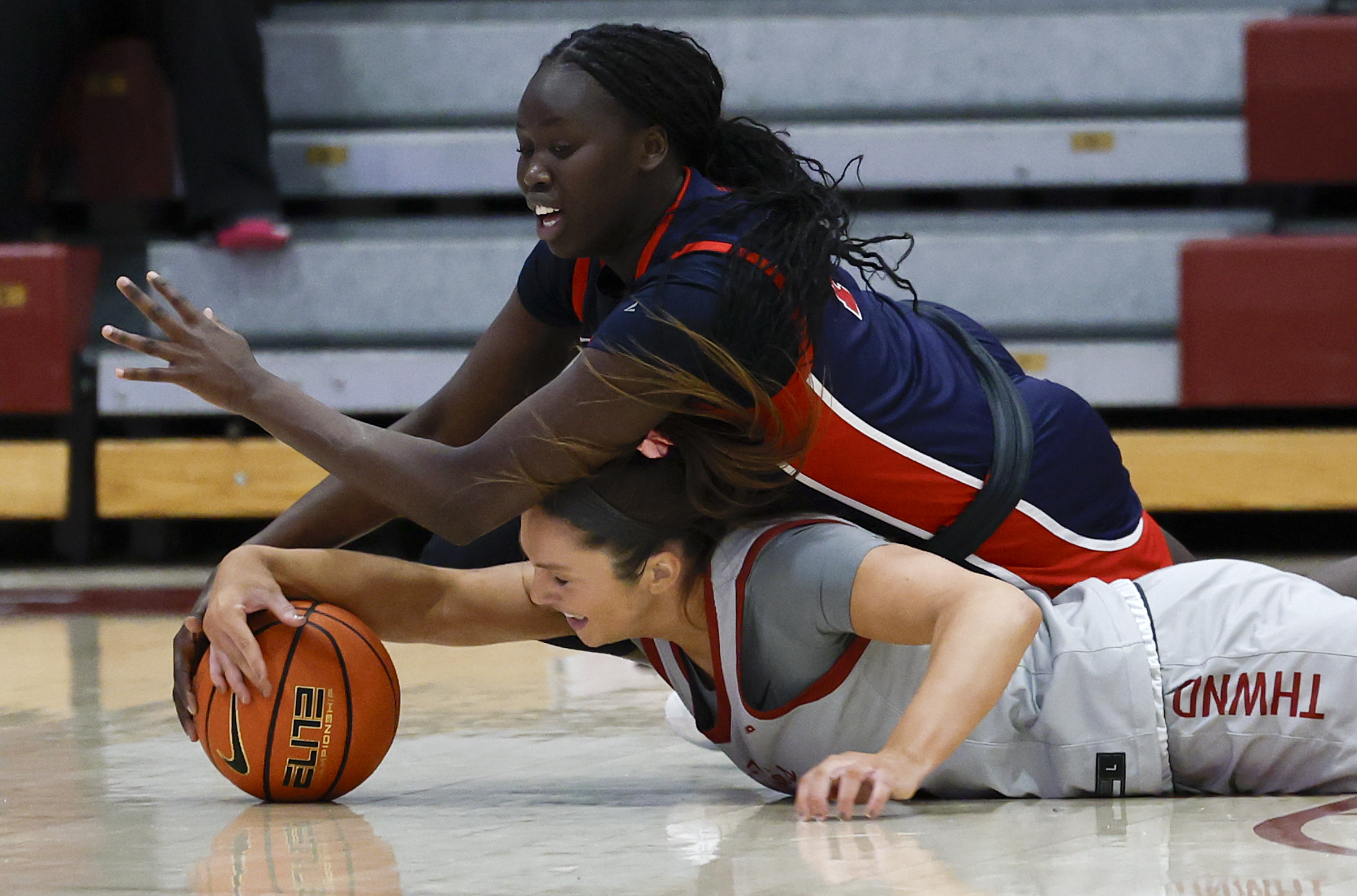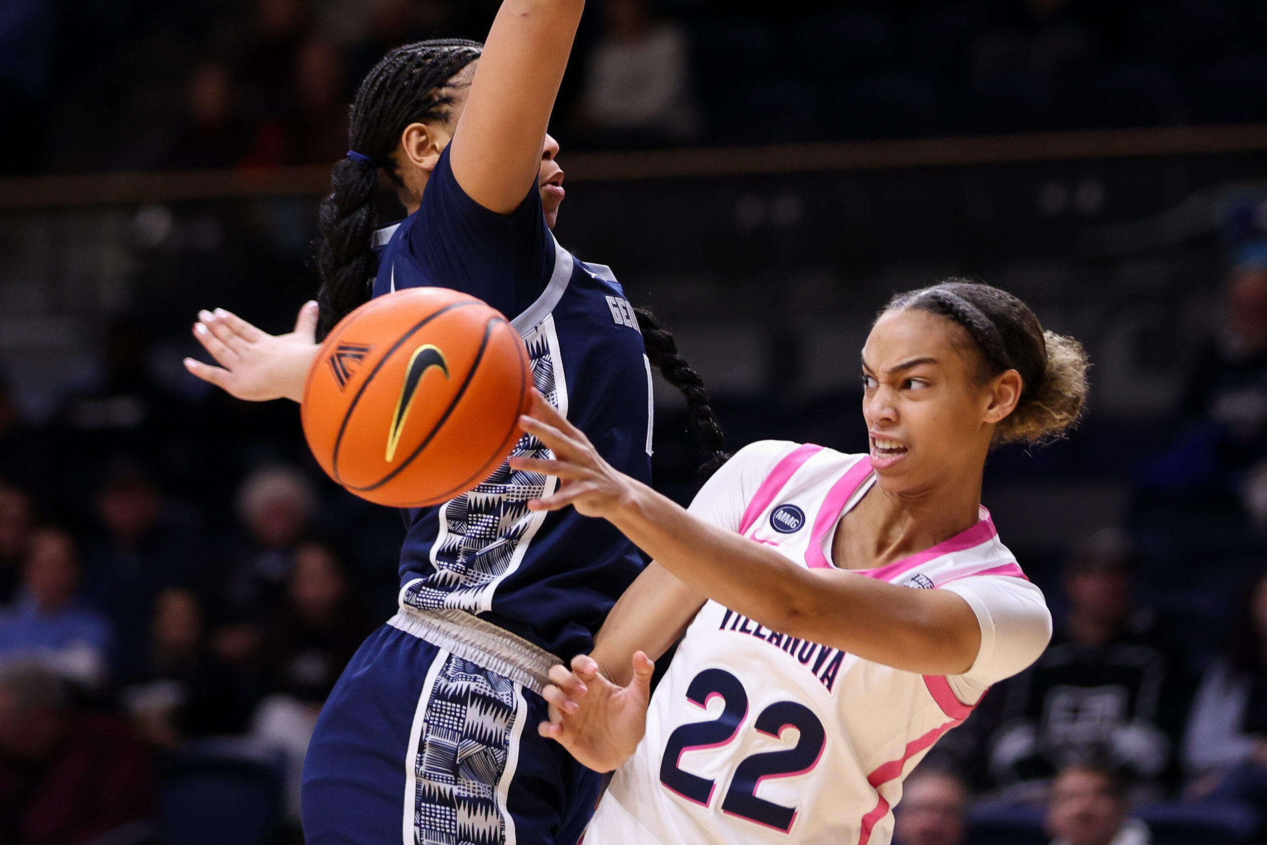 The Archbishop Wood student section cheers before the start of the Vikings’ Catholic League semifinal against Father Judge at the Palestra on Wednesday. Villanova’s Jasmine Bascoe (left) knocks the ball away from UConn’s KK Arnold on Wednesday at the Finneran Pavilion. No. 1 UConn prevailed, 83-69.Neumann Goretti’s Marquis Newson dunks during the final minutes of its win against Bonner Prendergast in the Catholic League semifinals.