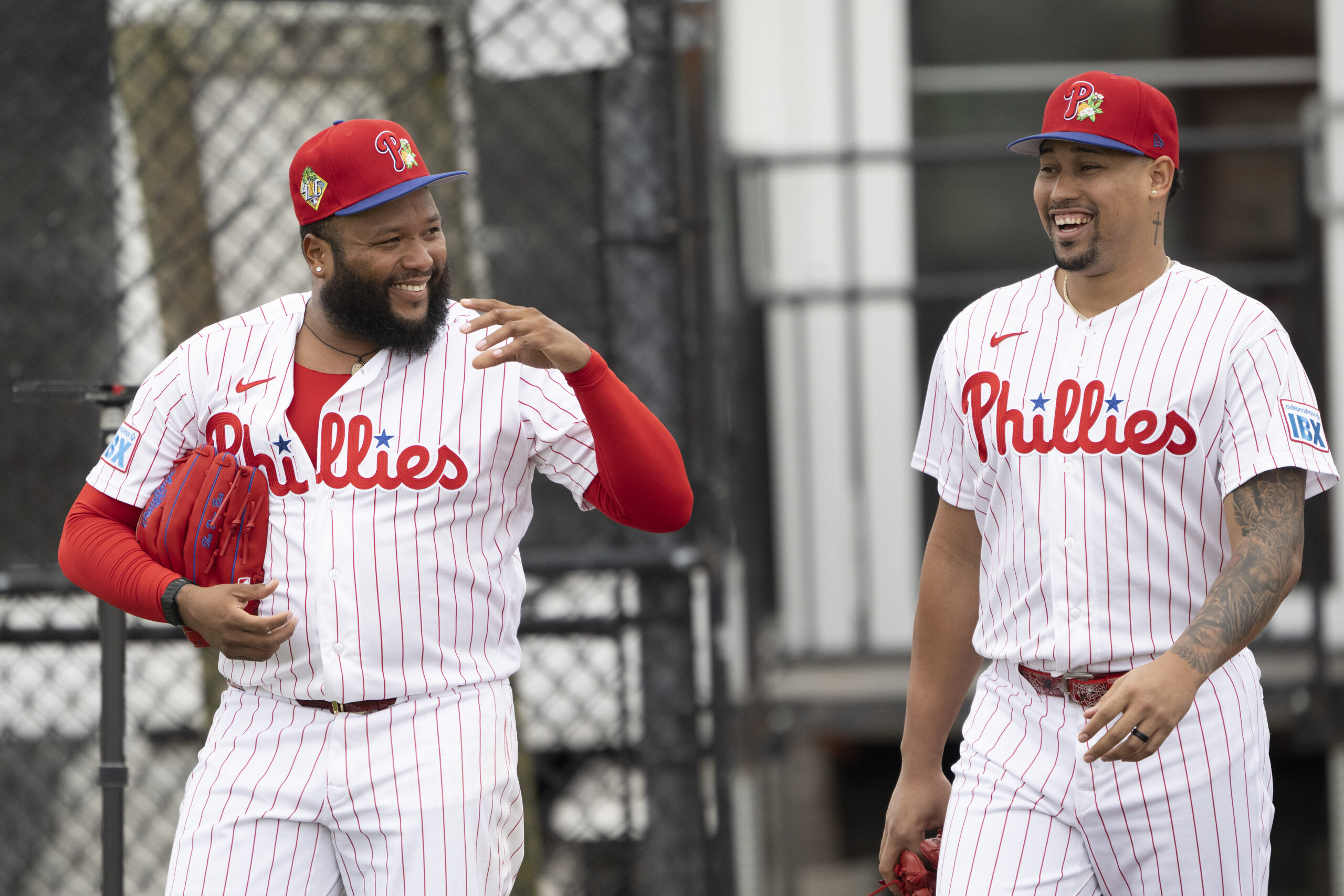 First baseman Bryce Harper (right) interacts with new Phillies bench coach Don Mattingly during the first full-squad workout on Monday. Phillies reliever Jose Alvarado goes through a workout on Saturday. Pitcher Taijuan Walker looks on during a spring training workout on Sunday. Hot feet: Closer Jhoan Duran walks off the mound after a bullpen session during spring training on Sunday.