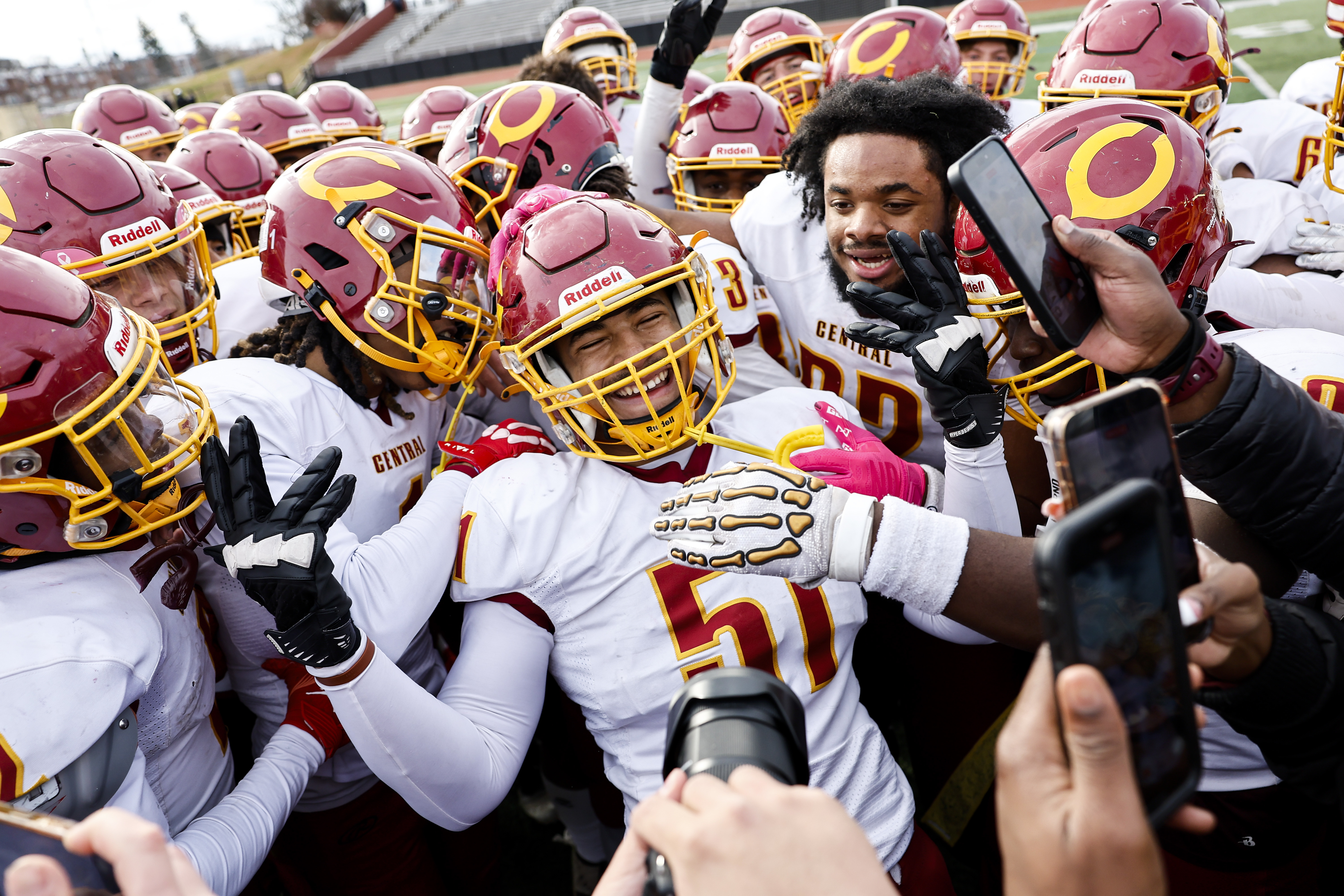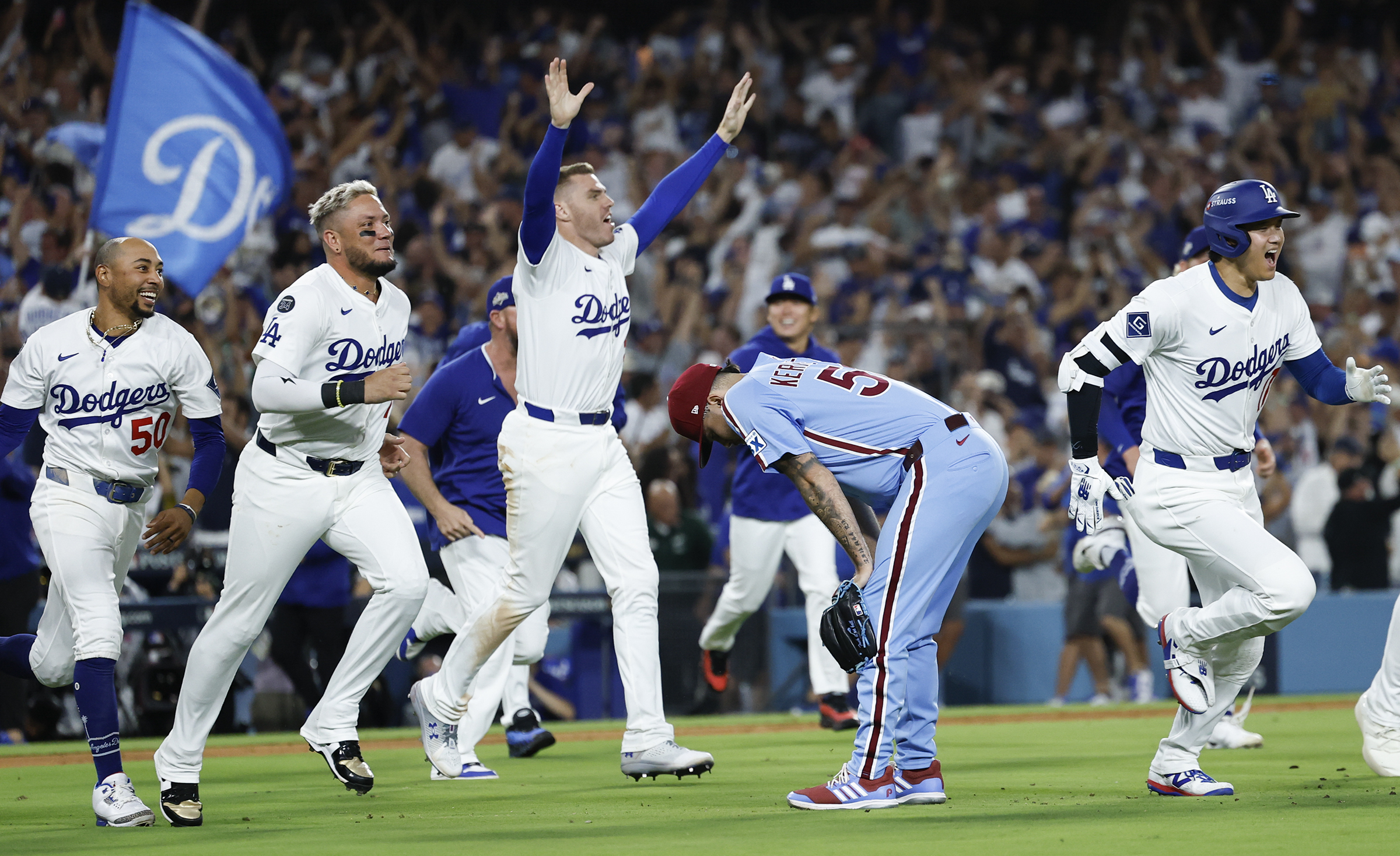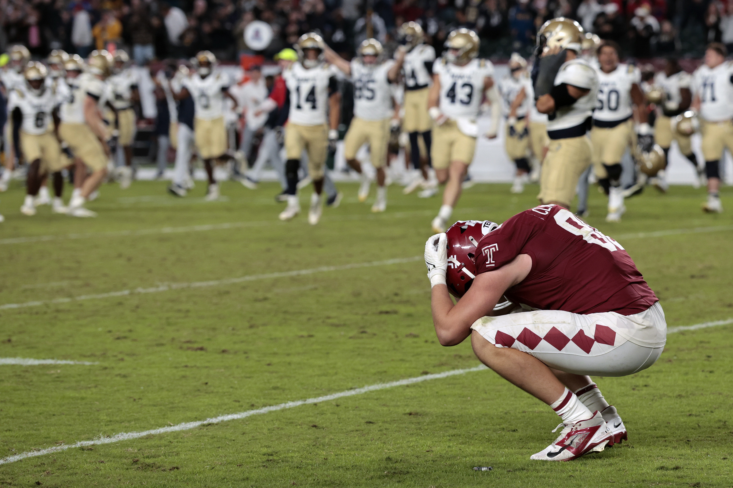 Weston Wilson (left) and Edmundo Sosa console Orion Kerkering after the reliever’s 11th-inning error handed the Dodgers a walk-off win in the NL Division Series. Temple’s Peter Clarke reacts after quarterback Blake Horvath’s 51-yard touchdown run lifted Navy past the Owls, 32-31, on Oct. 11 at the Linc. Au’vion Horton hangs on during the bull riding event at the 8 Seconds Rodeo inside the Liacouras Center on Oct. 11. Flyers captain Sean Couturier leaps over Florida Panthers goaltender Daniil Tarasov during the team’s 5-2 win over the defending champs on Oct. 13.The Eagles defense celebrates after linebacker Jalyx Hunt’s interception return for a touchdown against the Minnesota Vikings on Oct. 19. Eric McGarry of Manayunk talks to his wife, Gwen Jones, on the phone after finishing the Philadelphia Marathon on Nov. 23. It was his first marathon and he was most excited about running through his neighborhood, where his wife and friends were there to cheer him on.Central High’s players celebrate after they won the annual Thanksgiving Day rivalry game against Northeast, 22-14.