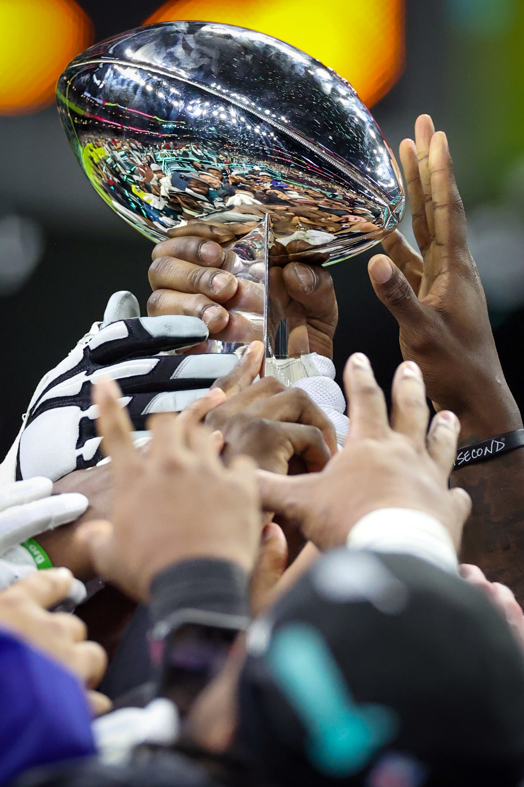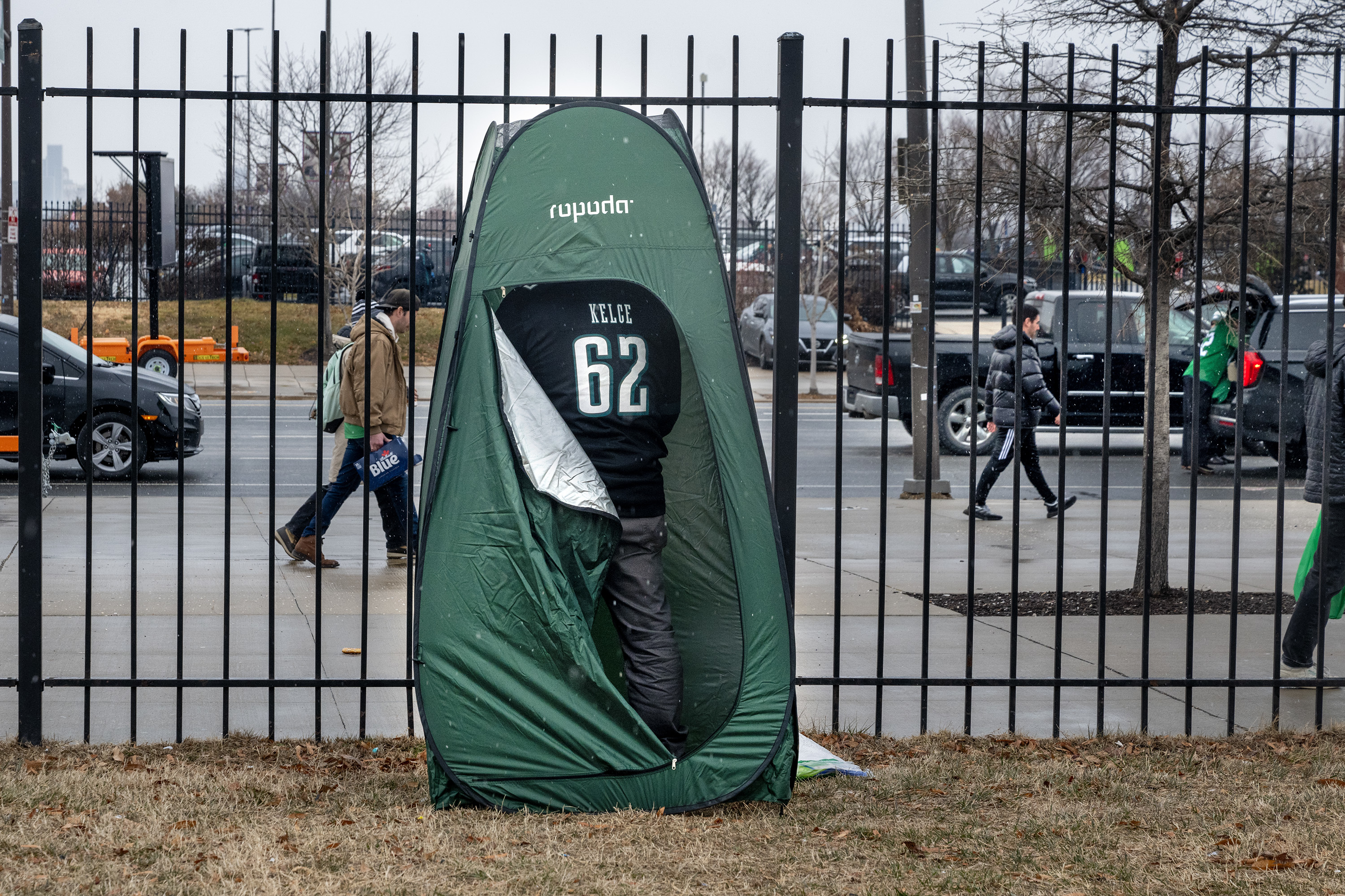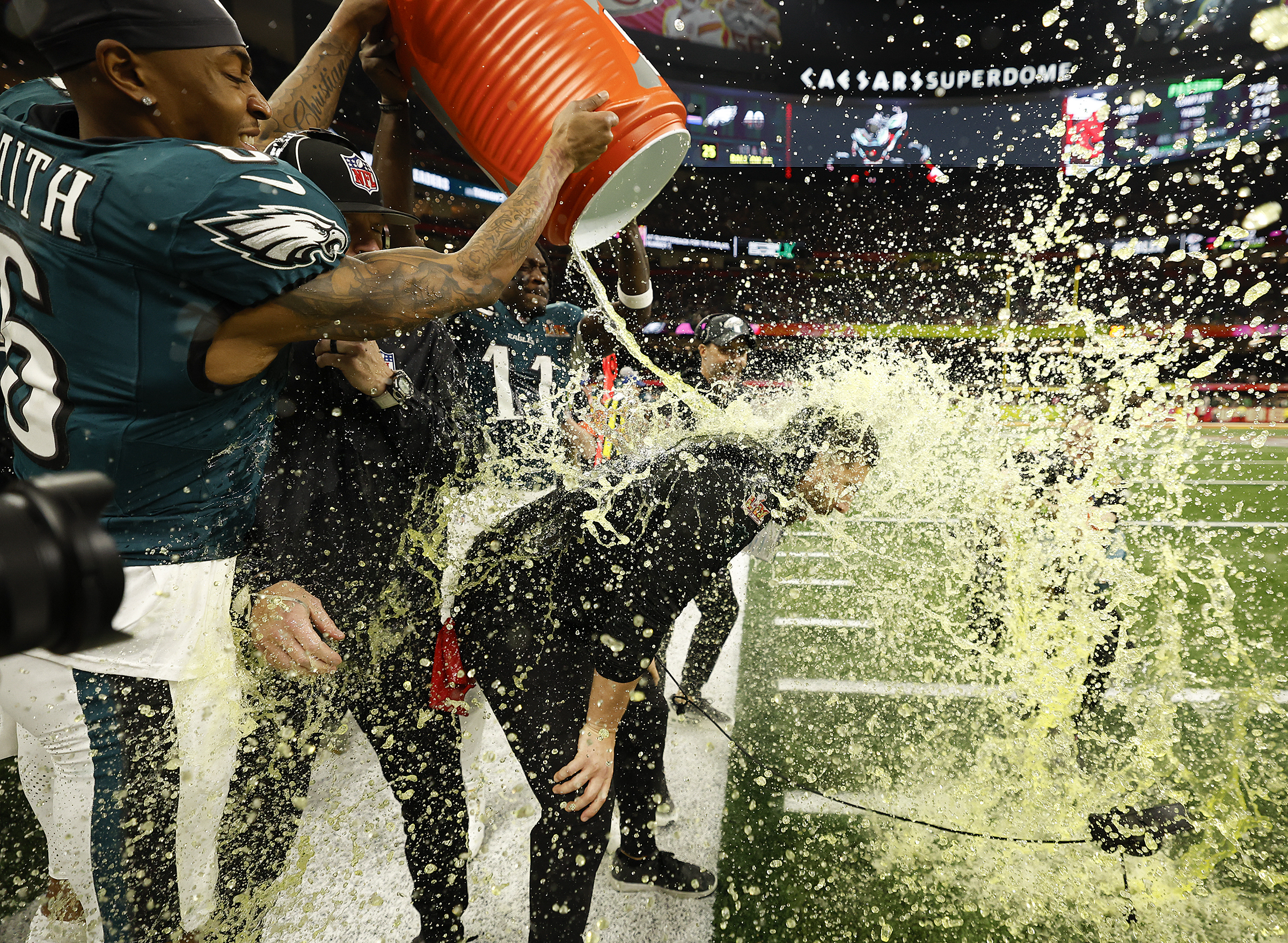 A tailgater makes use of a personal porta-potty in a Lincoln Financial Field parking lot on Jan. 19. Eagles coach Nick Sirianni gets a Gatorade shower from DeVonta Smith and A.J. Brown late in the Super Bowl rout of the Kansas City Chiefs.Eagles players are reflected in the Lombardi Trophy after the 40-22 win against the Chiefs in Super Bowl LIX on Feb. 9.Fireworks fly at the Art Museum at the conclusion of the Super Bowl LIX victory parade on Feb. 14.Imhotep Charter star RJ Smith (1) celebrates with his teammates after they beat Samuel Fels High, 71-66, in the Public League championship game on Feb. 23. Fans sramble to avoid a foul ball during a Phillies spring training game against the Tampa Bay Rays on Feb. 25 in Port Charlotte, Fla.St. Joseph’s guard Laura Ziegler (left) is mobbed by Paula Maurina (right) and teammates after her game-winning shot against Richmond in the Atlantic 10 semifinals on March 8.La Salle’s retiring basketball coach, Fran Dunphy (left), receives a six-pack of beer and other mementos from St. Joseph’s coach Billy Lange on March 8.