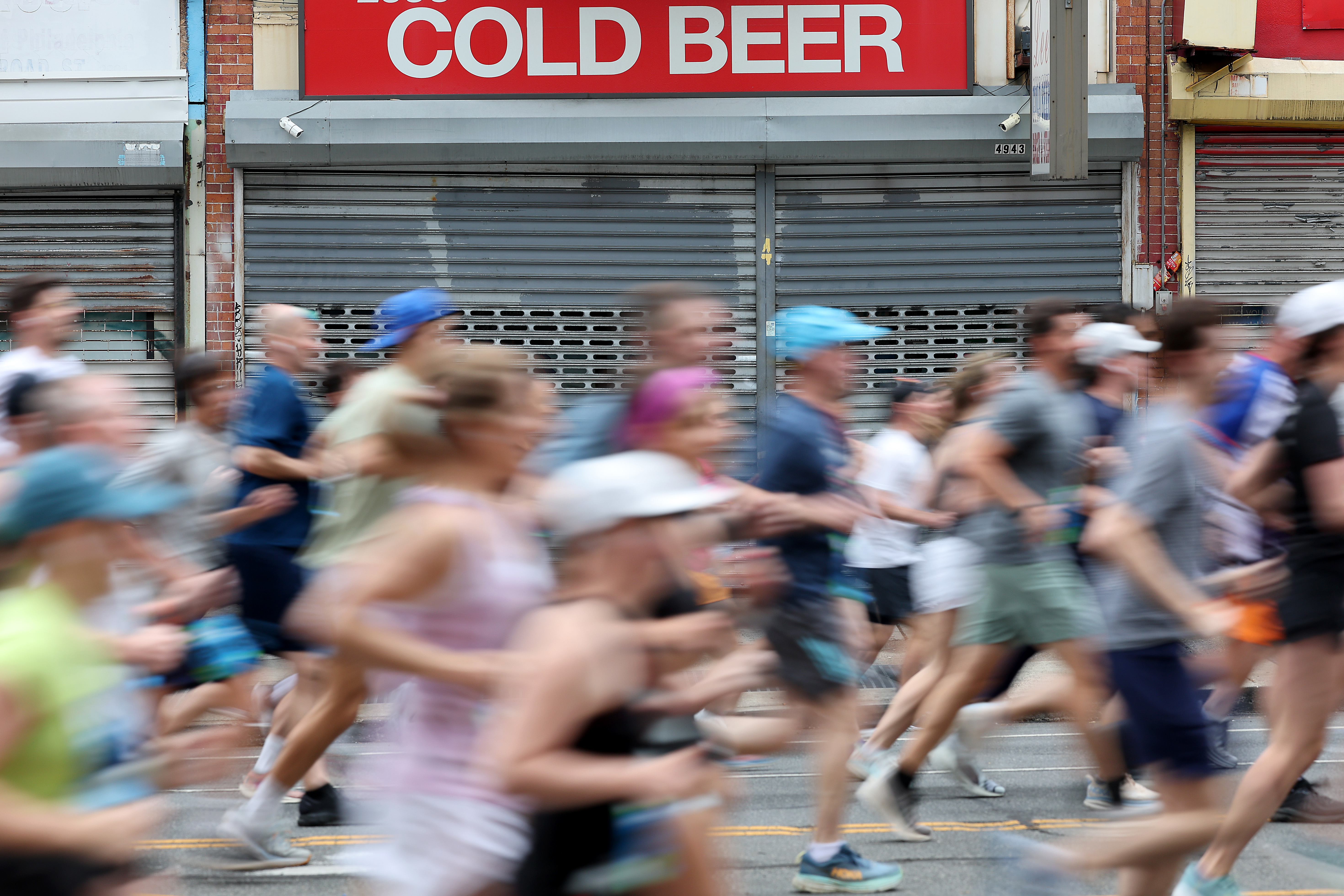 Runners pass a beer sign near Windrim Avenue during the Independence Blue Cross Broad Street Run on May 4.PGA player Keegan Bradley hits a challenging shot from a hill at the par-4 17th hole during the Truist Championship at the Philadelphia Cricket Club on May 9. Bradley shot a double bogey on the hole.