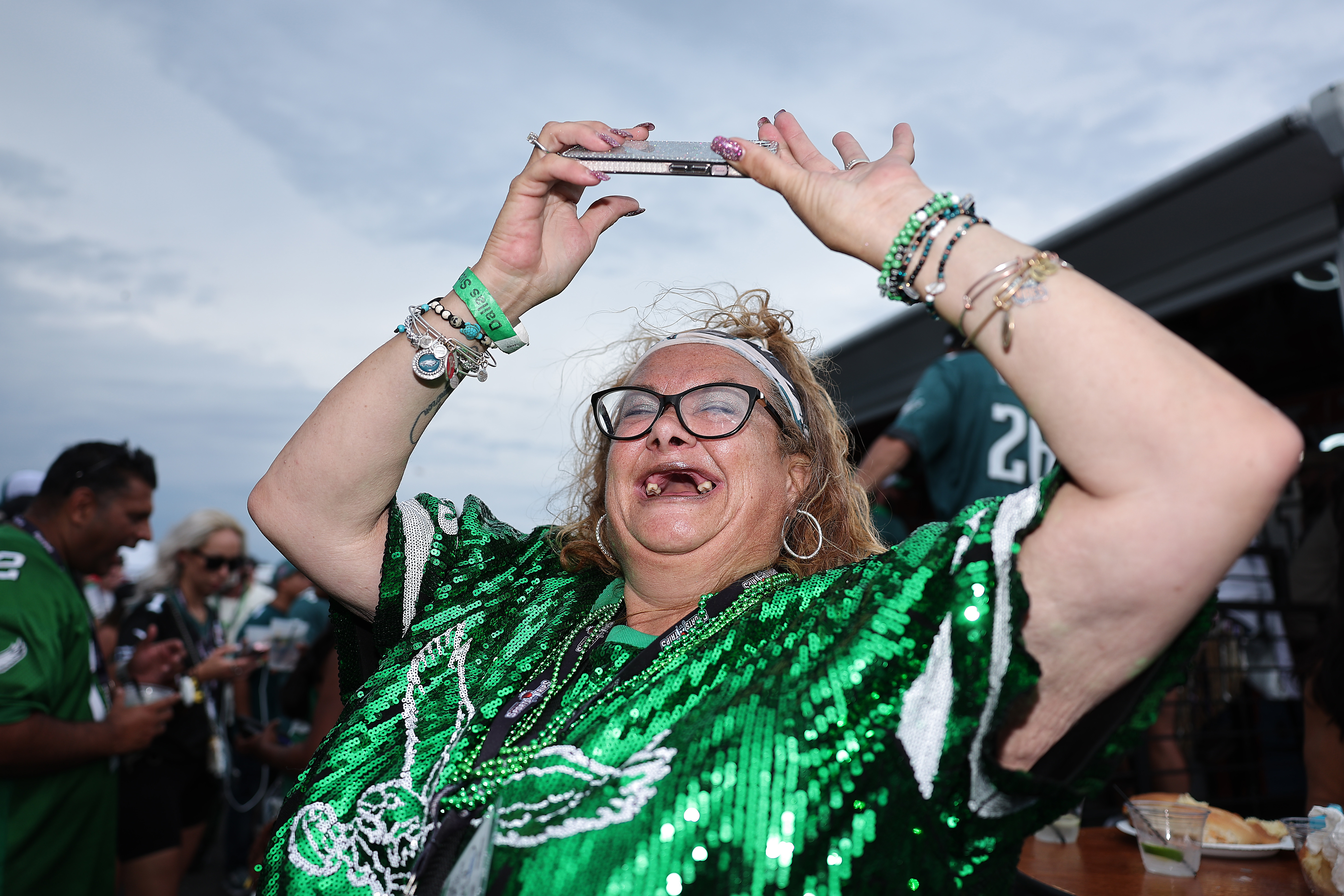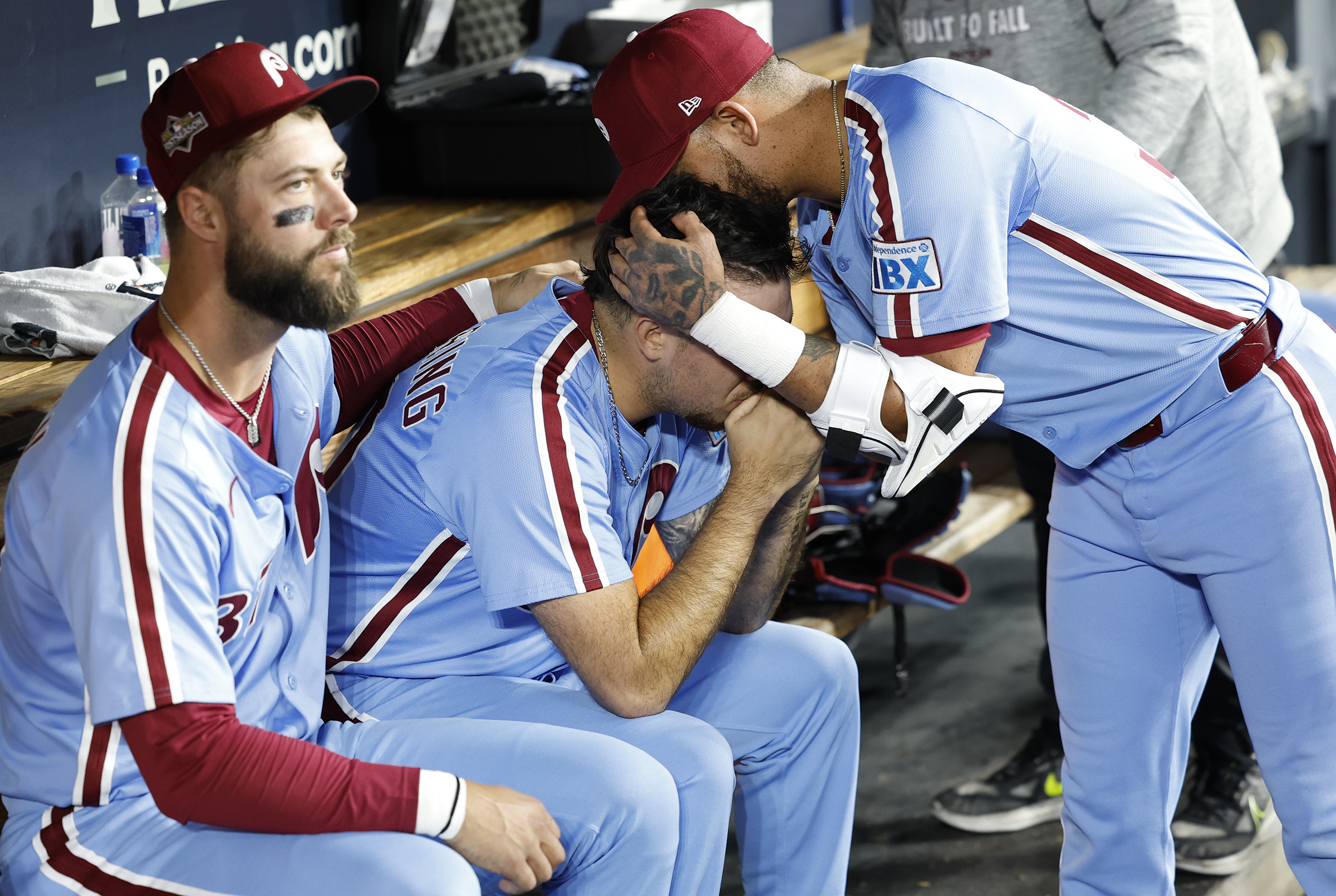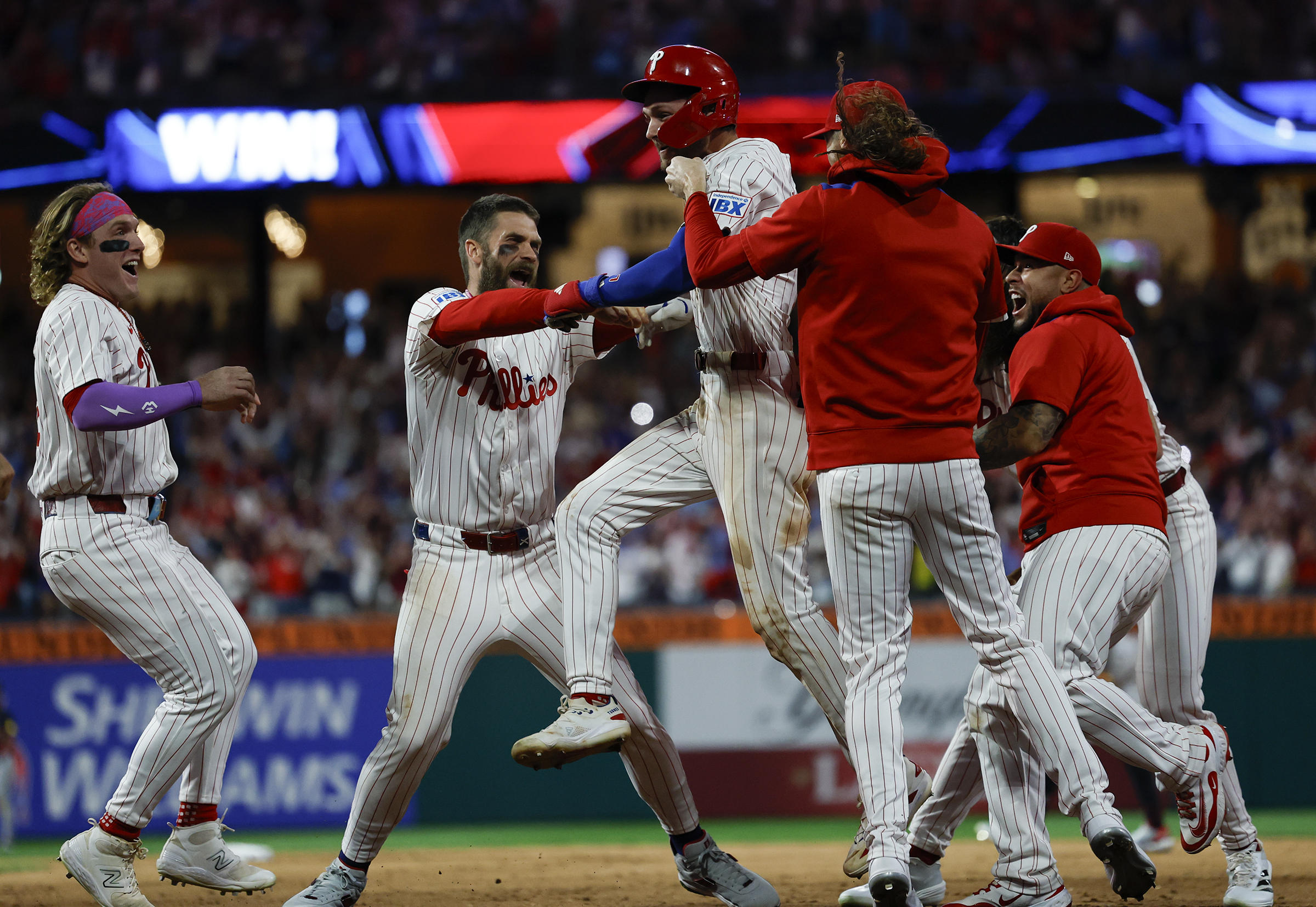 Phillies shortstop Trea Turner leaps into the celebration after his game-winning hit against the Braves. The Phillies beat Atlanta, 3-2, in 10 innings on Aug. 30.Wendy Cooper of Reading takes in the scene at the TrueFan tailgate party before the Eagles played the Cowboys at Lincoln Financial Field on Sept. 4.Phillies outfielders Nick Castellanos and Harrison Bader greet each other with their ring fingers before a game against the Mets on Sept. 9.Kyle Schwarber acknowledges the crowd at Citizens Bank Park on Sept. 9 after he hit his 50th home run of the season in a game against the Mets.Phillies reliever Orion Kerkering shows his dejection as the Dodgers celebrate their series-clinching playoff win on Oct. 9 in Los Angeles.