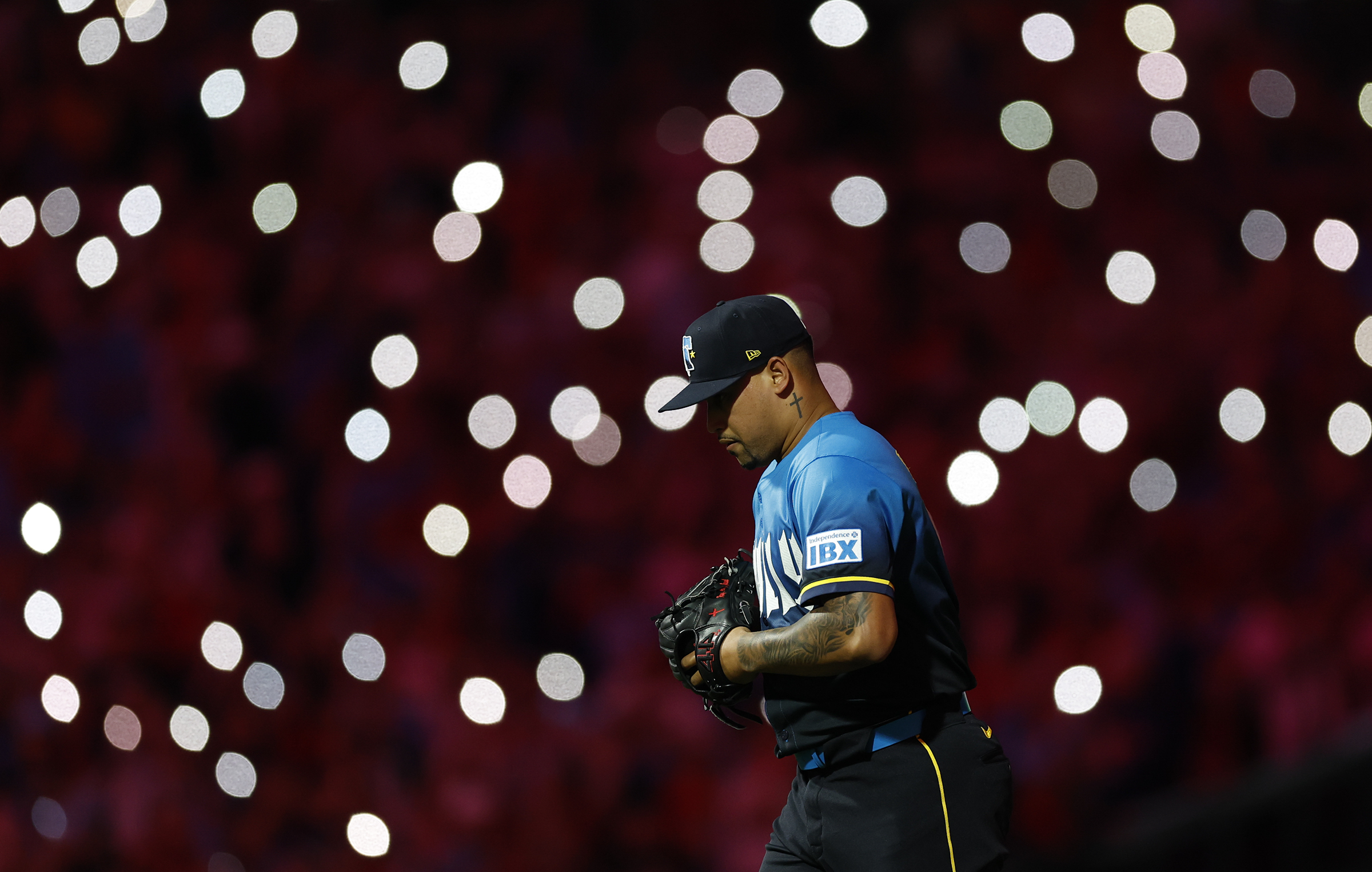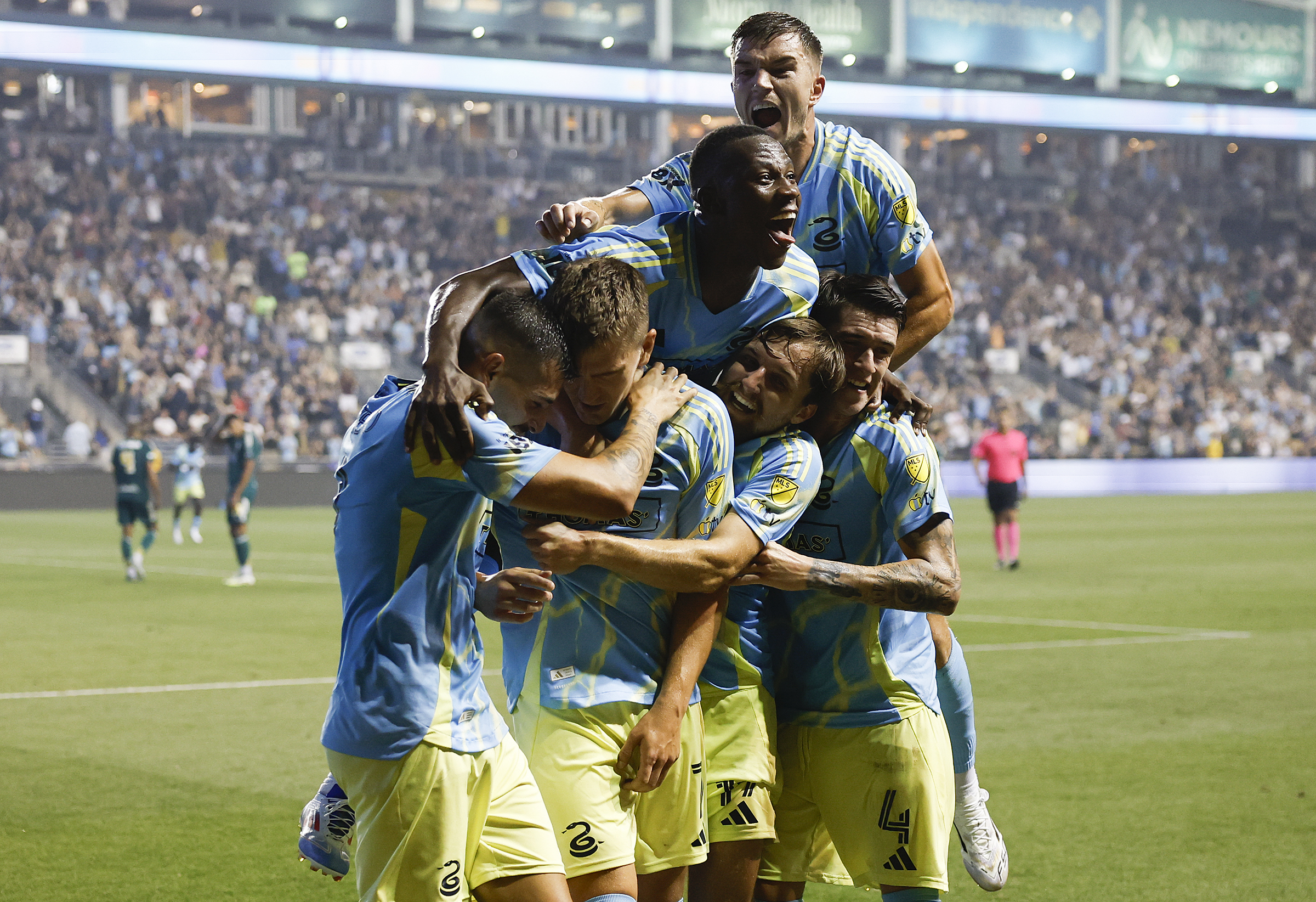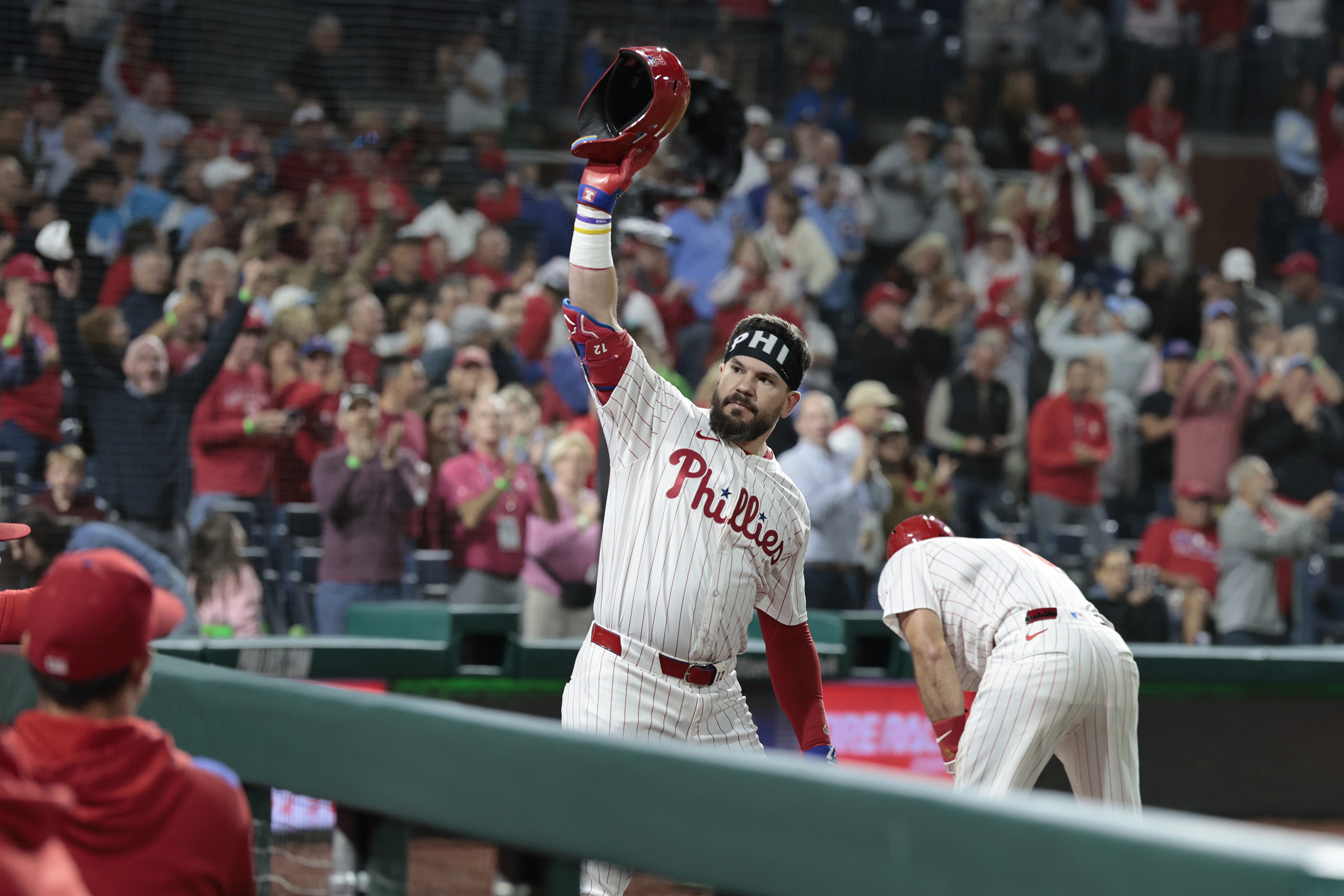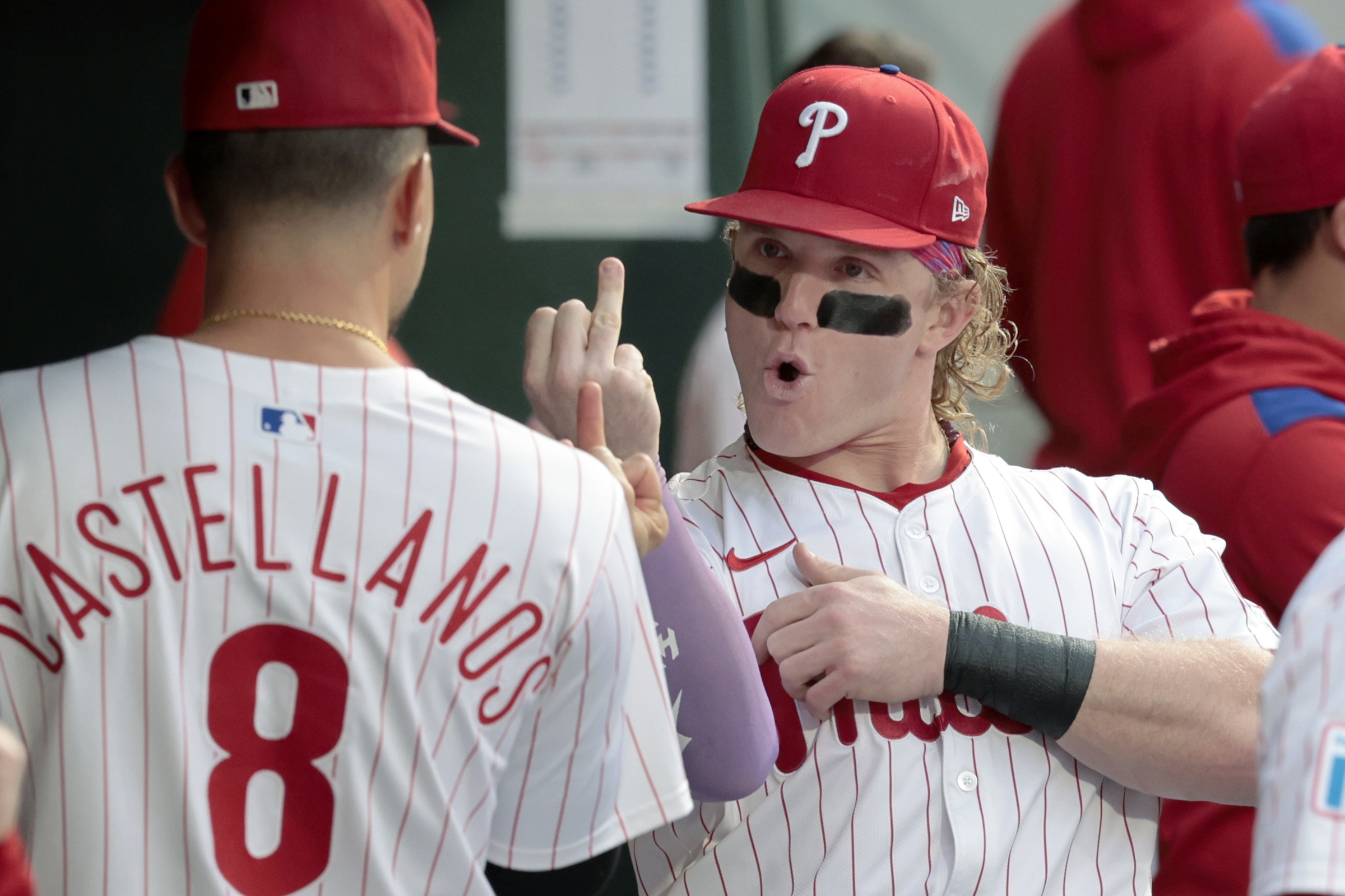 Phillies shortstop Trea Turner leaps into the celebration after his game-winning hit against the Braves. The Phillies beat Atlanta, 3-2, in 10 innings on Aug. 30.Wendy Cooper of Reading takes in the scene at the TrueFan tailgate party before the Eagles played the Cowboys at Lincoln Financial Field on Sept. 4.Phillies outfielders Nick Castellanos and Harrison Bader greet each other with their ring fingers before a game against the Mets on Sept. 9.Kyle Schwarber acknowledges the crowd at Citizens Bank Park on Sept. 9 after he hit his 50th home run of the season in a game against the Mets.Phillies reliever Orion Kerkering shows his dejection as the Dodgers celebrate their series-clinching playoff win on Oct. 9 in Los Angeles.