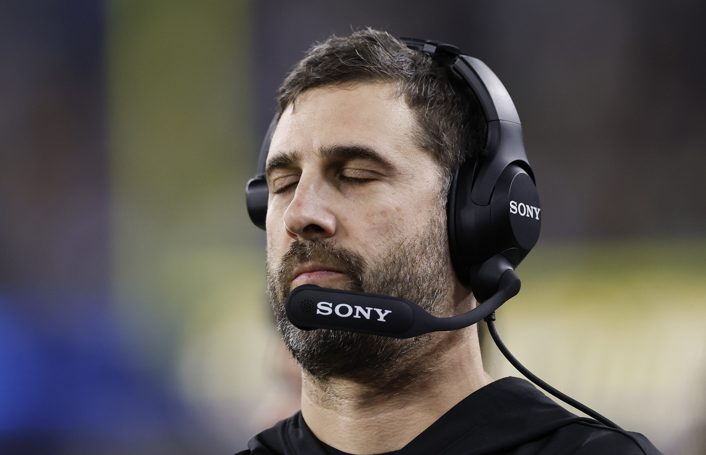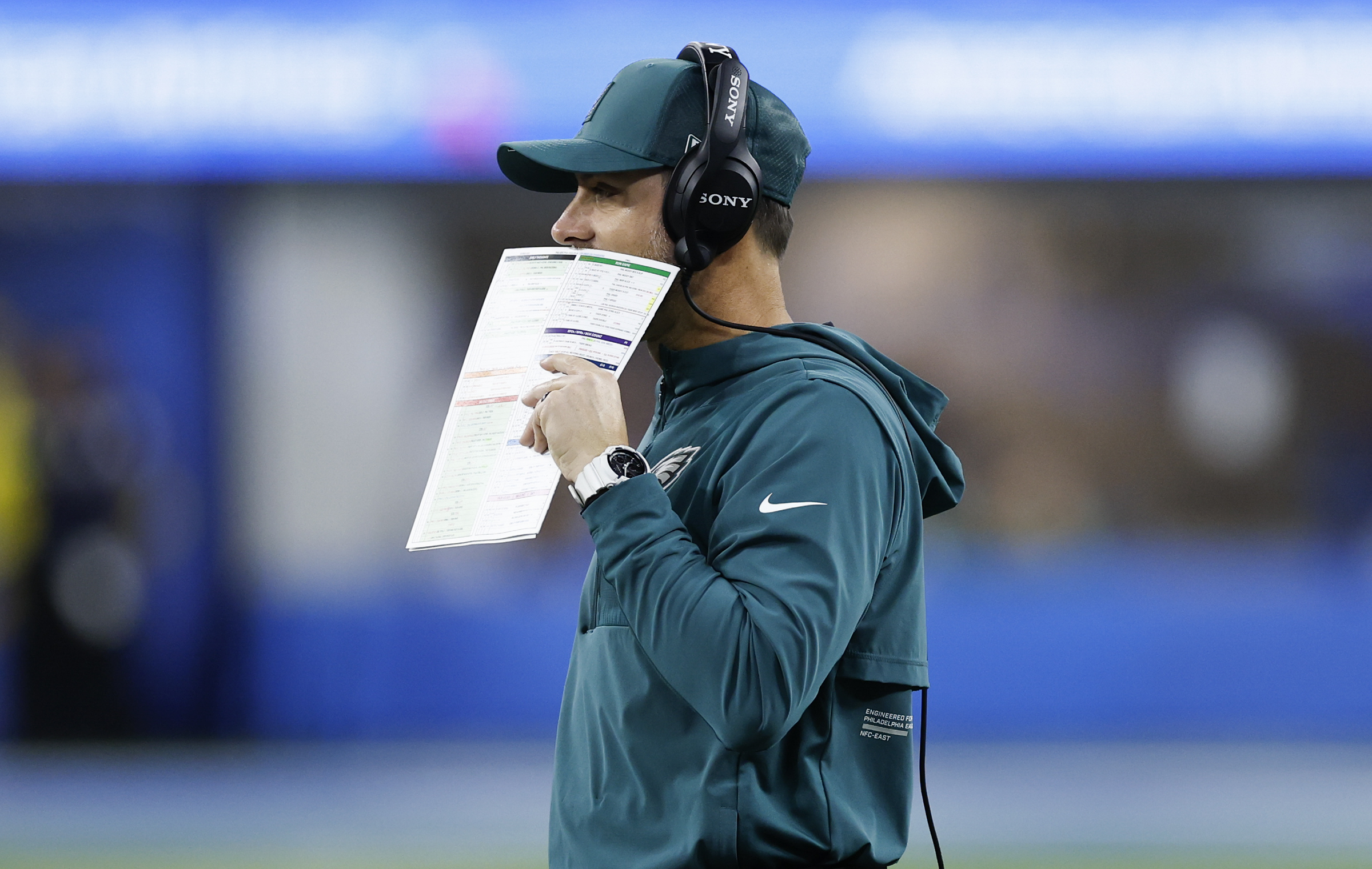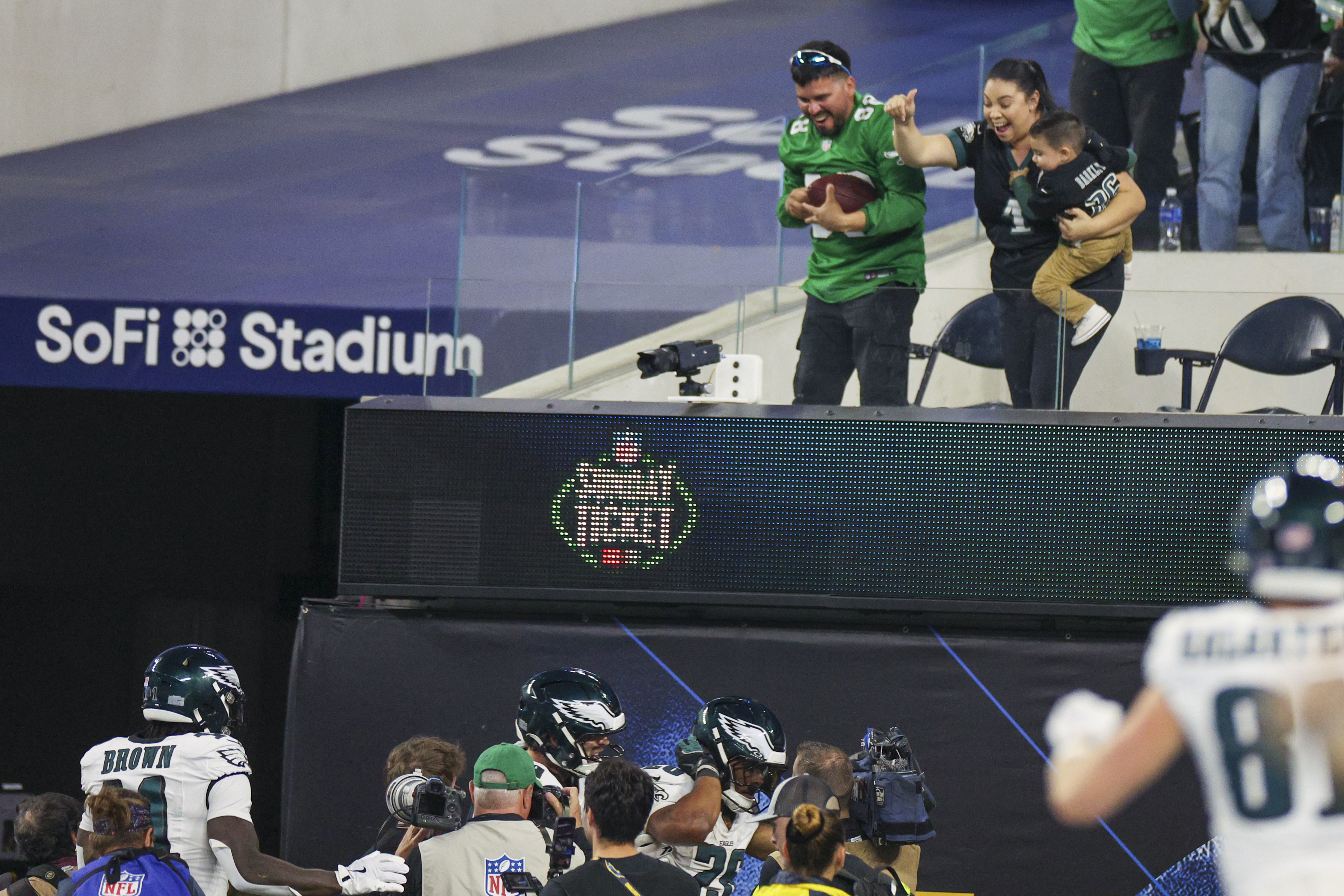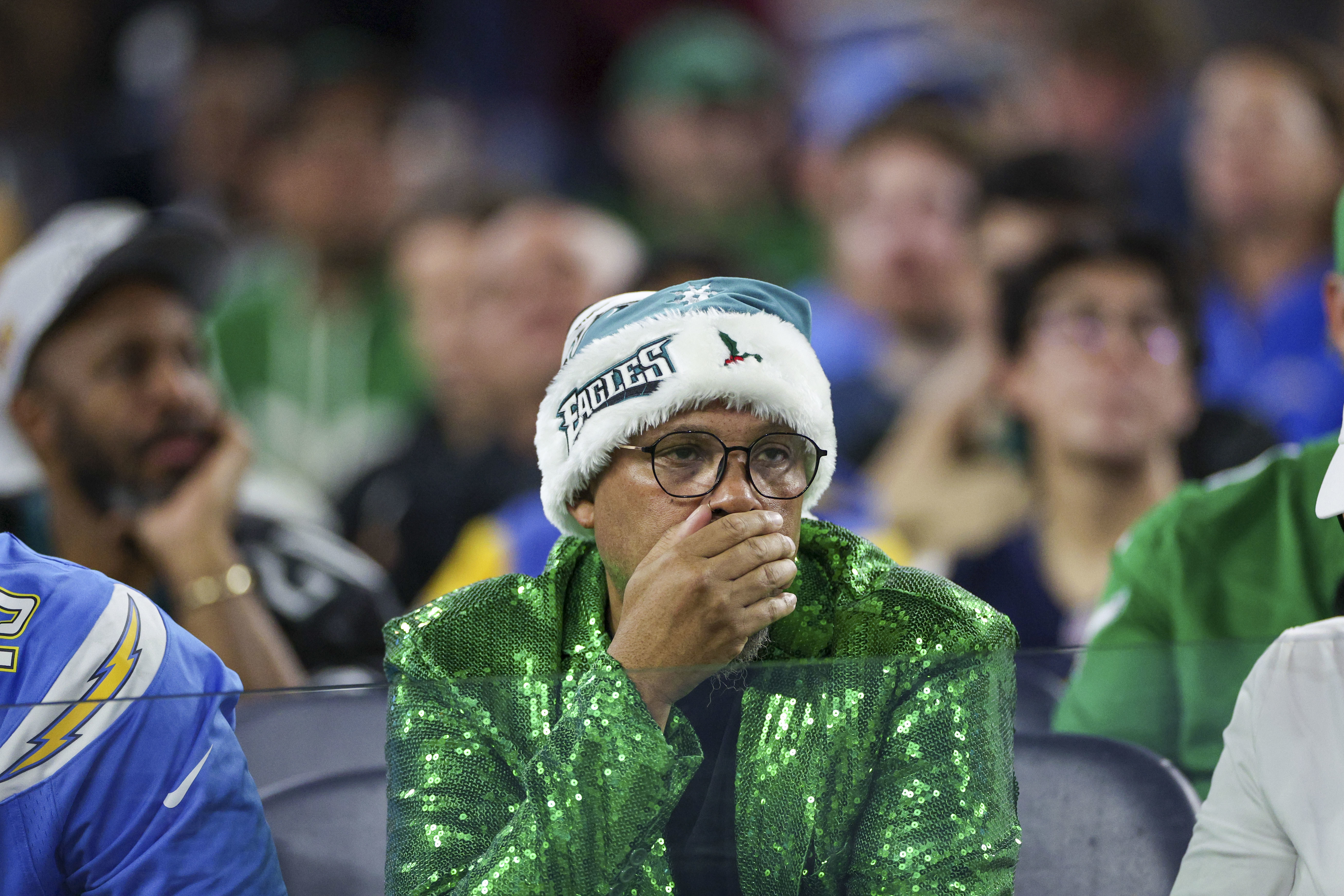 Eagles wide receiver A.J. Brown can’t pull in a pass in overtime as Donte Jackson of the Chargers defends him. Eagles running back Saquon Barkley tosses the football to a fan after scoring on a 52-yard run against the Chargers. Eagles defensive tackle Jordan Davis (top) and linebacker Zack Baun sack Justin Herbert in the third quarter at SoFi Stadium. Dressed for the holidays, an Eagles fan watches the loss to the Chargers in the third quarter at SoFi Stadium. Eagles wide receiver DeVonta Smith pulls in a catch as Chargers linebacker Denzel Perryman tackles him. Embattled Eagles offensive coordinator Kevin Patullo talks into his play chart during the Monday night loss in Inglewood, Calif.An Eagles fan makes his feelings known with a sign during the team’s loss to the Chargers. Eagles coach Nick Sirianni absorbing the defeat at SoFi Stadium.