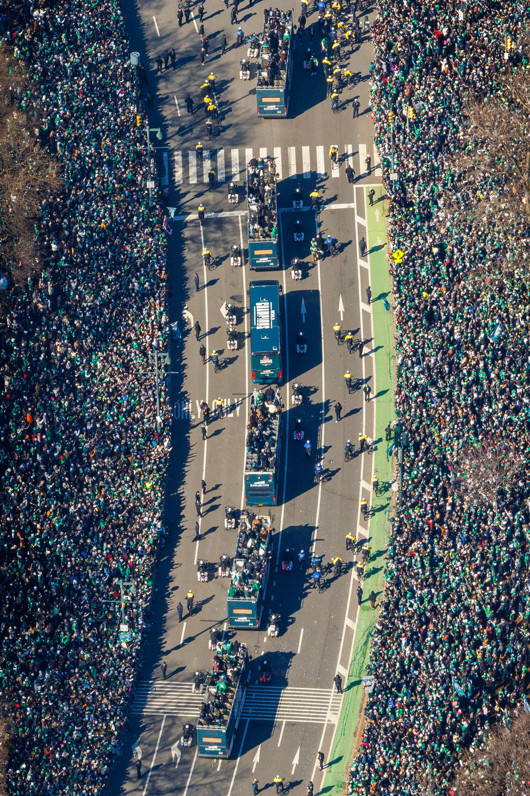 Saturnalian captain Thomas Dougherty dances on Second Street in Philadelphia during the Mummers after-party on New Year’s Day.Under the watchful eye of the eagle statue at the Wanamaker Building on Jan. 10, Bob Koherr, 64, and Walter Batt, 62, of Center City, embrace, remembering the time they spent together there.Lloyd Morgan (right) and a friend carry a cutout of President Donald Trump on a surfboard through Washington on Jan. 19, the day before Trump’s second inauguration.Saquon Barkley celebrates as he nears the end zone on a 78-yard touchdown run during the fourth quarter of the Eagles’ playoff game against the Los Angeles Rams on Jan. 19. The Eagles eked out a 28-22 win.Eagles players lift the Lombardi Trophy after their 40-22 Super Bowl LIX victory over the Kansas City Chiefs on Feb. 9 in New Orleans.Saquon Barkley leaps into the end zone for one of his three touchdowns against the Washington Commanders in the NFC championship game at Lincoln Financial Field on Jan. 26. The Eagles won 55-23 to clinch their second Super Bowl appearance in three seasons.Family and friends skate on the ice rink that Fox Chase resident David Bara built in his backyard last winter. “There aren’t many people in Philly who are crazy enough to do what I do,” Bara said.Jada Pichardo produced Pennsauken’s first state wrestling title when the senior won the 126-pound division at the New Jersey State Interscholastic Athletic Association championships in March.Emergency workers battle a fire at the 7200 block of Calvert Street in Northeast Philadelphia after a medical jet crashed nearby on Jan. 31.National Transportation Safety Board officials walk through debris from the medical jet crash along Cottman Avenue near Roosevelt Boulevard.Marisol Nelson was among the hundreds of thousands of Eagles fans who lined Philly streets on Feb. 14 for the Birds’ Super Bowl victory parade.A sea of fans greets Eagles team buses as they coast along the Benjamin Franklin Parkway during the Super Bowl victory parade.St. Joseph’s guard Laura Ziegler (center) celebrates with teammates after hitting the game-winning shot against Richmond in the Atlantic 10 tournament semifinals in March.Actor and rapper Will Smith, with mother Caroline Bright, attends a street renaming ceremony in West Philadelphia in March. The city renamed the 2000 block of North 59th Street “Will Smith Way.”Gabby Thomas poses for photos with fans after racing in the women’s 100 meters during the Grand Slam Track meet at Franklin Field on June 1.