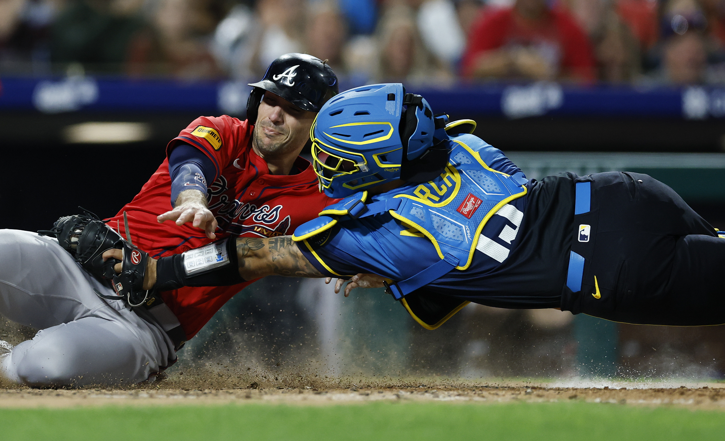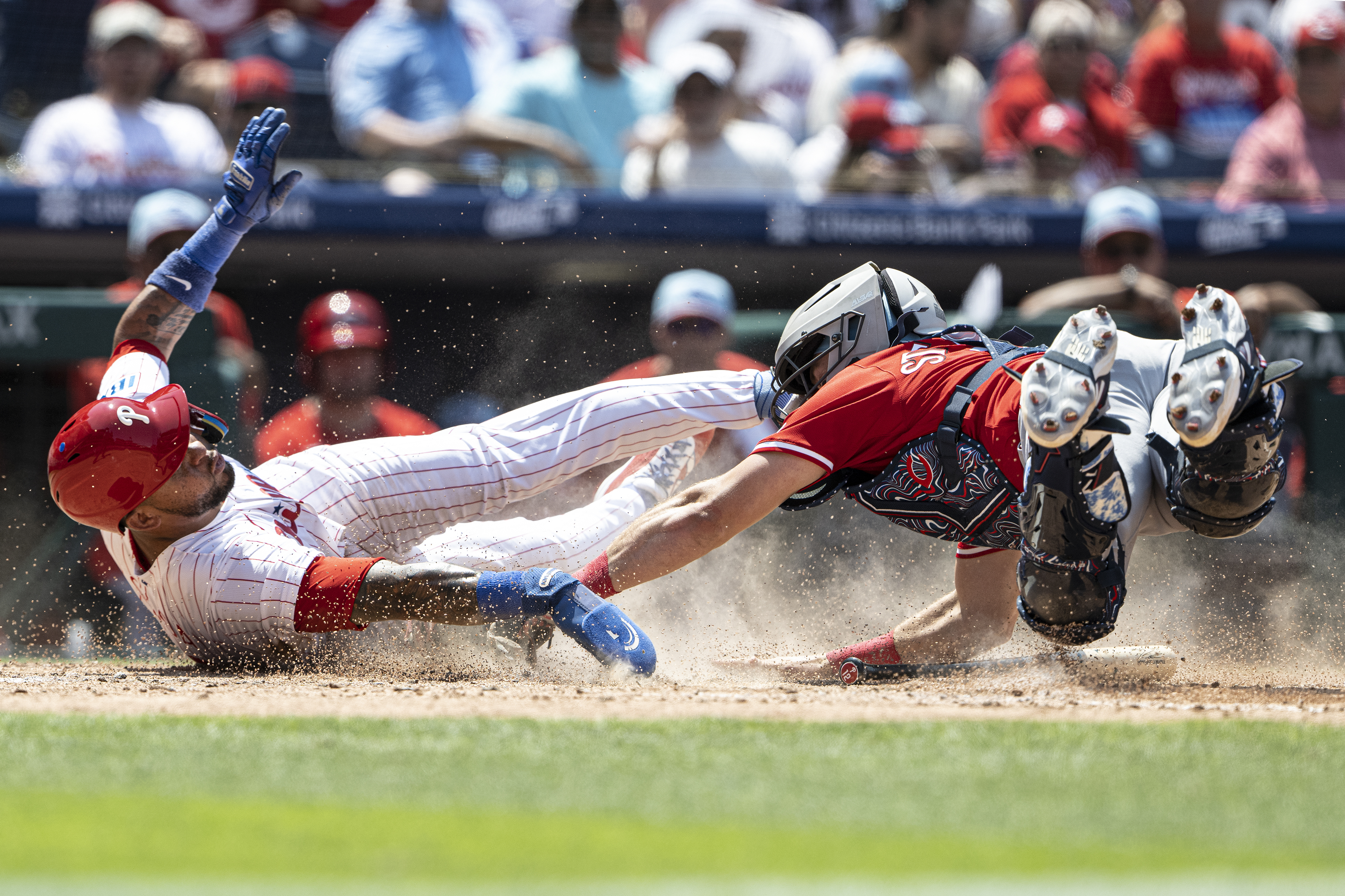 Edmundo Sosa of the Phillies is tagged out at the plate by Reds catcher Tyler Stephenson during the fourth inning on July 4. Baseball’s greatest entrance: Newly acquired closer Jhoan Duran making his Phillies debut to finish off the Detroit Tigers at Citizens Bank Park on Aug. 1.