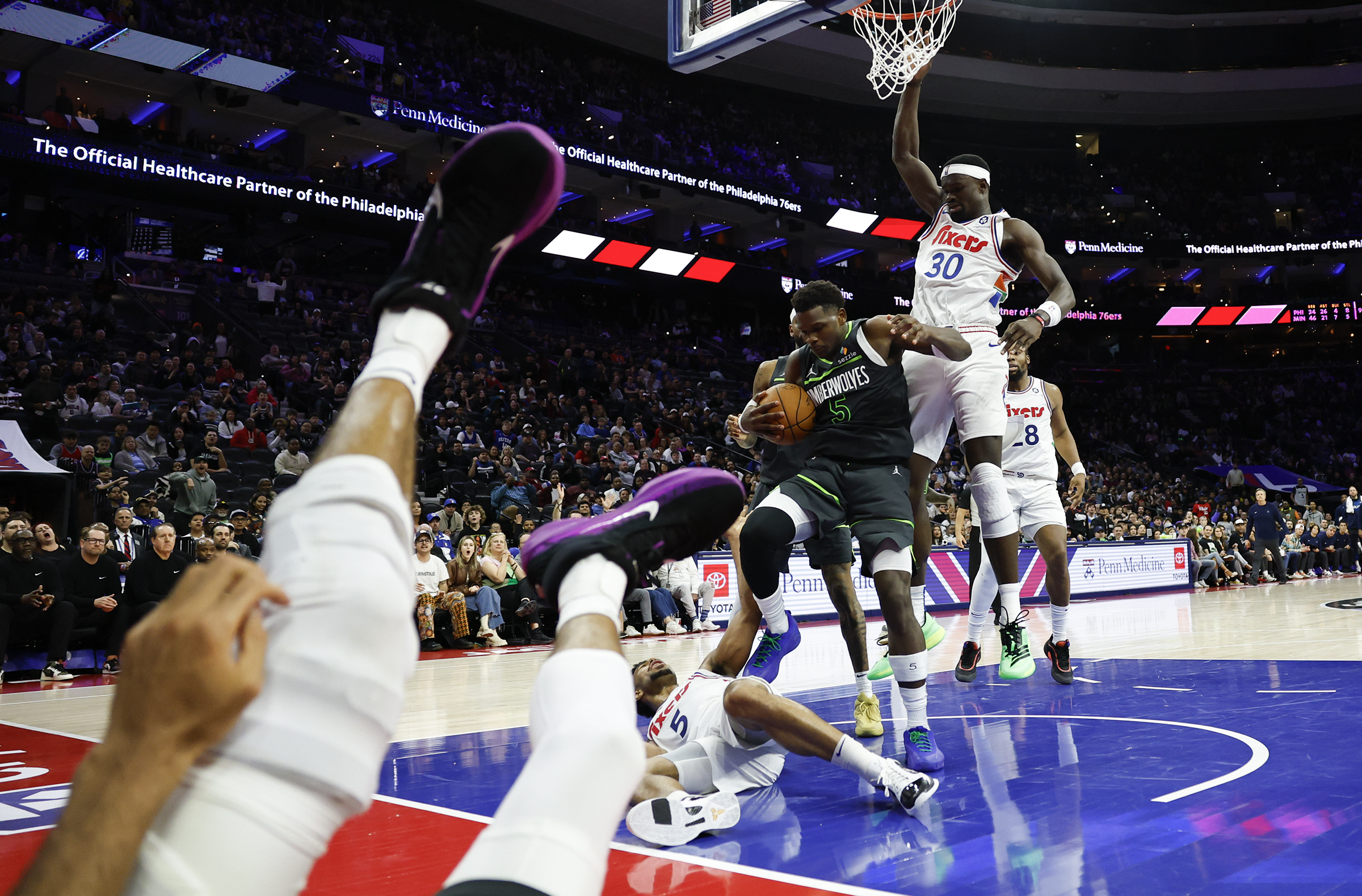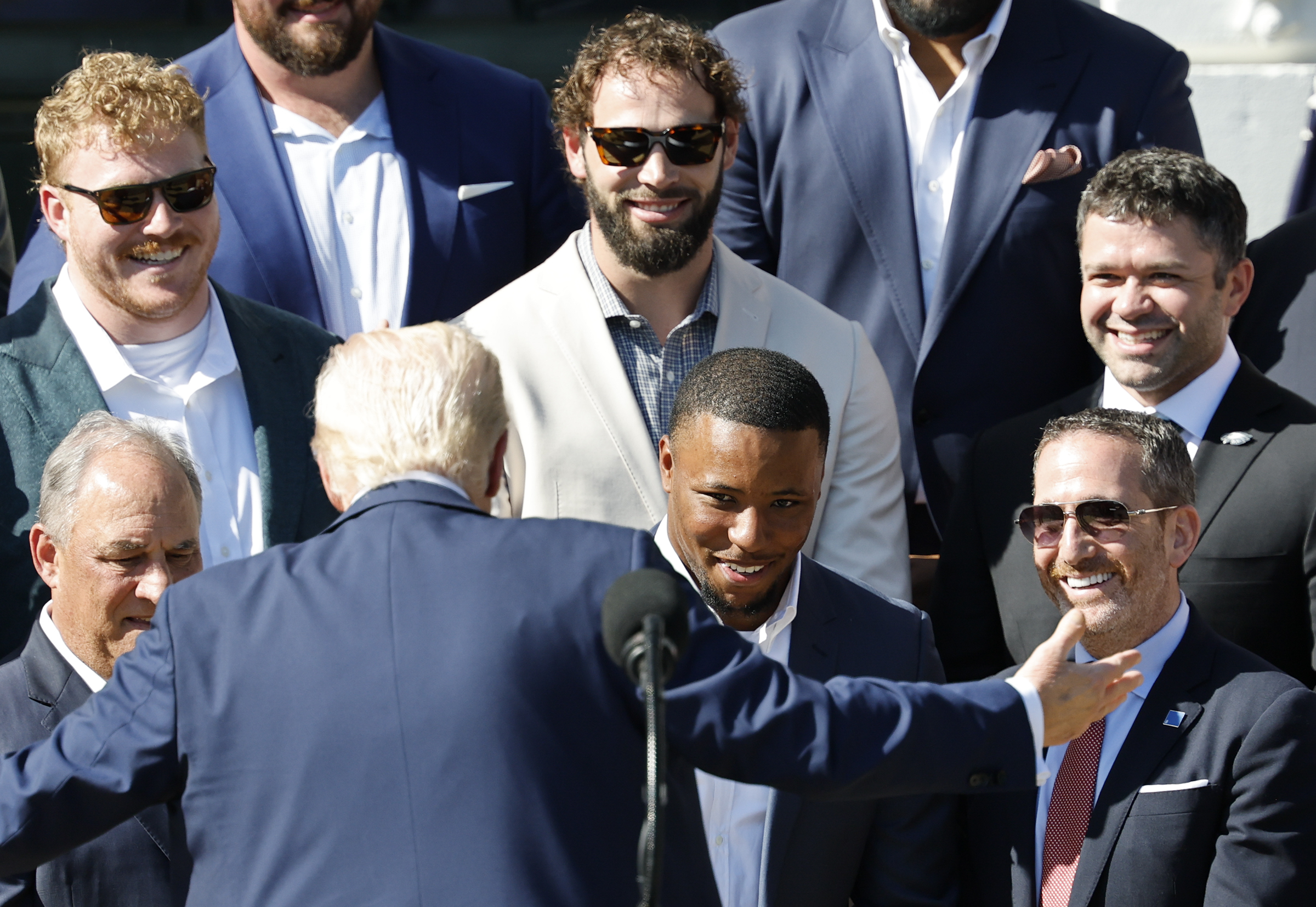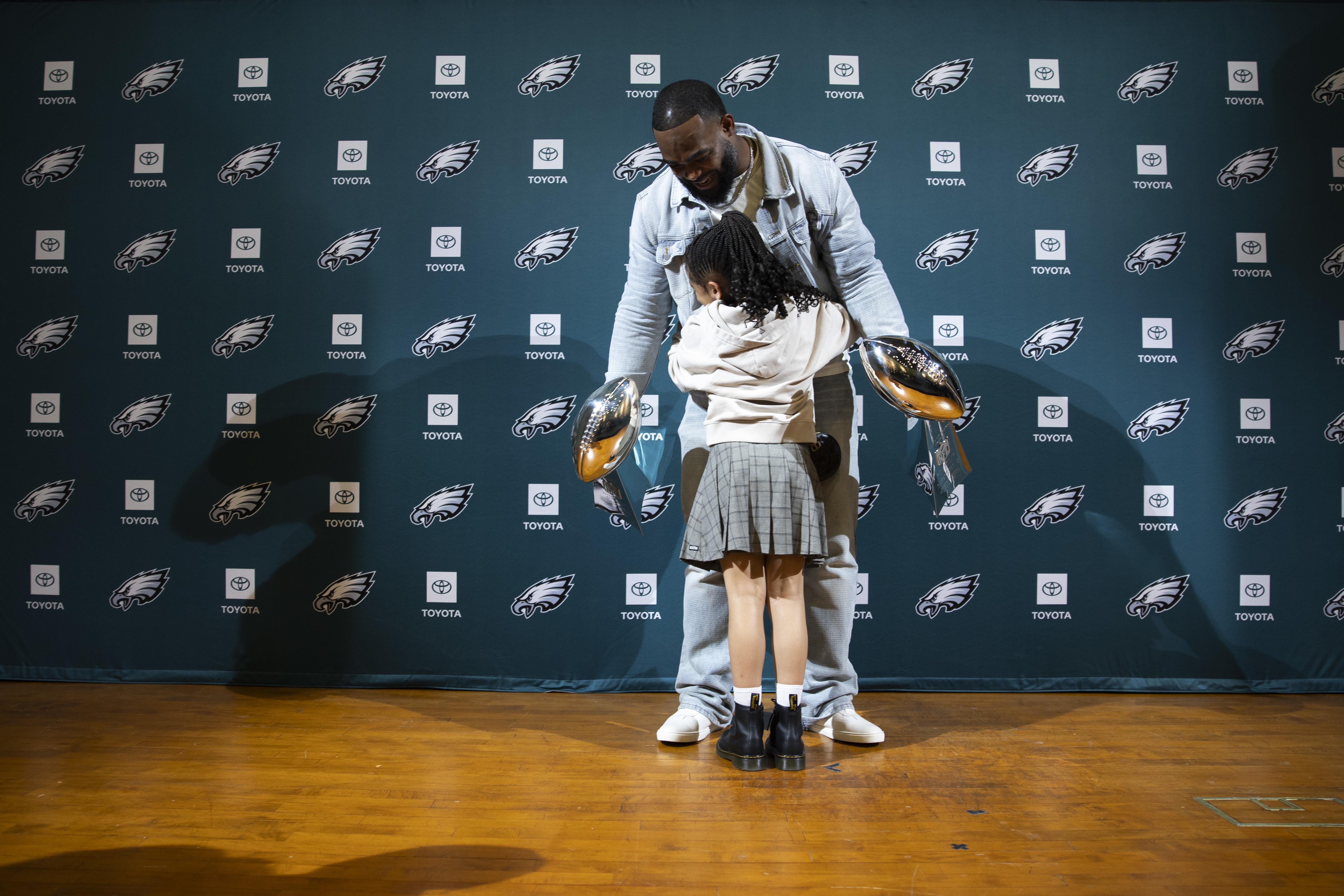 Brandon Graham hugs his daughter Emerson after his retirement announcement at the NovaCare Complex on March 18. The Eagles defensive end unretired and is playing again this season. Oklahoma State heavyweight Wyatt Hendrickson celebrates after defeating Olympic gold medalist Gable Steveson of Minnesota during the NCAA wrestling championship at the Wells Fargo Center on March 22.Minnesota Timberwolves guard Anthony Edwards grabs a rebound between a fallen Quentin Grimes and Adem Bona of the Sixers on April 5. Eagles running back Saquon Barkley looks at President Donald J. Trump during the Super Bowl champions’ visit to the White House on April 28.